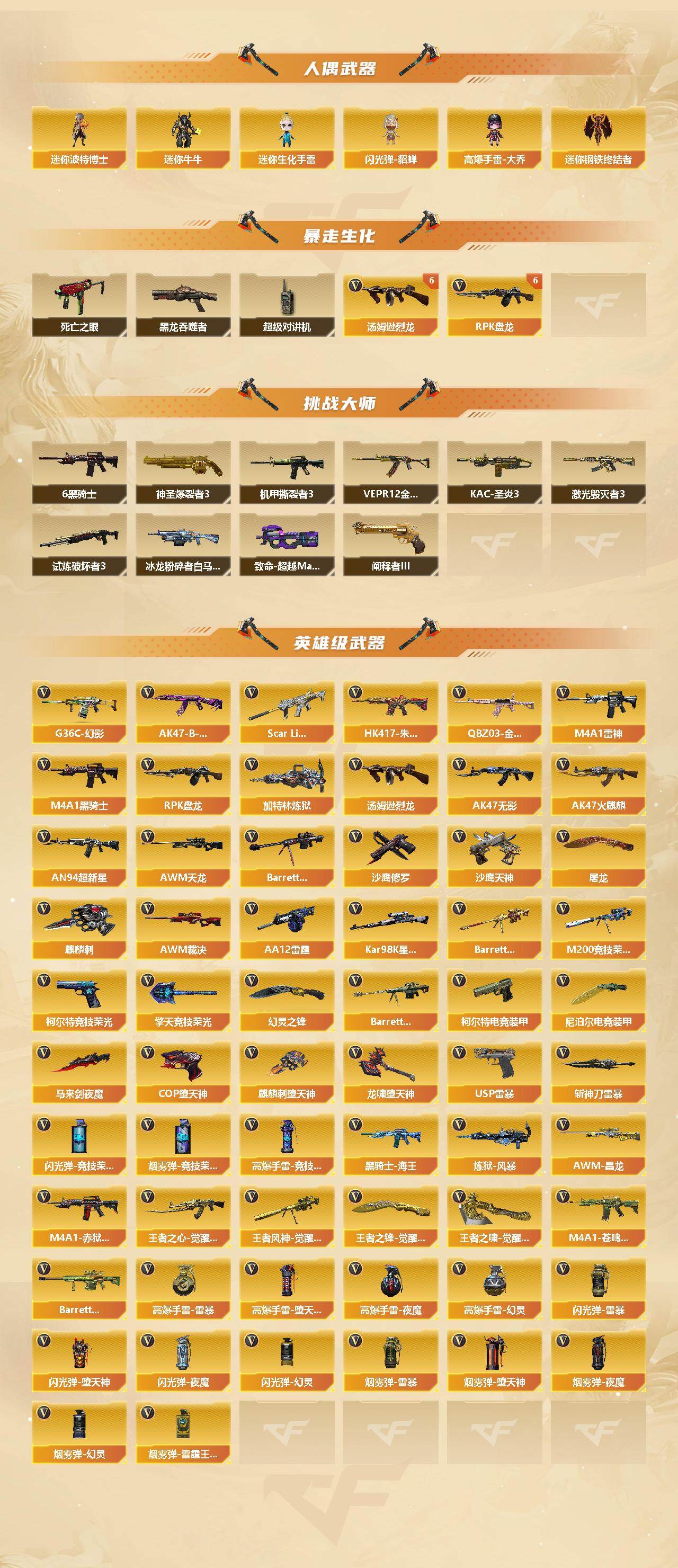 【英雄级武器】:AK47-火麒麟,M4A1-雷神,M4A1-黑骑士*6,AK47-无影,AN94-超新星*2,HK417-朱雀,Scar Light-白虎,G36C-幻影,QBZ03-金色蔷薇,王者之心-觉醒版,黑骑士-海王,AK47-B-常胜将军,AWM-天龙,Barrett-毁灭,AWM-裁决,Barrett-朱雀,Kar9