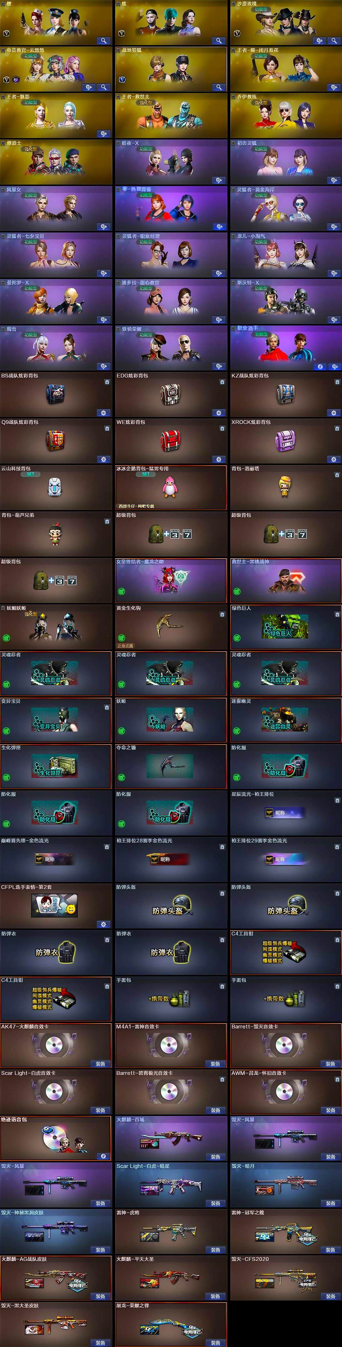 【皮肤】:Scar Light-白虎-暗星,雷神-虎将,雷神-冠军之魄,火麒麟-AG战队皮肤,火麒麟-平天大圣,火麒麟-百城,毁灭-暗月,毁灭-CFS2020,毁灭-黑大圣皮肤,毁灭-风暴*2,毁灭-神秘黑洞皮肤,AK47-B-常胜将军-刘备,屠龙-荣耀之锋