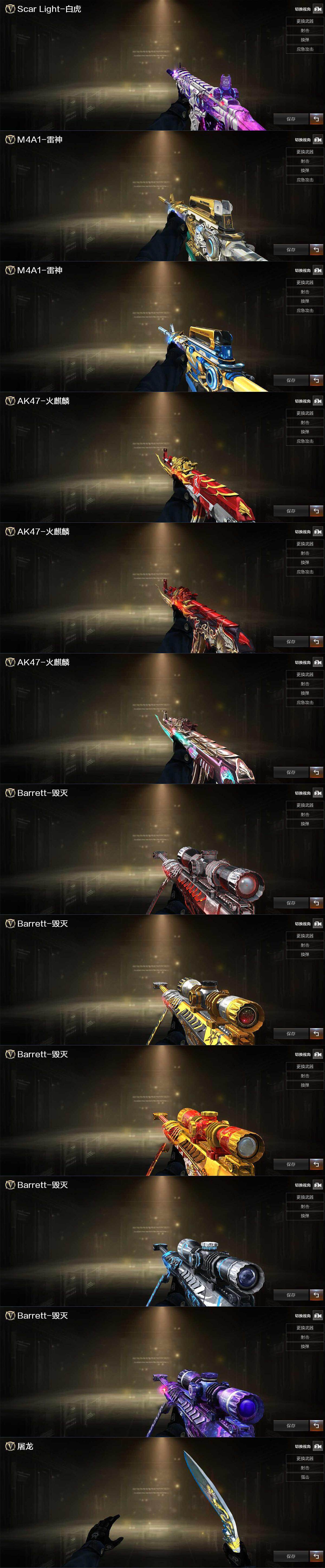 【热门武器】:传说暗裔,传说圣灵,G36C-幻影,QBZ03-金色蔷薇,Scar Light-白虎,HK417-朱雀,M200-竞技荣光,死亡之眼,Kar98K-星神,M4A1-黑骑士*6,汤姆逊-烈龙*7,RPK-盘龙*6,加特林-炼狱,斯泰尔-蝴蝶,USP-雷暴,COP-堕天神,沙鹰-修罗*3,黄金猫猫手套-白鲨