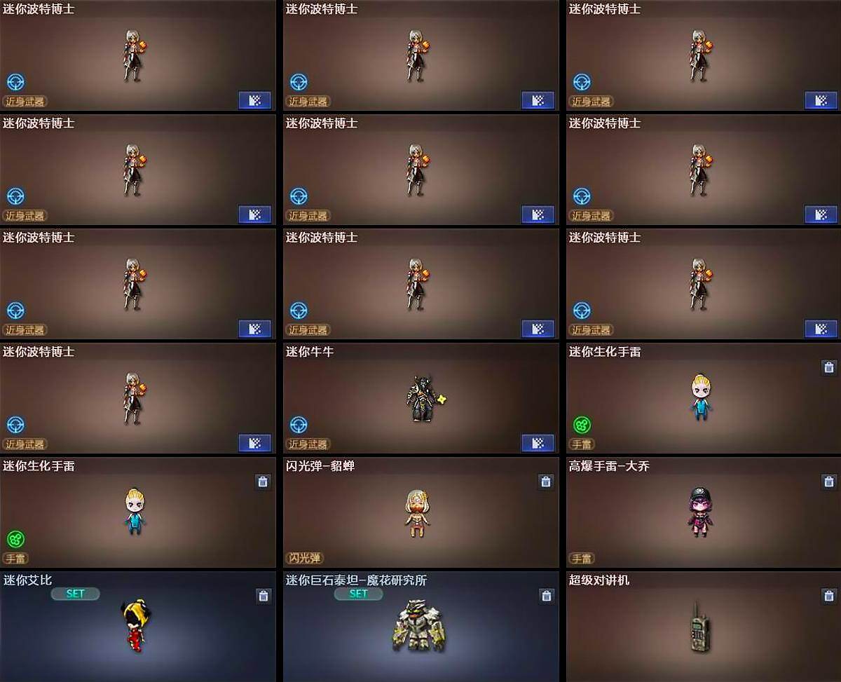 【人偶武器】:火麒麟-灵狐,迷你钢铁终结者,斯泰尔-蝴蝶,COP-旗袍,迷你裂空之翼*3,迷你波特博士*13,迷你牛牛,迷你生化手雷*2,闪光弹-貂蝉,高爆手雷-大乔,迷你艾比,迷你巨石泰坦-魔花研究所