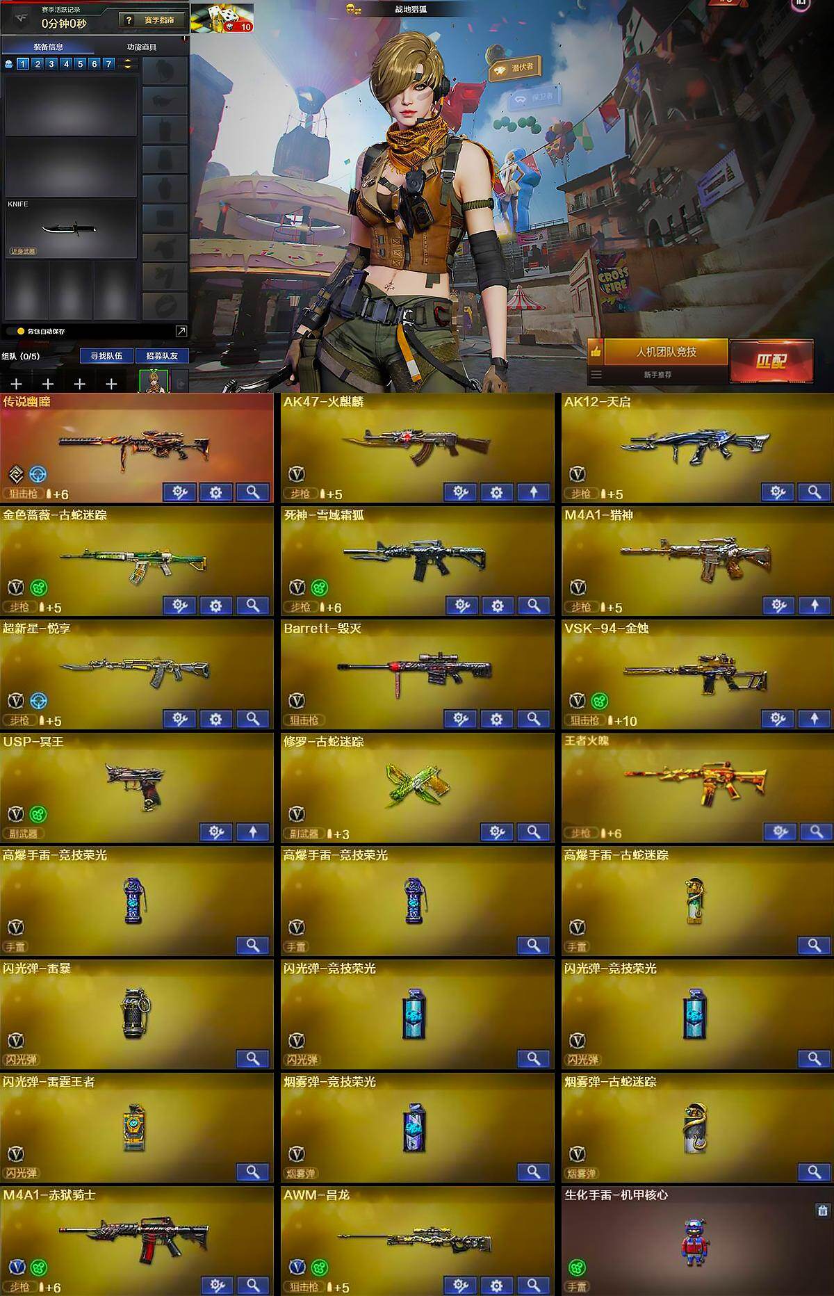 【英雄级武器】:AK47-火麒麟,AK12-天启,金色蔷薇-古蛇迷踪,死神-雪域霜狐,M4A1-猎神,超新星-悦享-觉醒版,Barrett-毁灭,VSK-94-金蚀,USP-冥王,修罗-古蛇迷踪,高爆手雷-竞技荣光*2,高爆手雷-古蛇迷踪,闪光弹-雷暴,闪光弹-竞技荣光*2,闪光弹-雷霆王者-觉醒版,烟雾弹-竞技荣光,烟雾弹-古蛇迷踪,M4A1-赤狱骑士,AWM-昌龙