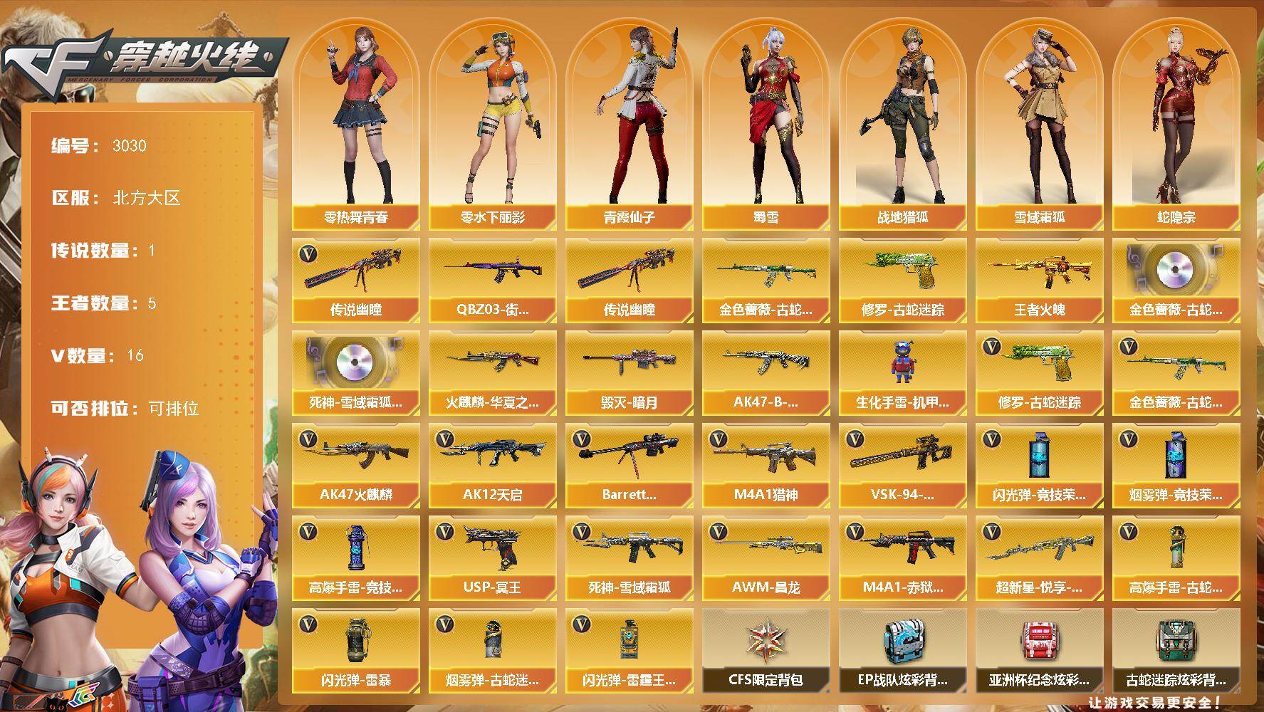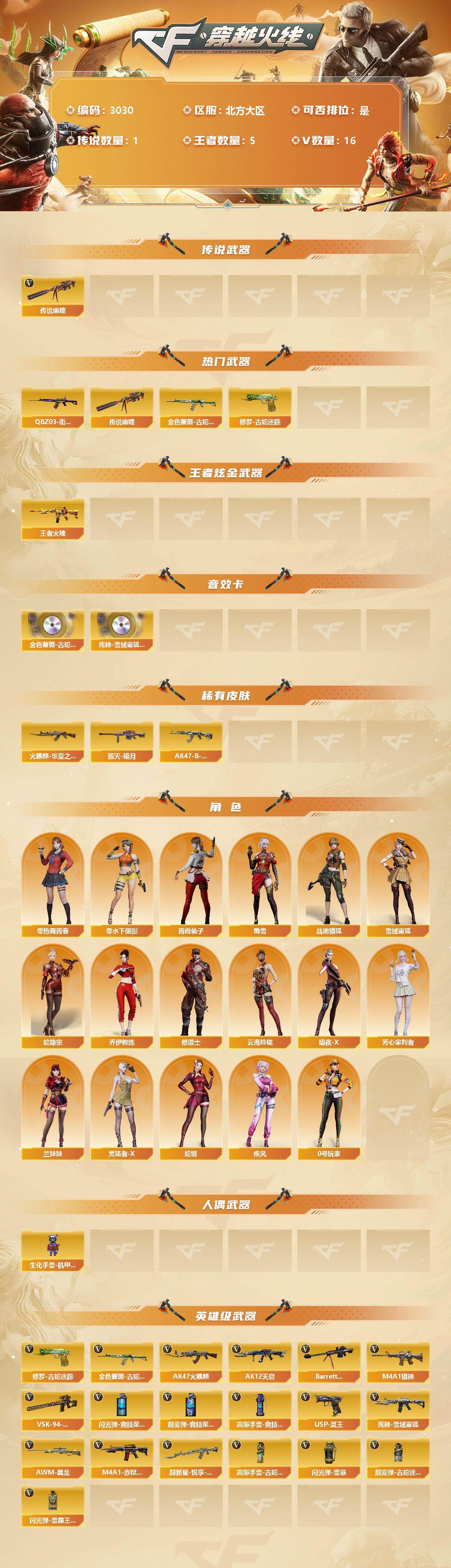 [14217541]北方大区-16V-5王者-0炫金 【传说武器】:传说幽瞳 【热门武器】:传说幽瞳,金色蔷薇-古蛇迷踪,修罗-古蛇迷踪,QBZ03-街机 【王者炫金武器】:王者火魄 【音效卡】:QBZ03-金色蔷薇-古蛇迷踪音效卡,死神-雪域霜狐-怀旧音效卡 【皮肤】:火麒麟-华夏之心,毁灭-暗月,AK47-B-常胜将军-刘备 【角色】:战地猎狐,雪域霜狐,蛇隐宗,乔伊教练,修道士,云海玲珑,暗夜-X,芳心审判者,疾风,兰妹妹,0号玩家,零-热舞青春,零-水下丽影,灵狐者-X,青霞仙子,蛇姬,蜀雪 【人偶武器】:生化手雷-机甲核心 【英雄级武器】:AK47-火麒麟,AK12-天启,金色蔷薇-古蛇迷踪,死神-雪域霜狐,M4A1-猎神,超新星-悦享-觉醒版,Barrett-毁灭,VSK-94-金蚀,USP-冥王,修罗-古蛇迷踪,高爆手雷-竞技荣光*2,高爆手雷-古蛇迷踪,闪光弹-雷暴,闪光弹-竞技荣光*2,闪光弹-雷霆王者-觉醒版,烟雾弹-竞技荣光,烟雾弹-古蛇迷踪,M4A1-赤狱骑士,AWM-昌龙 【道具】:CFS限定背包,EP战队炫彩背包,亚洲杯纪念炫彩背包,古蛇迷踪炫彩背包,炫彩背包-诺拉,超级背包,雪域霜狐炫彩背包,女皇终结者-魔龙之吻,救世主-黑桃战神,绿色巨人,灵魂忍者,变异宝贝,迷雾幽灵,夺命之镰,防化服*3,巅峰赛先锋-金色流光,流光-鎏金之域,枪王排位28赛季金色流光,枪王排位29赛季金色流光,语音特效-怀旧,古蛇迷踪打击特效,雪域霜狐表情,蛇隐宗表情,炽雪表情,EP战队名片,EP战队喷图,C4-再燃火线,防弹头盔*4,防弹衣*4,C4工具钳*4,手雷包*4 【特殊枪械】: