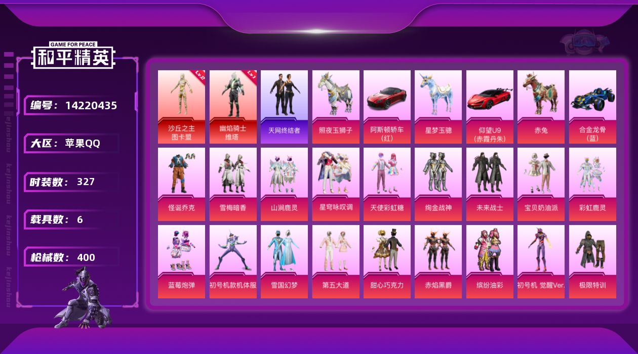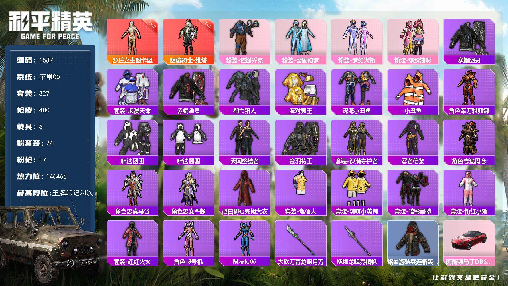 [14220435]苹果 手Q-2神装-24粉装-17特效枪-6载具-5粉色飞行器-146466热力值-24王牌印记-327套装-400枪皮