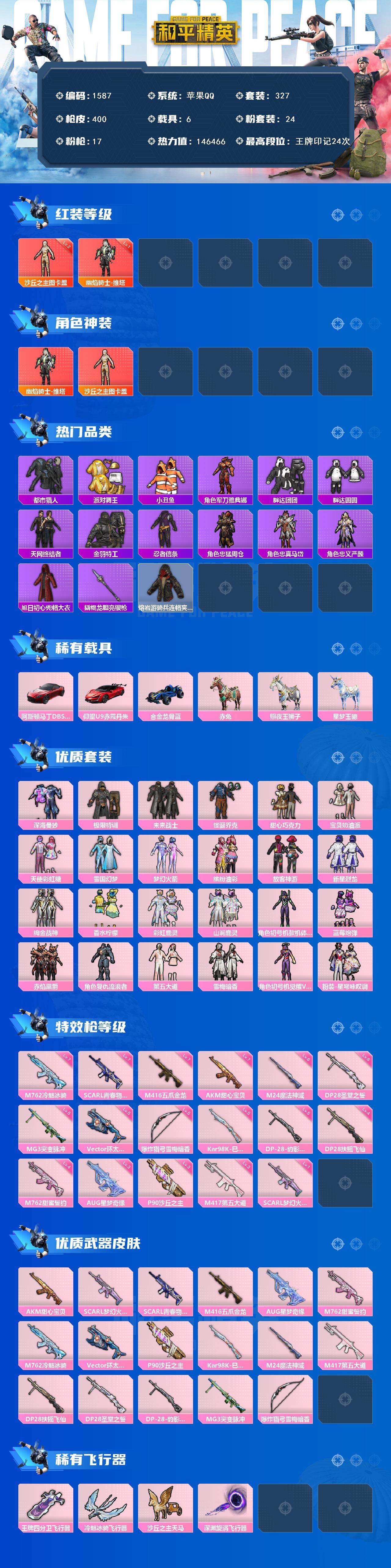 [14220435]苹果 手Q-2神装-24粉装-17特效枪-6载具-5粉色飞行器-146466热力值-24王牌印记-327套装-400枪皮 【红色神装等级】:幽焰骑士-维塔(一级),沙丘之主-图卡盟(二级) 【红色角色神装】:幽焰骑士-维塔,沙丘之主-图卡盟 【热门品类】:粉装-怪诞乔克,粉装-雪国幻梦,粉装-梦幻火箭,粉装-缤纷油彩,套装-寒蝎幽灵,套装-浪漫天命,套装-赤蝎幽灵,套装-都市猎人,套装-派对舞王,套装-深海小丑鱼,套装-小丑鱼,角色-军刀雅典娜,套装-胖达团团,套装-胖达圆圆,套装-天网终结者,套装-金羽特工,套装-沙漠守护者,套装-忍者信条,角色-忠猛周仓,角色-忠真马岱,角色-忠义严颜,旭日初心兜帽大衣,套装-龟仙人,套装-潮萌小黄鸭,套装-暗影哥特,套装-粉红小猪,套装-红红火火,角色-8号机,角色-Mark.06,大砍刀-青龙偃月刀,撬棍-龙胆亮银枪,熔岩游骑兵连帽夹克 【粉色载具】:阿斯顿马丁DBS(红),仰望U9(赤霞丹朱),合金龙骨(蓝),赤兔,照夜玉狮子,星梦玉骢 【粉色套装】:粉装-深海曼妙,粉装-极限特训,粉装-未来战士,粉装-怪诞乔克,粉装-甜心巧克力,粉装-宝贝奶油派,粉装-天使彩虹糖,粉装-雪国幻梦,粉装-梦幻火箭,粉装-缤纷油彩,粉装-放客神游,粉装-新星烈龙,粉装-绚金战神,粉装-香水柠檬,粉装-彩虹鹿灵,粉装-山涧鹿灵,角色-初号机款机体服,粉装-蓝莓炮弹,粉装-赤焰黑爵,角色-复仇流浪者,粉装-第五大道,粉装-雪梅暗香,角色-初号机 觉醒Ver.,粉装-星穹咏叹调 【粉色枪皮等级】:AKM-甜心宝贝(七级),SCAR-L-梦幻火箭(一级),SCAR-L-青春物语(七级),M416-五爪金龙(七级),AUG-星梦奇缘(三级),M762-甜蜜誓约(四级),M762-冷魅冰骑(七级),Vector-环太平洋(五级),P90-沙丘之主(三级),Kar98K-巳巳如意(五级),M24-魔法神域(六级),M417-第五大道(三级),DP-28-扶摇飞仙(四级),DP-28-圣堂之誓(六级),DP-28-豹影疾电(五级),MG3-突变脉冲(五级),爆炸猎弓-雪梅暗香(五级) 【粉色枪皮】:AKM-甜心宝贝,SCAR-L-梦幻火箭,SCAR-L-青春物语,M416-五爪金龙,AUG-星梦奇缘,M762-甜蜜誓约,M762-冷魅冰骑,Vector-