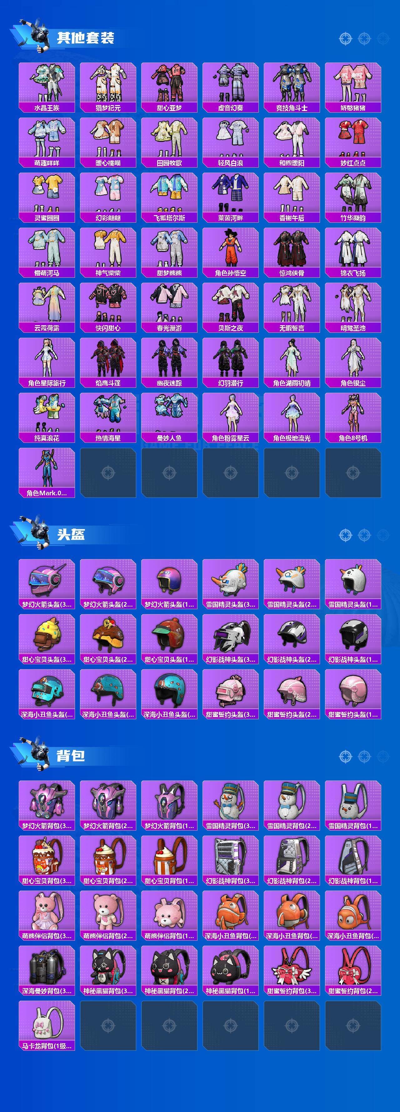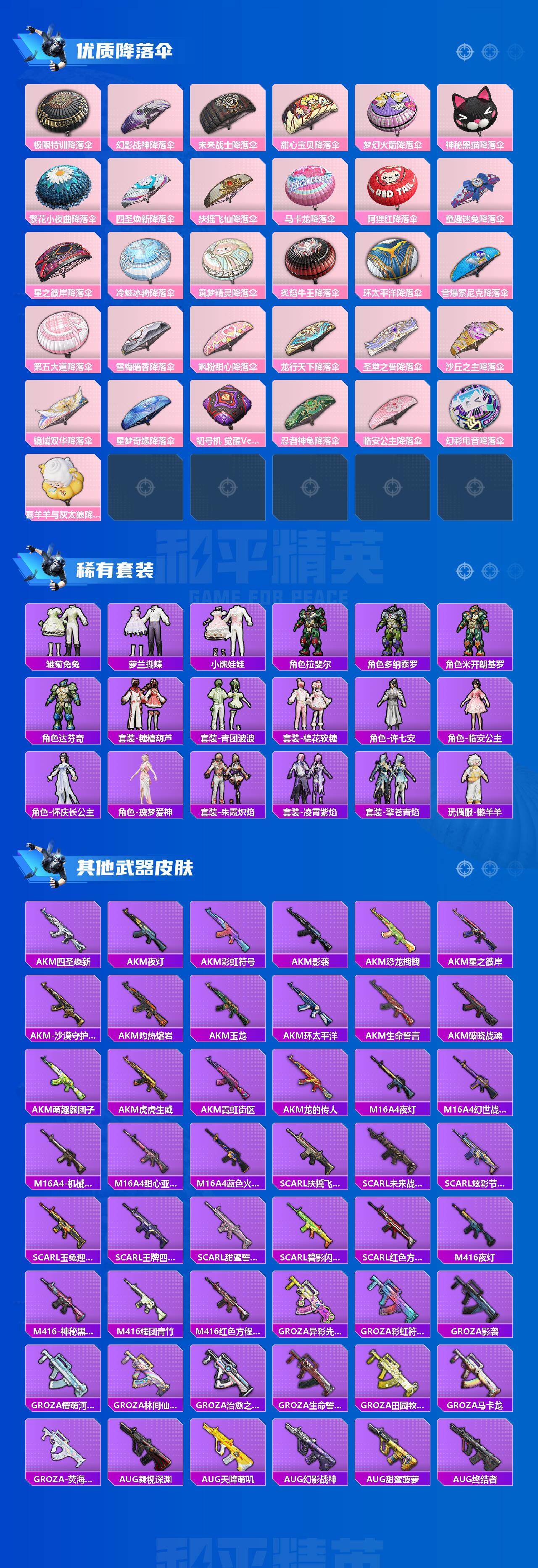 - [15611605]身法素材号【特价急出/详情看图】有二次-苹果-2红装-15粉装-10特效枪-9载具-8.9w热力值-10印记-164套装-220枪皮 【红色神装等级】:辉羽雀灵-初翊(一级),圣域龙灵-瑞拉(二级) 【热门品类】:粉装-梦幻火箭,粉装-缤纷油彩,套装-冥河战士,角色-六号稻草人,小恶魔头饰 【粉色载具】:兰博基尼Estoque(银翼灰),阿斯顿马丁DBS(红),玛莎拉蒂Grecale(薄荷绿),宝马M4(圣保罗黄),迈凯伦塞纳(冷萃蓝),炽龙极锋(暗夜黑),虚妄之影(炫耀紫),合金龙骨(蓝),辉羽雀灵自行车 【粉色套装】:粉装-梦幻火箭,粉装-缤纷油彩,粉装-银刃赛罗,粉装-吟月归客,粉装-赤焰黑爵,粉装-紫电风暴,粉装-第五大道,粉装-萌物绒绒,粉装-傲傲奶龙,角色-智耀战神,粉装-绯果甜心,角色-幻海仙踪,粉装-星穹咏叹调,角色-狂魅哈莉,角色-罗征 【粉色枪皮等级】:AKM-炫紫旋律(四级),M416-五爪金龙(七级),M416-风花雪月(三级),AKS-74U-星穹咏叹调(四级),Kar98K-巳巳如意(一级),Kar98K-圣域龙灵(一级),AMR-智耀战神(五级),MK12-雪月幻音(一级),DP-28-豹影疾电(五级),MG3-辉羽雀灵(三级) 【粉色枪皮】:AKM-炫紫旋律,M416-五爪金龙,M416-风花雪月,AKS-74U-星穹咏叹调,Kar98K-巳巳如意,Kar98K-圣域龙灵,AMR-智耀战神,MK12-雪月幻音,DP-28-豹影疾电,MG3-辉羽雀灵 【粉色飞行器】:梦幻火箭飞行器,圣域金龙飞行器,绯果甜心飞行器,雀灵庇佑飞行器 【粉色降落伞】:梦幻火箭降落伞,四圣焕新降落伞,心之恋语降落伞,荧光虫舞降落伞,冷魅冰骑降落伞,甜梦小狐降落伞,桃粉嫣然降落伞,雪月幻音降落伞,圣域龙灵降落伞,智耀战神降落伞,绯果甜心降落伞,幻海仙踪降落伞,星穹咏叹调降落伞,辉羽雀灵降落伞,幻彩电音降落伞,双重狂想降落伞,喜羊羊与灰太狼降落伞 【稀有套装】:套装-圣穹绘梦,套装-燕燕于飞,套装-鱼渊荷华,套装-萌萌史莱姆,角色-冷霜之星,套装-粉恋花,套装-紫幽梦,套装-蓝冰羽,角色-六号稻草人,套装-果冻柠檬,角色-幽澜祭司,角色-鲛海歌灵,套装-星影赞美诗,套装-星渊小夜曲,套装-云朵鹅,套装-雪绒豹,套装-诡诞巡游,套装-混沌火种,套装-蜜露汐语 【稀