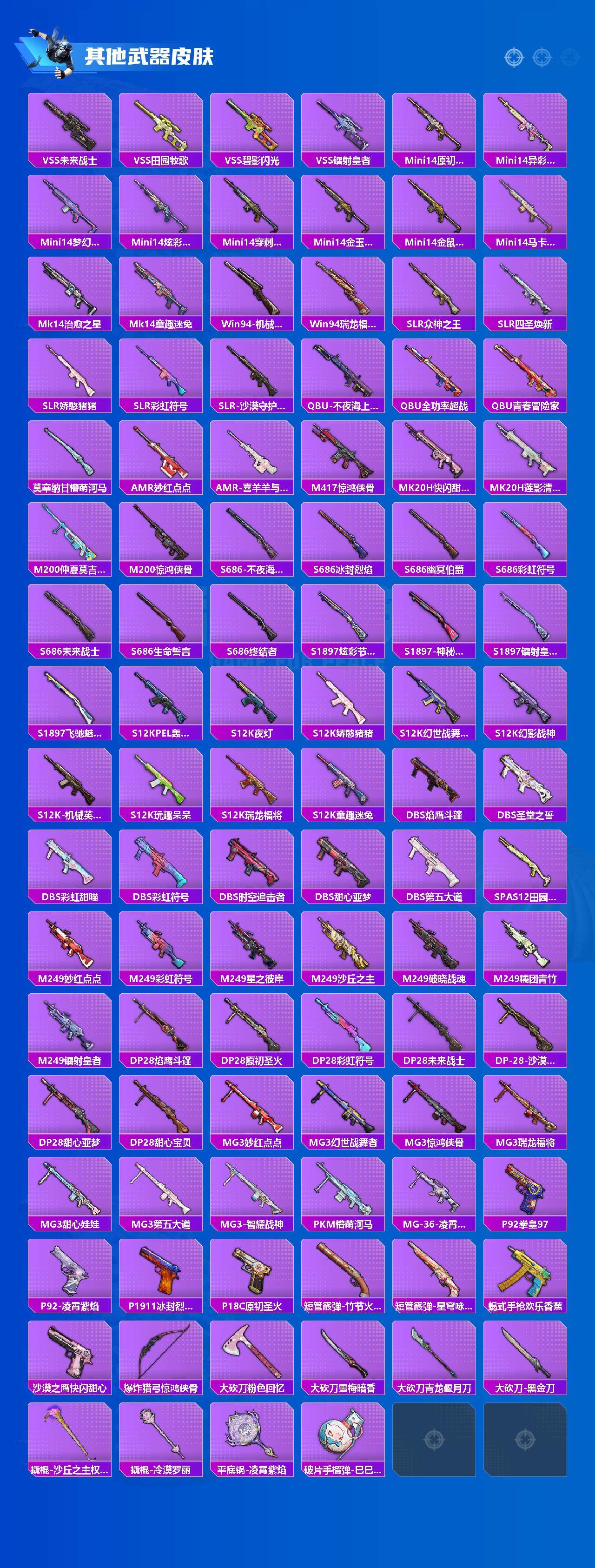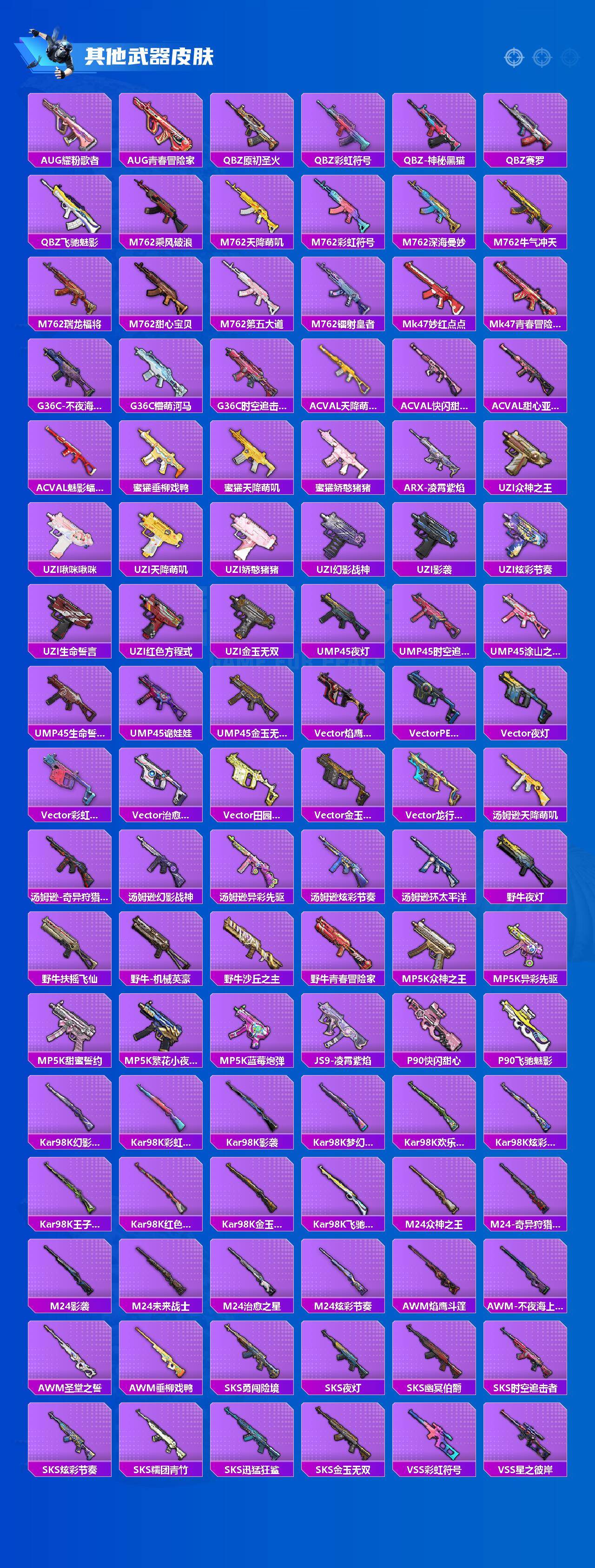 AKM-甜心宝贝,SCAR-L-梦幻火箭,SCAR-L-青春物语,M416-五爪金龙,AUG-星梦奇缘,M762-甜蜜誓约,M762-冷魅冰骑,Vector-环太平洋,P90-沙丘之主,Kar98K-巳巳如意,M24-魔法神域,M417-第五大道,DP-28-扶摇飞仙,DP-28-圣堂之誓,MG3-突变脉冲,爆炸猎弓-雪梅暗香