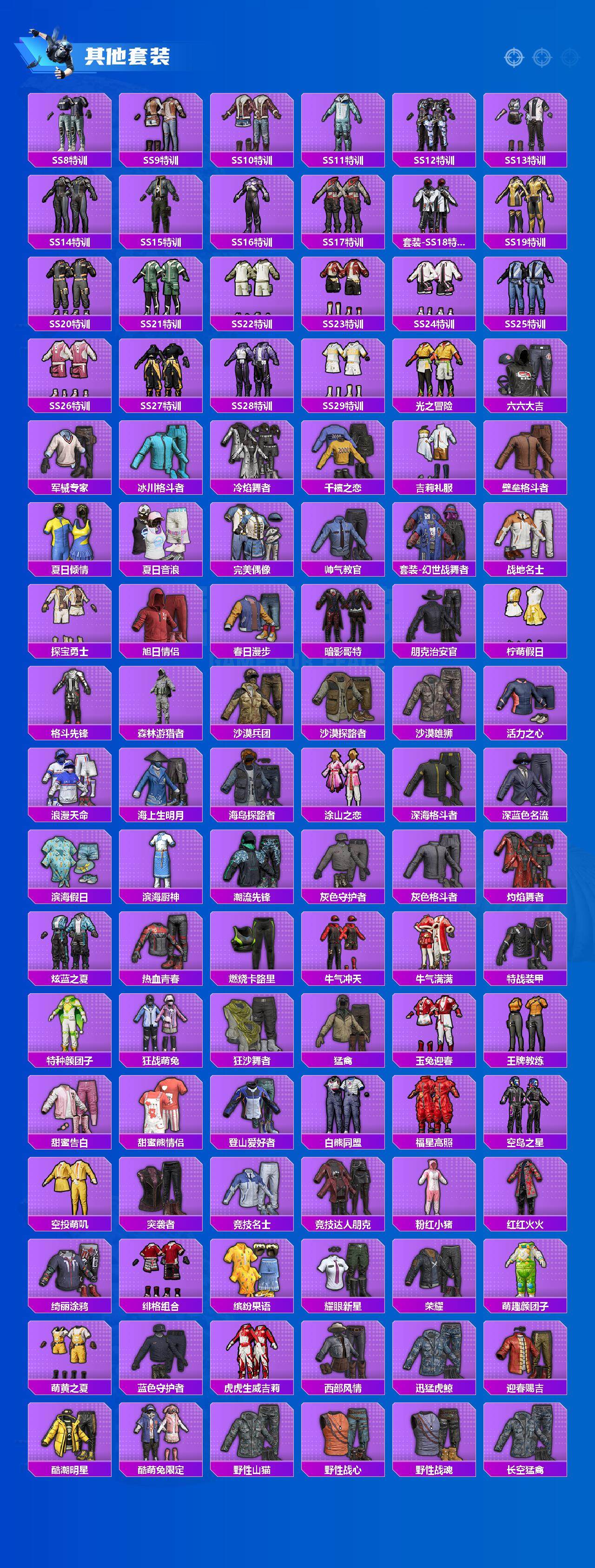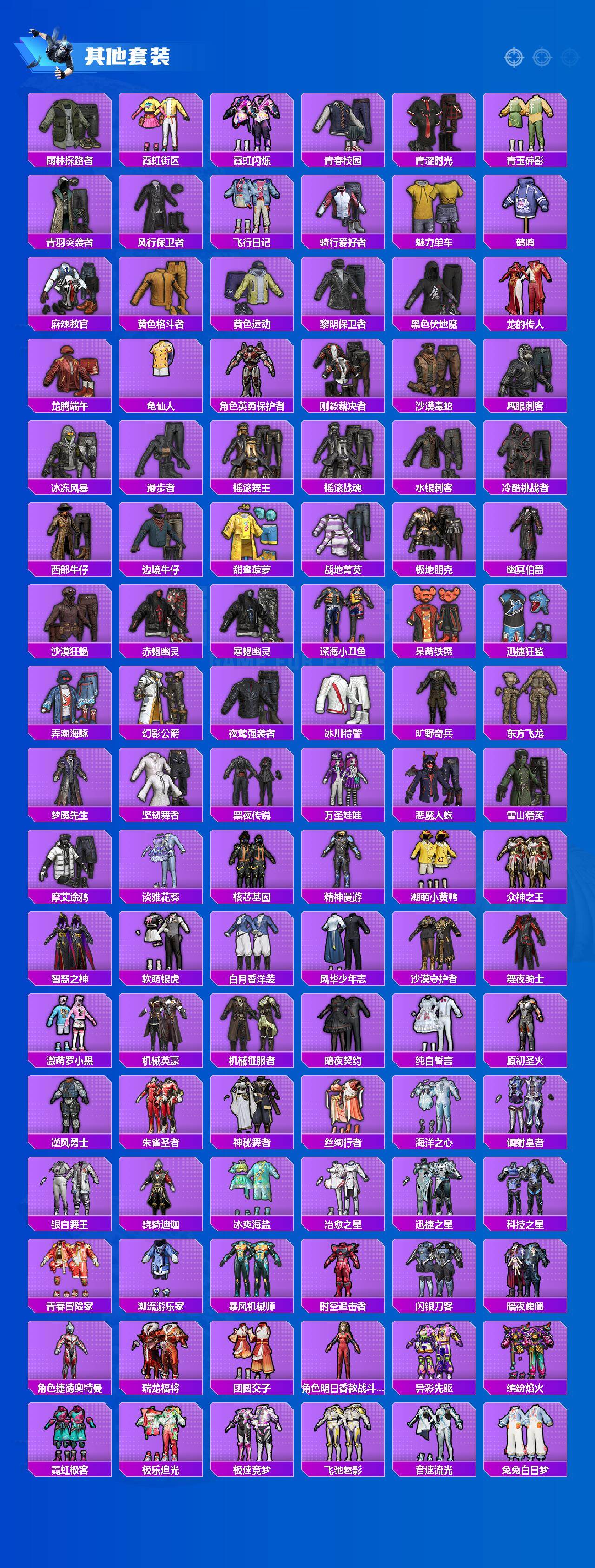 套装-浪漫天命,角色-军刀雅典娜,套装-金羽特工,忍者信条套装,套装-龟仙人,套装-暗影哥特,套装-粉红小猪,角色-8号机,角色-Mark.06,套装-狂沙舞者,角色-英勇保护者,套装-漫步者,套装-水银刺客,套装-西部牛仔,套装-幽冥伯爵,套装-弄潮海豚,套装-恶魔人蛛,套装-雪山精英,白月香洋装套装,风华少年志套装,套装-机械英豪,套装-暗夜契约,套装-纯白誓言,套装-朱雀圣者,海洋之心套装,套装-冰爽海盐,套装-瑞龙福将,套装-团圆交子