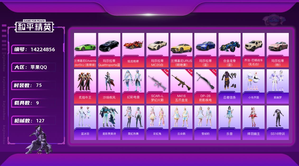 [14224856]苹果 手Q-4粉装-3特效枪-9载具-1粉色飞行器-45993热力值-10王牌印记-75套装-127枪皮 【热门品类】:粉装-梦幻火箭,套装-忍者信条 【粉色载具】:兰博基尼Aventador SVJ(翡翠绿),兰博基尼URUS(明艳黄),玛莎拉蒂MC20(星石白),玛莎拉蒂Quattroporte(夜幕蓝),玛莎拉蒂Ghibli(粉),玛莎拉蒂Ghibli(蓝),乔治巴顿战车(乳石白),合金龙骨(蓝),焰龙咆哮 【粉色套装】:粉装-梦幻火箭,粉装-沙场疾风,粉装-炙焰牛王,粉装-幻彩电音 【粉色枪皮等级】:SCAR-L-梦幻火箭(六级),M416-五爪金龙(六级),DP-28-豹影疾电(一级) 【粉色枪皮】:SCAR-L-梦幻火箭,M416-五爪金龙,DP-28-豹影疾电 【粉色飞行器】:梦幻火箭飞行器 【粉色降落伞】:至尊龙雀降落伞,梦幻火箭降落伞,洛神天依降落伞,暗星紫秘降落伞,恐龙拽拽降落伞,筑梦精灵降落伞,智耀战神降落伞 【稀有套装】:套装-小鸟芋圆,套装-紫幽梦,套装-蓝冰羽,套装-星影赞美诗,套装-霓虹热舞,套装-彩虹兔,套装-云朵鹅,套装-雪绒豹,角色-乐音,角色-绛羽幽主 【稀有枪皮】:AKM-灼热熔岩,AKM-破晓战魂,AKM-虎虎生威,AKM-霓虹街区,M16A4-甜心亚梦,M16A4-蓝色火焰,SCAR-L-玉兔迎春,SCAR-L-黄金龙骨,M416-红色方程式,M416-葫芦兄弟,GROZA-异彩先驱,GROZA-田园牧歌,AUG-纯梦嫁纱,AUG-耀粉歌者,QBZ-洛神天依,QBZ-飞驰魅影,M762-天降萌叽,M762-橘柚倾心,M762-瑞龙福将,M762-风花雪月,M762-云朵鹅,Mk47-妙红点点,Mk47-洛神天依,G36C-星穹咏叹调,AC-VAL-天降萌叽,AC-VAL-甜心亚梦,蜜獾-垂柳戏鸭,蜜獾-天降萌叽,蜜獾-娇憨猪猪,蜜獾-绯穹魔姬,UZI-天降萌叽,UZI-娇憨猪猪,UZI-红色方程式,UMP45-夜灯,UMP45-海渊国主,UMP45-蓝色火焰,Vector-生命誓言,Vector-田园牧歌,Vector-音爆索尼克,汤姆逊-幻影战神,汤姆逊-异彩先驱,汤姆逊-暗夜鎏金,汤姆逊-炫彩节奏,汤姆逊-耀粉歌者,野牛-夜灯,MP5K-异彩先驱,MP5K-蓝莓炮弹,AKS-74U-辉羽雀灵,P90-飞驰魅影,Kar