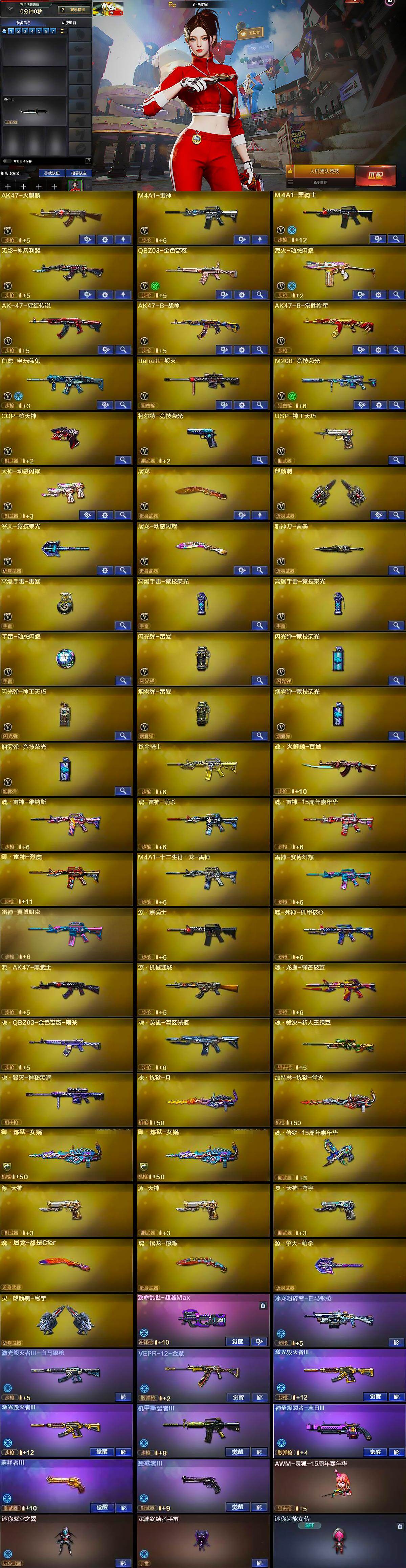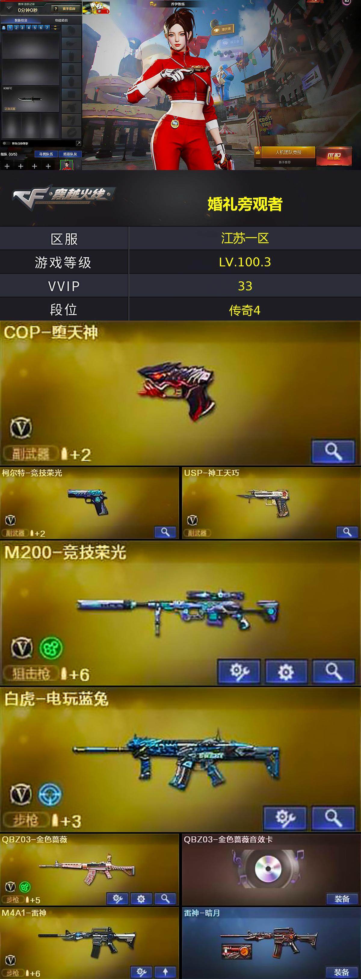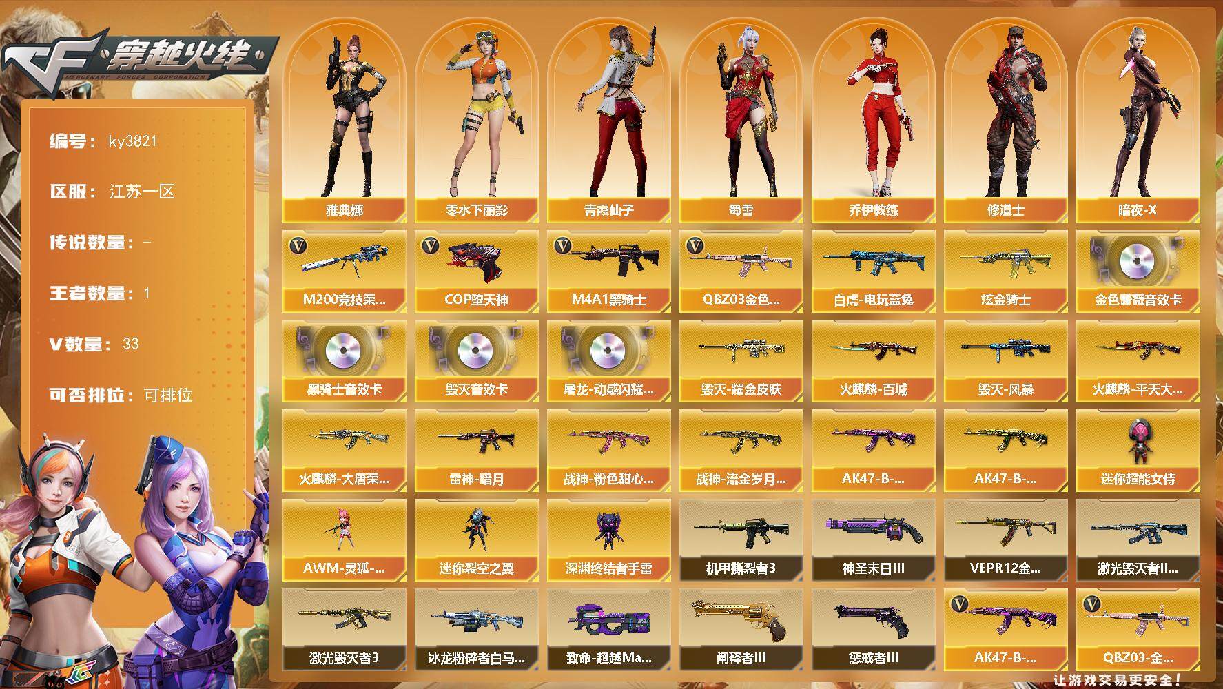 [14225668]江苏一区-33V-1王者-1炫金 【热门武器】:QBZ03-金色蔷薇,M200-竞技荣光,白虎-电玩蓝兔,M4A1-黑骑士,COP-堕天神 【王者炫金武器】:炫金骑士 【音效卡】:屠龙-动感闪耀 音效卡,M4A1-黑骑士音效卡,Barrett-毁灭音效卡,QBZ03-金色蔷薇音效卡 【皮肤】:雷神-暗月,火麒麟-平天大圣,火麒麟-百城,火麒麟-大唐荣光,毁灭耀金皮肤,毁灭-风暴,战神-粉色甜心皮肤,战神-流金岁月皮肤*2,AK47-B-常胜将军-曹操,AK47-B-常胜将军-孙权 【角色】:乔伊教练,修道士,暗夜-X,初恋灵狐,芳心审判者,风暴女,虎妞,嘉年华灵狐,娟娟,零-水下丽影,灵狐者-X,麻雀,曼陀罗-X,潘多拉-X,青霞仙子,斯沃特-X,蜀雪,新娜塔莎,雅典娜 【人偶武器】:AWM-灵狐-15周年嘉年华,迷你裂空之翼,深渊终结者手雷,迷你超能女侍 【挑战大师】:致命乱世-超越Max,冰龙粉碎者-白马银枪,激光毁灭者III-白马银枪,VEPR-12-金魔,激光毁灭者III*2,机甲撕裂者III,神圣爆裂者-末日III,阐释者III,惩戒者III 【英雄级武器】:AK47-火麒麟,M4A1-雷神,M4A1-黑骑士,无影-神兵利器,QBZ03-金色蔷薇,烈火-动感闪耀,AK-47-猩红传说,AK47-B-战神,AK47-B-常胜将军,白虎-电玩蓝兔,Barrett-毁灭,M200-竞技荣光,COP-堕天神,柯尔特-竞技荣光,USP-神工天巧,天神-动感闪耀,屠龙,麒麟刺,擎天-竞技荣光,屠龙-动感闪耀,斩神刀-雷暴,高爆手雷-雷暴,高爆手雷-竞技荣光*2,手雷-动感闪耀,闪光弹-雷暴,闪光弹-竞技荣光,闪光弹-神工天巧,烟雾弹-雷暴,烟雾弹-竞技荣光*2 【道具】:BS战队炫彩背包,炫彩背包,女皇终结者-魔龙之吻,救世主-黑桃战神,绿色巨人,灵魂忍者,迷雾幽灵,夺命之镰,防化服*3,金色流光-枪王排位*2,星辰流光-枪王排位,枪王排位28赛季金色流光,电玩兔兔表情,动感闪耀表情,EP战队名片,防弹头盔*6,防弹衣*5,C4工具钳*6,手雷包*4 【特殊枪械】:1黑骑士