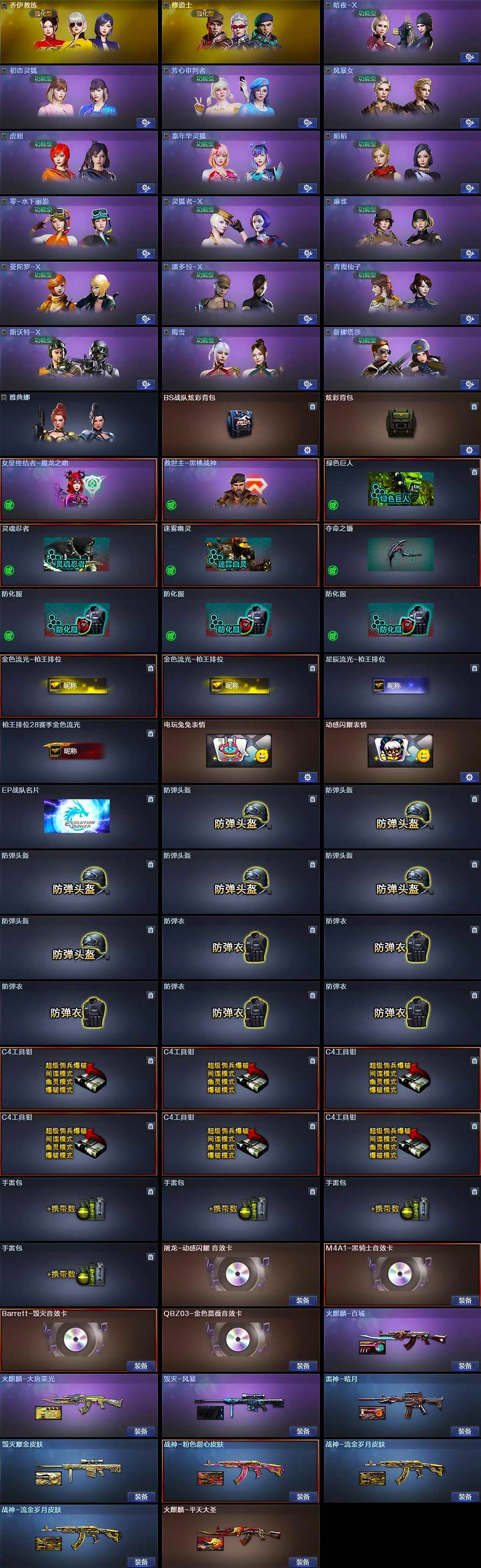 【道具】:BS战队炫彩背包,炫彩背包,女皇终结者-魔龙之吻,救世主-黑桃战神,绿色巨人,灵魂忍者,迷雾幽灵,夺命之镰,防化服*3,金色流光-枪王排位*2,星辰流光-枪王排位,枪王排位28赛季金色流光,电玩兔兔表情,动感闪耀表情,EP战队名片,防弹头盔*6,防弹衣*5,C4工具钳*6,手雷包*4