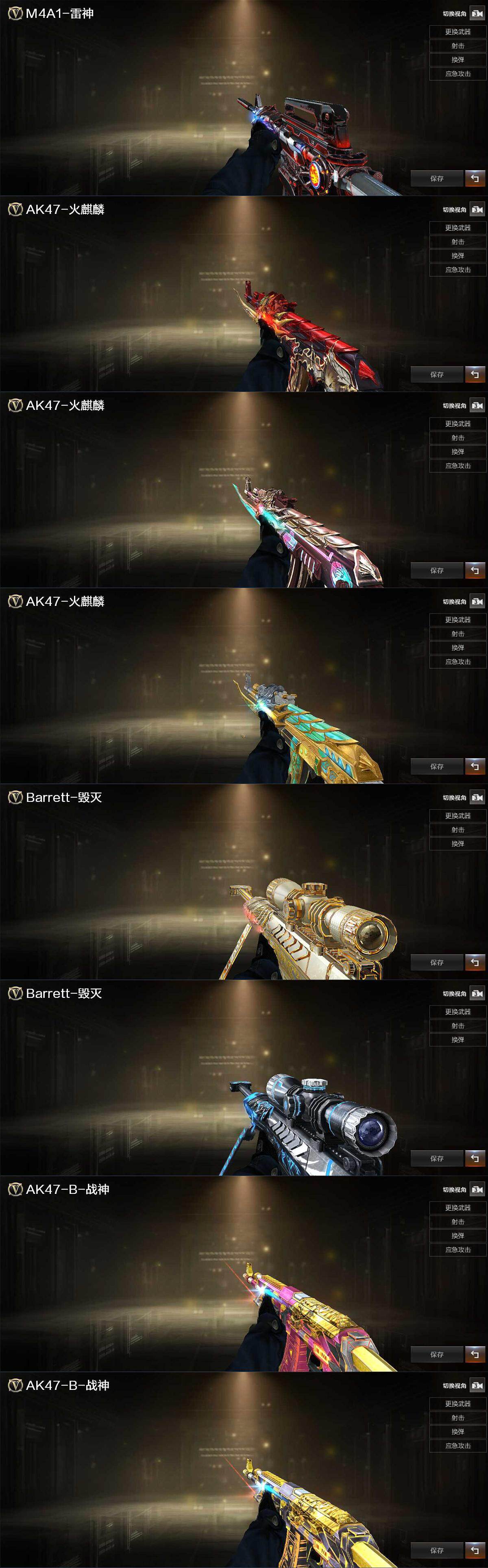 【英雄级武器】:AK47-火麒麟,M4A1-雷神,M4A1-黑骑士,无影-神兵利器,QBZ03-金色蔷薇,烈火-动感闪耀,AK-47-猩红传说,AK47-B-战神,AK47-B-常胜将军,白虎-电玩蓝兔,Barrett-毁灭,M200-竞技荣光,COP-堕天神,柯尔特-竞技荣光,USP-神工天巧,天神-动感闪耀,屠龙,麒麟刺,擎天-竞技荣光,屠龙-动感闪耀,斩神刀-雷暴,高爆手雷-雷暴,高爆手雷-竞技荣光*2,手雷-动感闪耀,闪光弹-雷暴,闪光弹-竞技荣光,闪光弹-神工天巧,烟雾弹-雷暴,烟雾弹-竞技荣光*2
