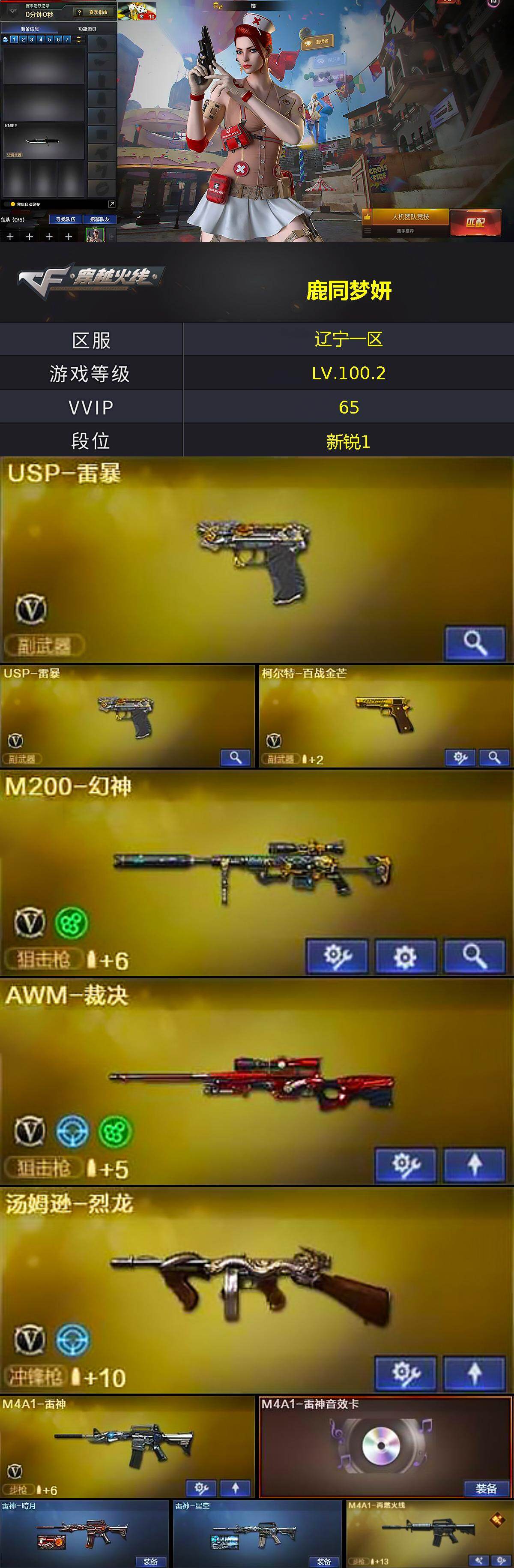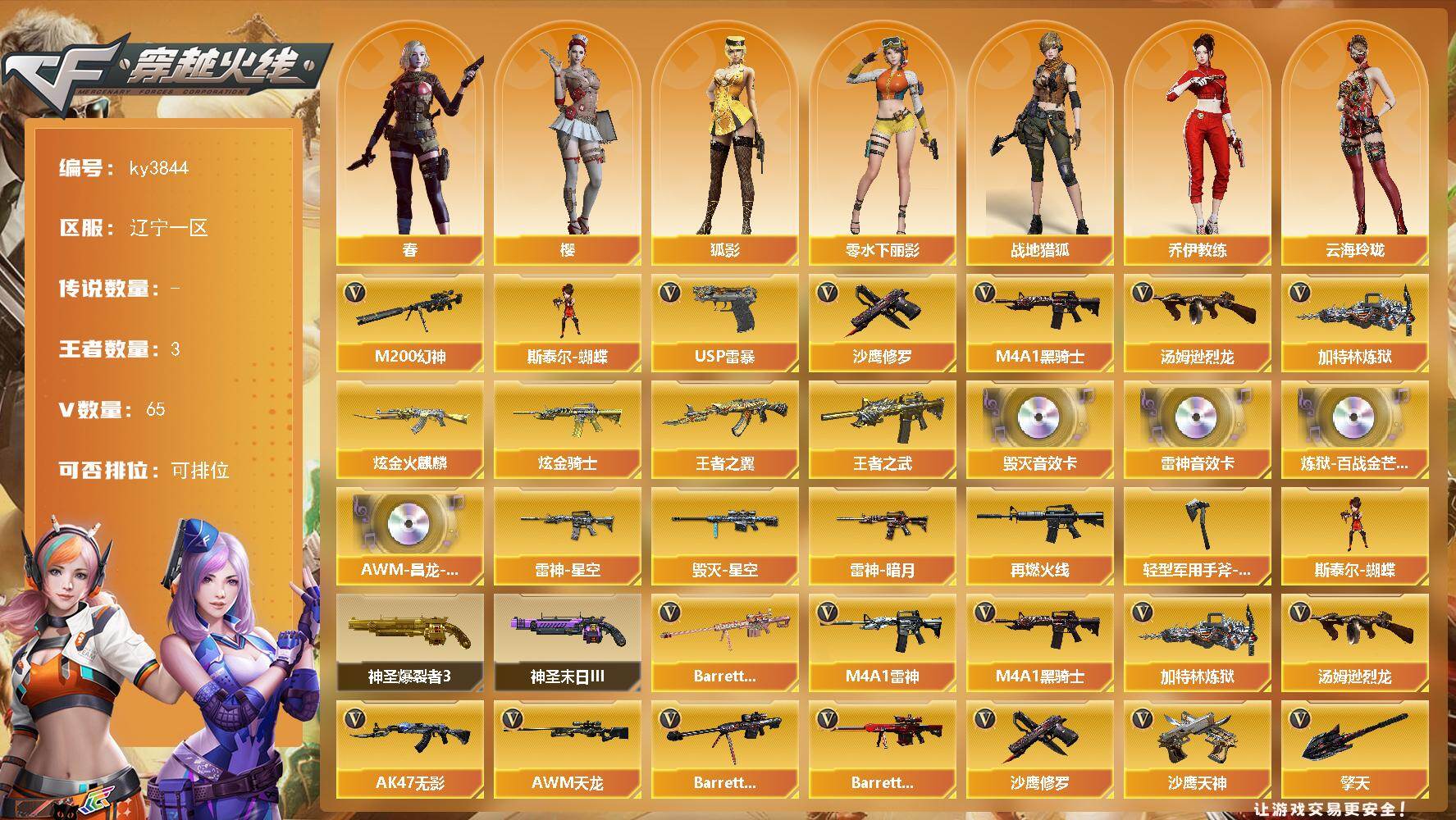 [14225991]辽宁一区-65V-3王者-2炫金 【热门武器】:M200-幻神,M4A1-黑骑士,汤姆逊-烈龙,加特林-炼狱,斯泰尔-蝴蝶,USP-雷暴*2,沙鹰-修罗*4 【王者炫金武器】:王者之翼,王者之武,炫金火麒麟,炫金骑士 【音效卡】:M4A1-雷神音效卡,Barrett-毁灭音效卡,炼狱-百战金芒-庆典舞曲音效卡,AWM-昌龙-怀旧音效卡 【皮肤】:雷神-暗月,雷神-星空,M4A1-再燃火线,毁灭-星空*2,轻型军用手斧-再燃火线 【角色】:樱,春,战地猎狐,狐影,奇洋探员,乔伊教练,云海玲珑,暗夜-X,初恋灵狐,风暴女,嘉年华灵狐,兰-海滩派对,零-水下丽影,灵狐者-黄金海岸,新娜塔莎,影武者-X 【人偶武器】:斯泰尔-蝴蝶 【挑战大师】:神圣爆裂者III,神圣爆裂者-末日III 【英雄级武器】:M4A1-雷神,M4A1-黑骑士,AK47-无影,M4A1-武圣,AK47-机械迷城,AK47-黑鲨*3,AK47-雷暴,AWM-天龙,Barrett-毁灭*2,Barrett-极光,AWM-裁决,M200-幻神,Barrett-金色蔷薇,加特林-炼狱,炼狱-百战金芒,汤姆逊-烈龙,沙鹰-修罗*4,沙鹰-天神,USP-雷暴*2,柯尔特-百战金芒,Glock18-武圣,屠龙*2,龙啸*3,擎天,斩神刀-雷暴,麒麟刺-百战金芒,高爆手雷-雷暴*7,闪光弹-雷暴*7,闪光弹-竞技荣光,烟雾弹-雷暴*7,M4A1-赤狱骑士 【道具】:云山科技背包,亚洲杯纪念炫彩背包,女皇终结者-背包,炫彩背包,百战金芒炫彩背包,虎牙炫彩背包,黑桃战神背包,女皇终结者-魔龙之吻,救世主-黑桃战神,绿色巨人,灵魂忍者,变异宝贝,迷雾幽灵,夺命之镰,防化服*3,金色流光-枪王排位*2,星辰流光-枪王排位,巅峰赛先锋-金色流光,流光-鎏金之域,流光-再燃火线,枪王排位28赛季金色流光,枪王排位29赛季金色流光,语音特效-盛典烟火,萌萌小葵表情,EP战队名片,EP战队喷图,C4-再燃火线,防弹头盔*3,防弹衣*3,C4工具钳*3,手雷包*3 【特殊枪械】:蝴蝶斯泰尔+1烈龙,1黑骑士,1烈龙,1炼狱,1蝴蝶斯泰尔