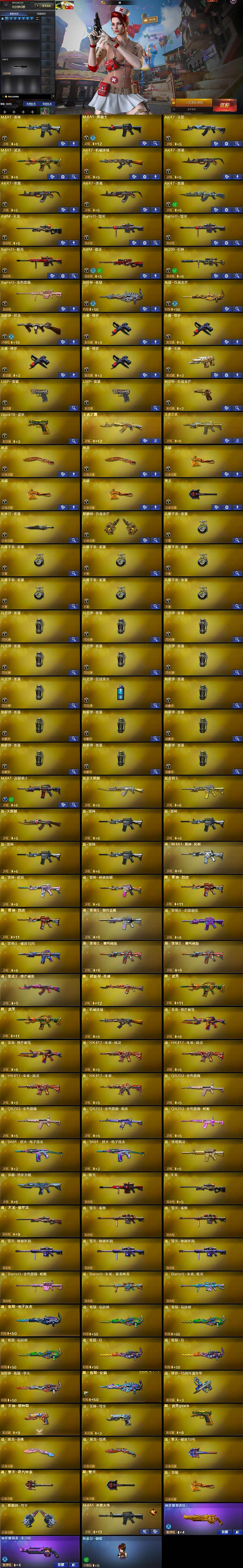 【英雄级武器】:M4A1-雷神,M4A1-黑骑士,AK47-无影,M4A1-武圣,AK47-机械迷城,AK47-黑鲨*3,AK47-雷暴,AWM-天龙,Barrett-毁灭*2,Barrett-极光,AWM-裁决,M200-幻神,Barrett-金色蔷薇,加特林-炼狱,炼狱-百战金芒,汤姆逊-烈龙,沙鹰-修罗*4,沙鹰-天神,USP-雷暴*2,柯尔特-百战金芒,Glock18-武圣,屠龙*2,龙啸*3,擎天,斩神刀-雷暴,麒麟刺-百战金芒,高爆手雷-雷暴*7,闪光弹-雷暴*7,闪光弹-竞技荣光,烟雾弹-雷暴*7,M4A1-赤狱骑士