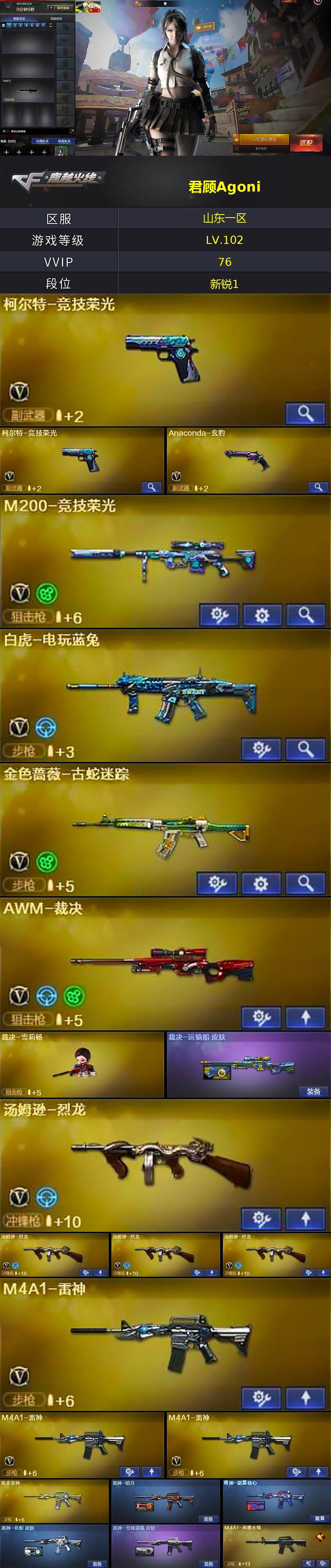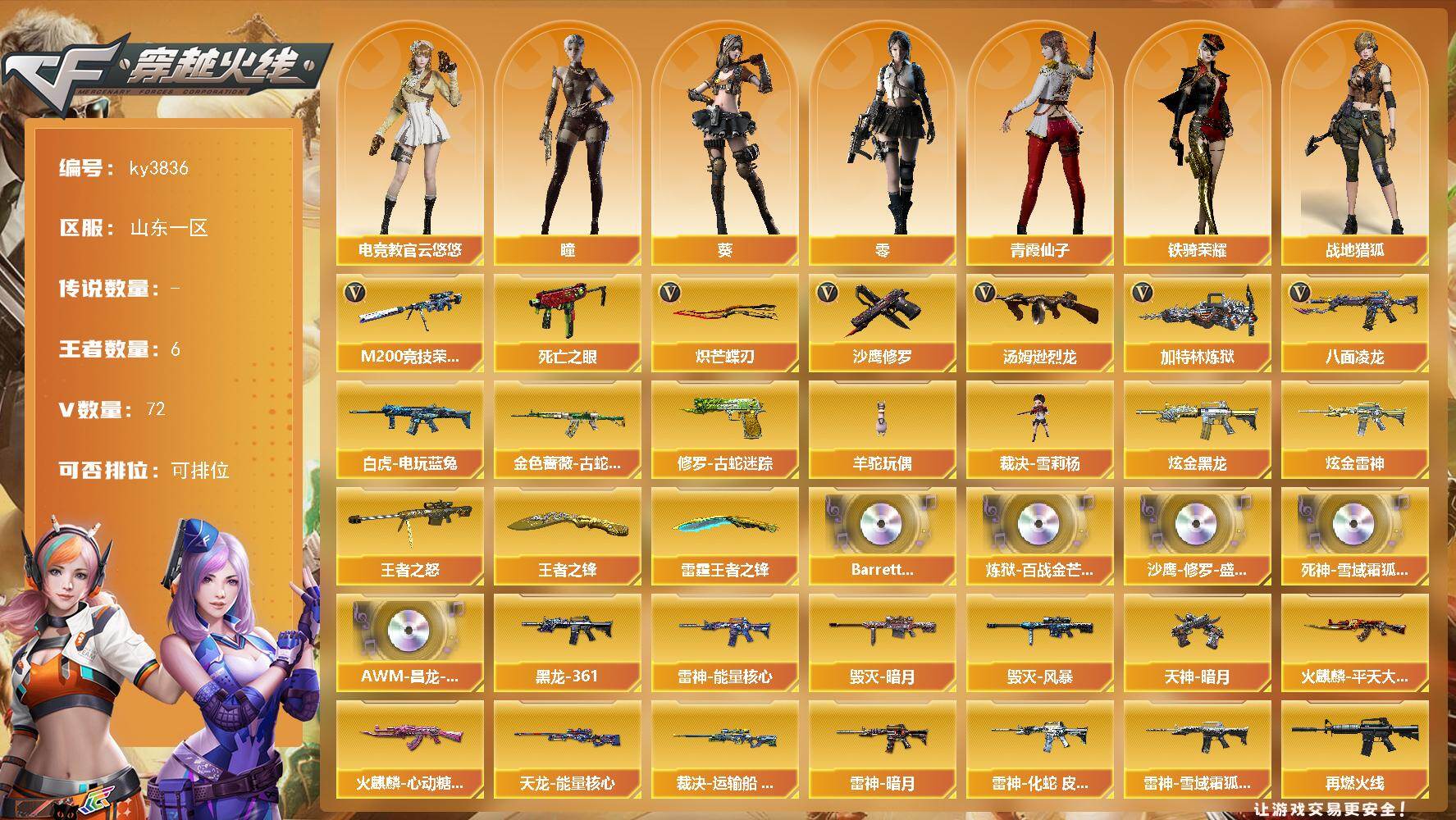 [14226250]山东一区-72V-6王者-2炫金 【热门武器】:金色蔷薇-古蛇迷踪,修罗-古蛇迷踪,M200-竞技荣光,八面凌龙,死亡之眼*2,白虎-电玩蓝兔,汤姆逊-烈龙*4,加特林-炼狱,羊驼玩偶,裁决-雪莉杨,沙鹰-修罗*5,炽芒蝶刃 【王者炫金武器】:王者之怒*2,王者之锋,雷霆王者之锋,炫金黑龙,炫金雷神 【音效卡】:Barrett-碧霄极光音效卡,炼狱-百战金芒-庆典舞曲音效卡,沙鹰-修罗-盛典舞曲音效卡,死神-雪域霜狐-怀旧音效卡,AWM-昌龙-怀旧音效卡 【皮肤】:裁决-运输船 皮肤,雷神-暗月,雷神-能量核心,雷神-化蛇 皮肤,雷神-雪域霜狐 皮肤,M4A1-再燃火线,火麒麟-平天大圣,火麒麟-心动糖果,毁灭-暗月,毁灭-风暴*2,黑龙-能量核心,黑龙-暗月,M4A1-黑龙-361,无影-暗月,无影-能量核心,死神-秘银,天启-暗月,战神-粉色甜心皮肤,战神-紫绶金章皮肤*2,战神-流金岁月皮肤*3,天龙-能量核心,极光-能量核心,修罗-能量核心,天神-暗月,屠龙-破浪逐光 皮肤,屠龙-惊鸿 皮肤,轻型军用手斧-再燃火线,麒麟刺-甜蜜糖果 皮肤 【角色】:零,葵,瞳,电竞教官-云悠悠,战地猎狐,雪域霜狐,蛇隐宗,修道士,暗夜-X,初恋灵狐,芳心审判者,嘉年华灵狐,灵狐者-X,龙儿-小淘气,曼陀罗-X,潘多拉-X,潜龙队-X,青霞仙子,蛇姬,斯沃特-X,铁骑荣耀,兔囡囡,新娜塔莎,樱-战斗天使,影武者-X 【人偶武器】:裁决-雪莉杨,迷你救赎猎手,异变清道夫-蛇影双骄,AWM-灵狐-15周年嘉年华*2,M37-葵,COP-旗袍,迷你深渊冰龙,迷你裂空之翼,迷你牛魔王,夺魂,迷你生化手雷*3,生化手雷-机甲核心*3,闪光弹-小乔,灵狐娃娃手雷 【暴走生化】:双面神,死亡之眼*2,超级对讲机 【挑战大师】:冰龙粉碎者-白马银枪,激光毁灭者III,KAC-圣炎切割者III,神圣爆裂者-末日III 【英雄级武器】:AK47-火麒麟*2,M4A1-黑龙,M4A1-雷神*3,AK47-无影,AK47-黑武士,无影-神兵利器,八面凌龙,金色蔷薇-古蛇迷踪,死神-雪域霜狐,AK-47-猩红传说*6,AK47-B-战神,白虎-电玩蓝兔,AWM-天龙,Barrett-毁灭,Barrett-极光,AWM-裁决,M200-竞技荣光,Barrett-金色蔷薇,加特林-炼狱,炼狱-百战金芒,