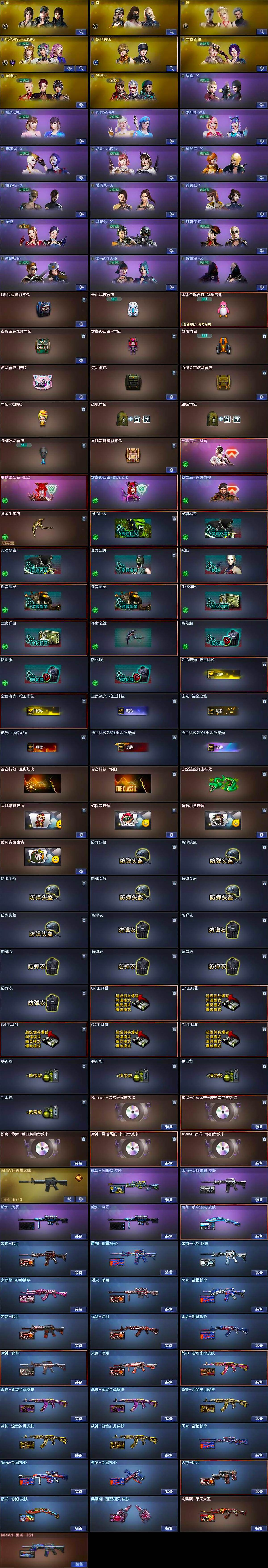 【英雄级武器】:AK47-火麒麟*2,M4A1-黑龙,M4A1-雷神*3,AK47-无影,AK47-黑武士,无影-神兵利器,八面凌龙,金色蔷薇-古蛇迷踪,死神-雪域霜狐,AK-47-猩红传说*6,AK47-B-战神,白虎-电玩蓝兔,AWM-天龙,Barrett-毁灭,Barrett-极光,AWM-裁决,M200-竞技荣光,Barrett-金色蔷薇,加特林-炼狱,炼狱-百战金芒,