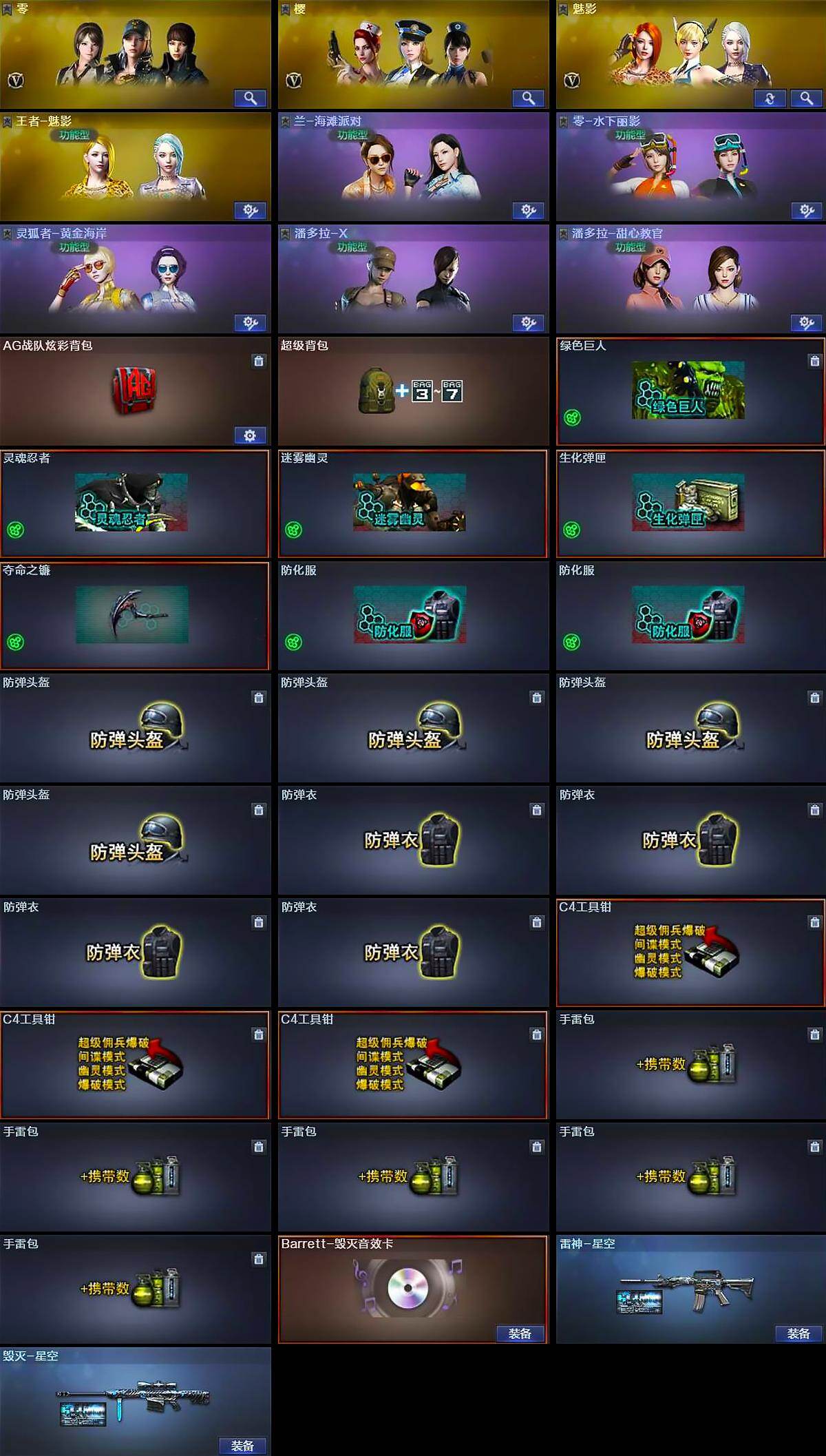 【道具】:AG战队炫彩背包,超级背包,绿色巨人,灵魂忍者,迷雾幽灵,生化弹匣,夺命之镰,防化服*2,防弹头盔*4,防弹衣*4,C4工具钳*3,手雷包*5