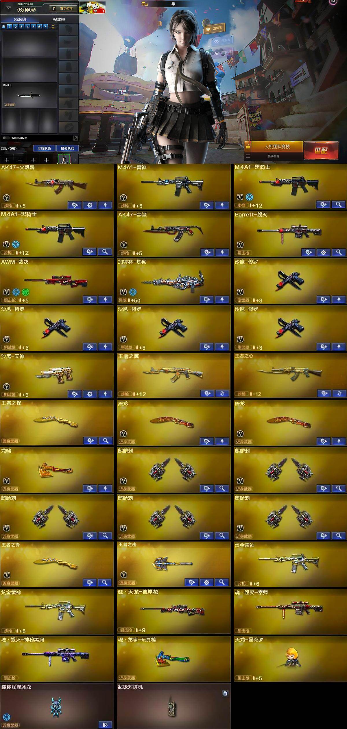 【英雄级武器】:AK47-火麒麟,M4A1-雷神,M4A1-黑骑士*2,AK47-黑鲨,Barrett-毁灭,AWM-裁决,加特林-炼狱,沙鹰-修罗*4,沙鹰-天神,屠龙*2,龙啸,麒麟刺*5,王者之锋-觉醒版,王者之击-觉醒版