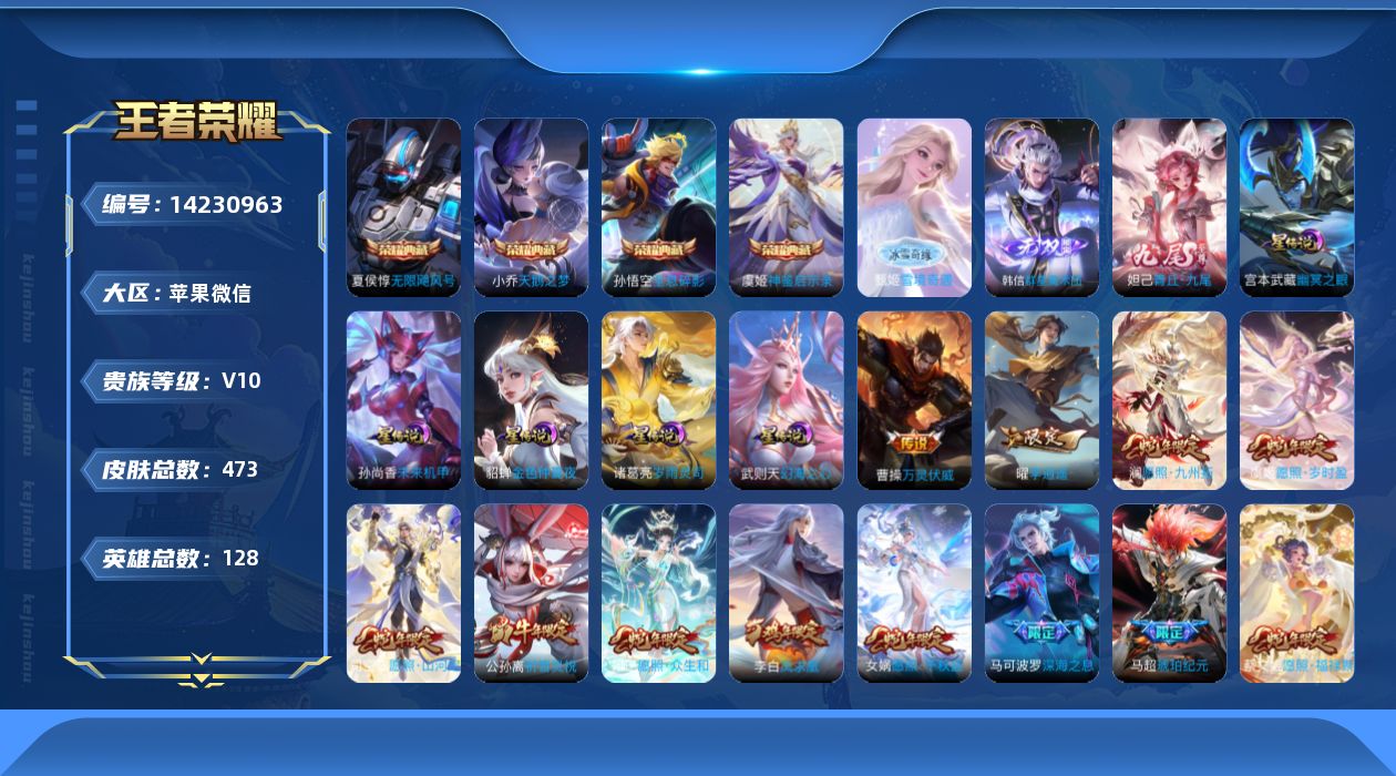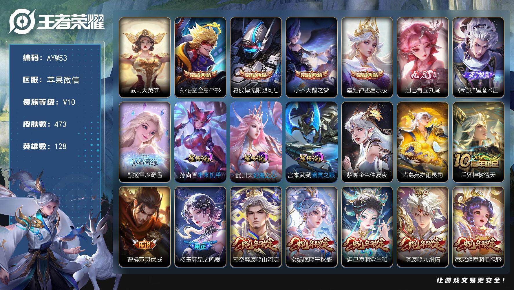 [14230963]可二次【店主推荐捡漏号!可直接换绑】苹果WX-V10-最强王者段位-128英雄-473皮肤-6星传说-4典藏皮肤-1典藏英雄-3无双-64传说-148史诗