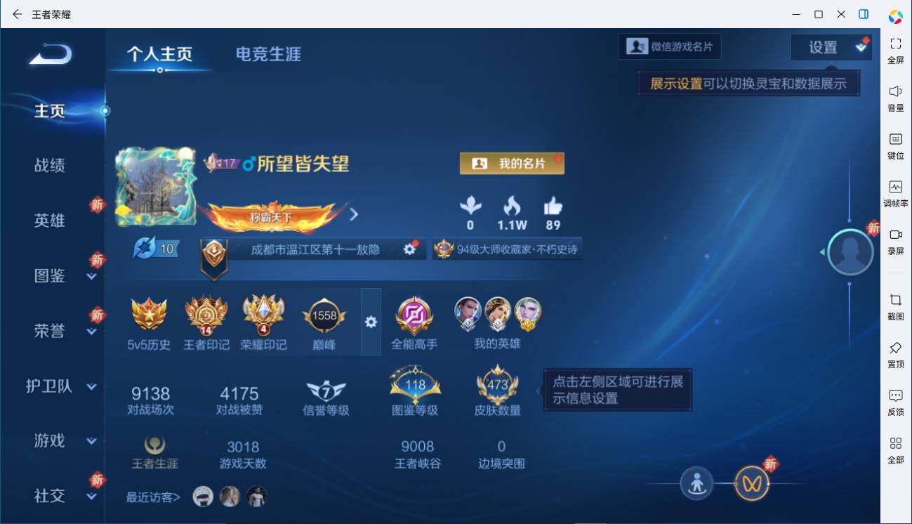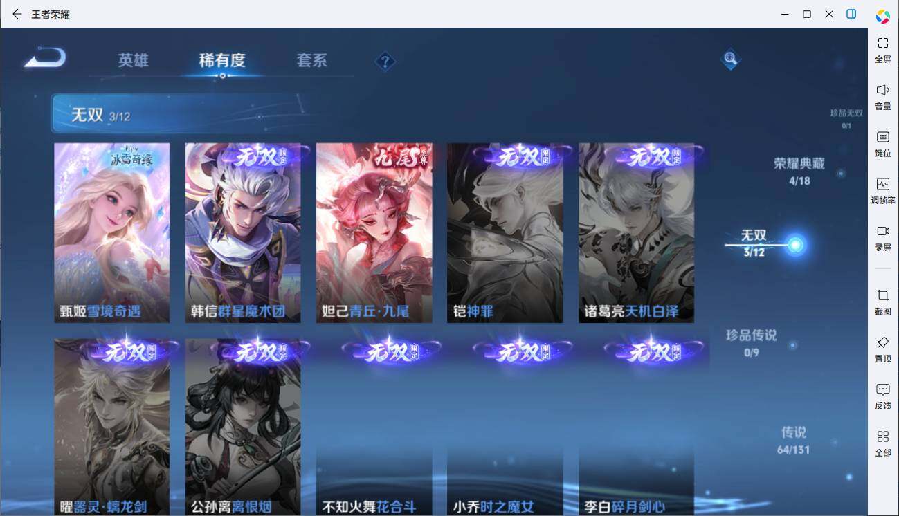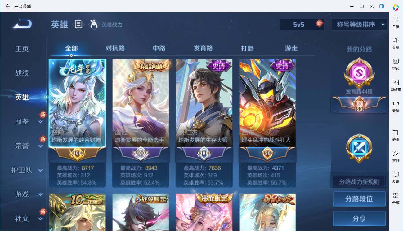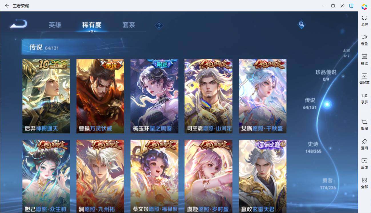 - [11498282]V4 1珍品传说 3传说 93英雄 59皮肤 可修改实名 优质装备:器灵·落星盏,涂山容容 传说皮:幻光神枪 限定皮:愿照·九州拓(澜年限),鸣野蒿 史诗皮:器灵·浮梦炉,化蝶舞,龙之律动,百相守梦-黄忠,织梦人,水果甜心,天才门将,星夜王子,幽灵船长,鬼剑武藏,乘风破浪,鹰眼统帅,魅力维加斯