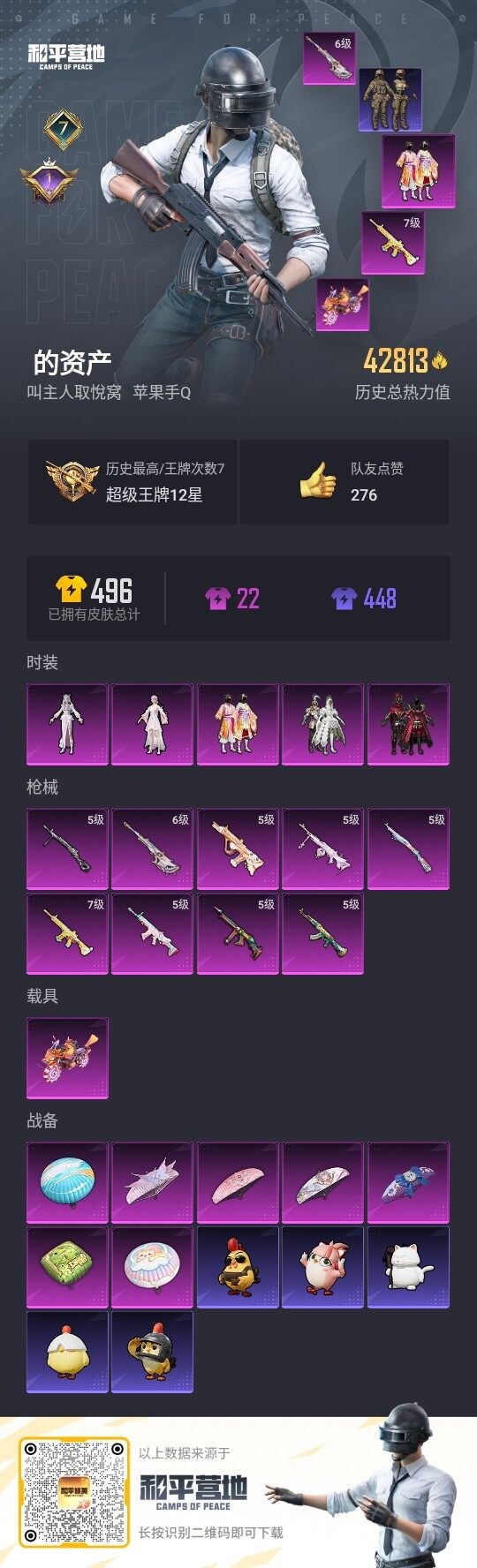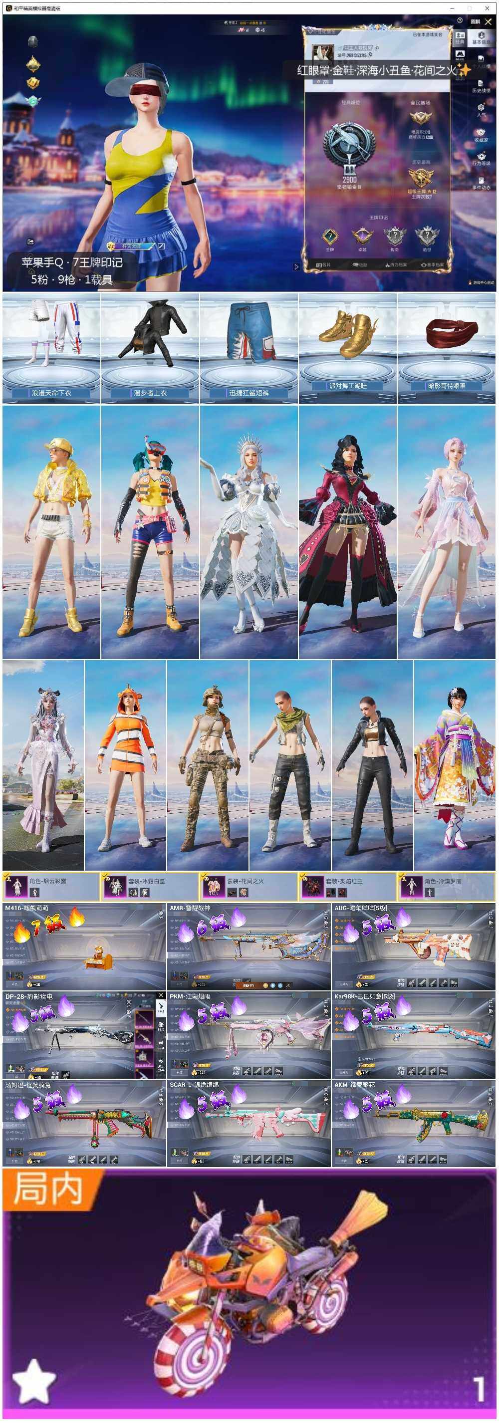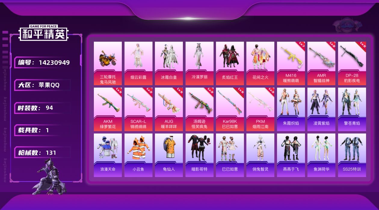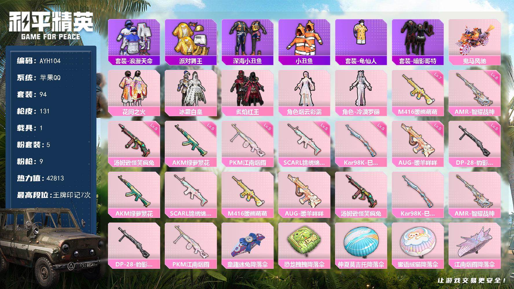 [14230949]可二次【店主推荐捡漏号!可直接换绑】苹果 手Q-5粉装-9特效枪-1载具-0粉色飞行器-42813热力值-7王牌印记-94套装-131枪皮【热门品类】:套装-浪漫天命,套装-派对舞王,套装-深海小丑鱼,套装-小丑鱼,套装-龟仙人,套装-暗影哥特【粉色载具】:鬼马风驰【粉色套装】:粉装-花间之火,粉装-冰霜白皇,粉装-炙焰红王,角色-烟云彩露,角色-冷漠罗丽【粉色枪皮等级】:AKM-绿萝繁花(五级),SCAR-L-锦绣绵绵(五级),M416-暖熊萌萌(七级),AUG-暖羊咩咩(五级),汤姆逊-怪笑疯兔(五级),Kar98K-巳巳如意(五级),AMR-智耀战神(六级),DP-28-豹影疾电(五级),PKM-江南烟雨(五级)【粉色枪皮】:AKM-绿萝繁花,SCAR-L-锦绣绵绵,M416-暖熊萌萌,AUG-暖羊咩咩,汤姆逊-怪笑疯兔,Kar98K-巳巳如意,AMR-智耀战神,DP-28-豹影疾电,PKM-江南烟雨