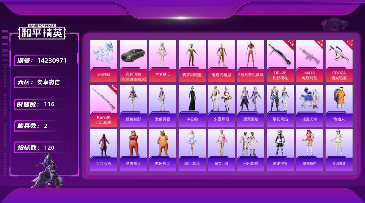 [14230971]可二次【店主推荐捡漏号!可直接换绑】安卓 微信-4粉装-4特效枪-2载具-3粉色飞行器-41385热力值-7王牌印记-116套装-120枪皮【热门品类】:套装-浪漫天命,套装-奇异狩猎者,套装-龟仙人,套装-红红火火【粉色载具】:宾利飞驰(布罗德盖棕双色),冰绡玉鳞【粉色套装】:角色-闪耀迪迦,角色-赛罗闪耀型,角色-2号机款机体服,角色-羊梦糖心【粉色枪皮等级】:M416-电玩时刻(五级),GROZA-镜光银凌(五级),Kar98K-巳巳如意(五级),DP-28-豹影疾电(五级)【粉色枪皮】:M416-电玩时刻,GROZA-镜光银凌,Kar98K-巳巳如意,DP-28-豹影疾电【粉色飞行器】:飞天猪飞行器