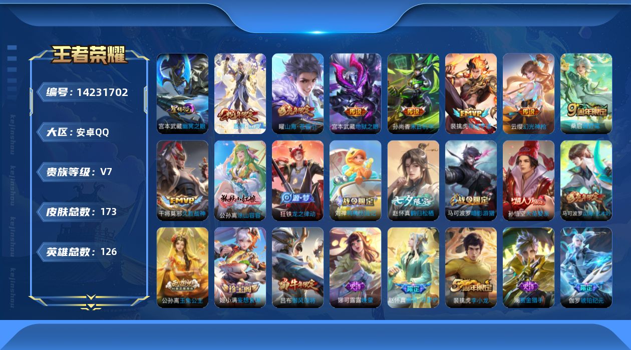 - [11323162]V7 4传说 123英雄 240皮肤 可修改实名 优质装备:云鹰飞将(小将军),一念神魔 珍宝阁皮:女武神,玩趣恶龙 限定皮:愿照·九州拓(澜年限),逐霄战戟,鸣野蒿,神威(电光马子),高山流水,五谷丰年,梁祝,李小龙,如梦令-后羿,默契交锋-花木兰,孙行者 史诗皮:星界战将,龙之律动,茶境仙,破空之剑,星界特工,紫霞仙子,特工魅影,千年之狐,魅语,蒙恬荣光圣徽,暗夜猫娘,龙骑士(小龙虾),末日机甲-吕布,猫狗日记-孙策,修罗,摇滚巨星,水果甜心,天才门将,星夜王子,功夫厨神,暗隐猎兽者,幽灵船长,鬼剑武藏,心灵战警,地狱岩魂,纤云弄巧,拒霜思,乘风破浪,月团寄思,水晶猎龙者,曙光守护者,金属风暴,原初追逐者,圣诞狂欢,圣诞恋歌,鹰眼统帅,魅力维加斯,黎明之约,赏金猎手,无心
