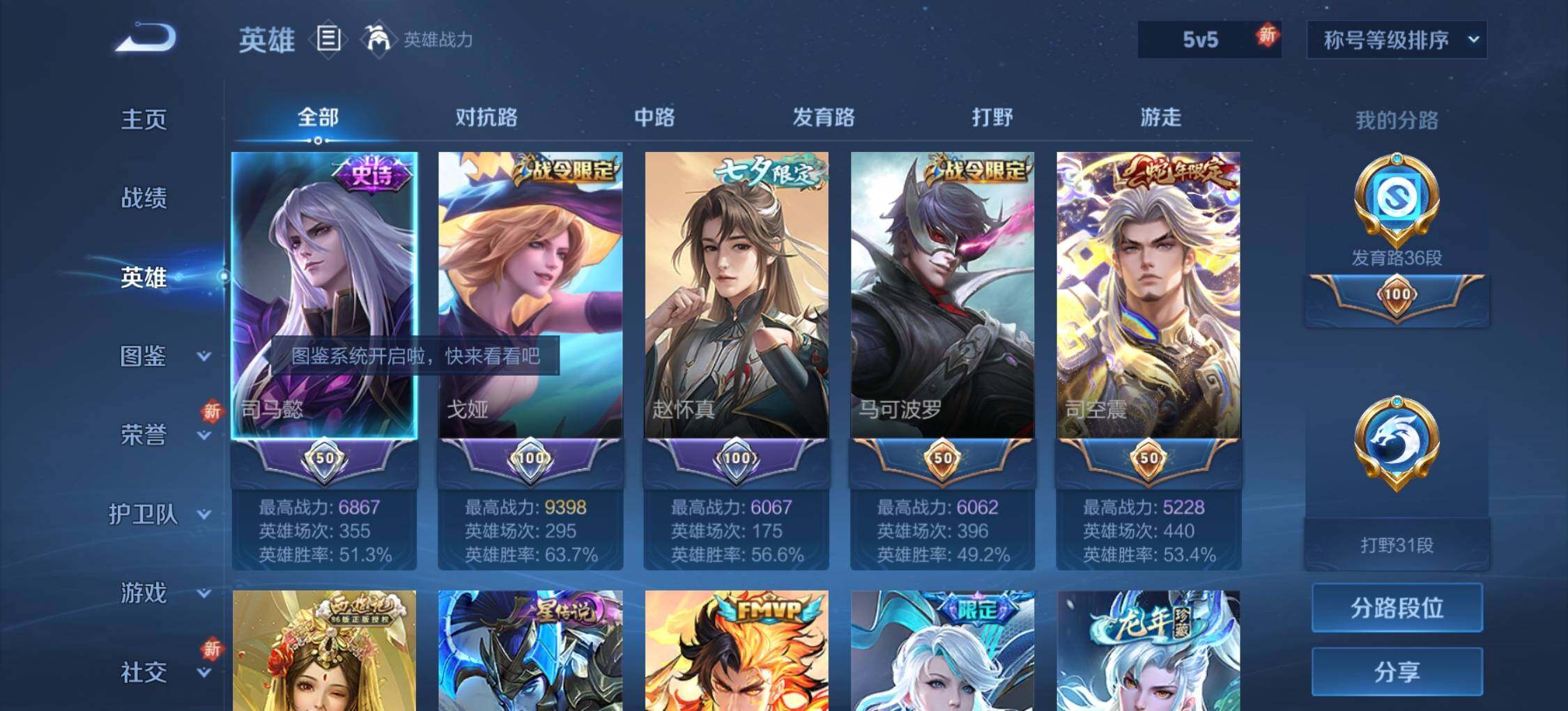 [14231702]可二次【店主推荐捡漏号!可直接换绑】,发育路36段、打野31段,安卓Q-V7-最强王者段位-126英雄-173皮肤-1星传说-8传说-56史诗