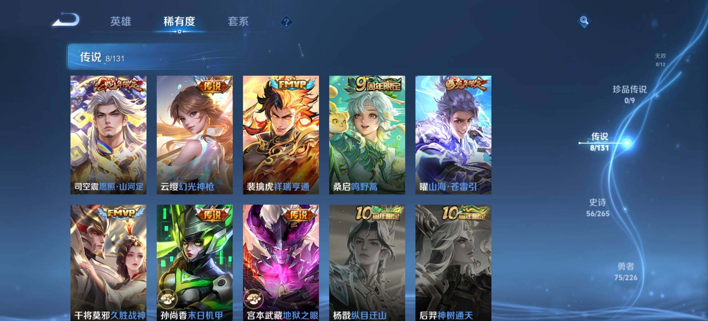 【传说皮肤】:司空震愿照山河定,云缨幻光神枪,裴擒虎祥瑞亨通,桑启鸣野蒿,曜山海苍雷引,干将莫邪久胜战神,孙尚香末日机甲,宫本武藏地狱之眼