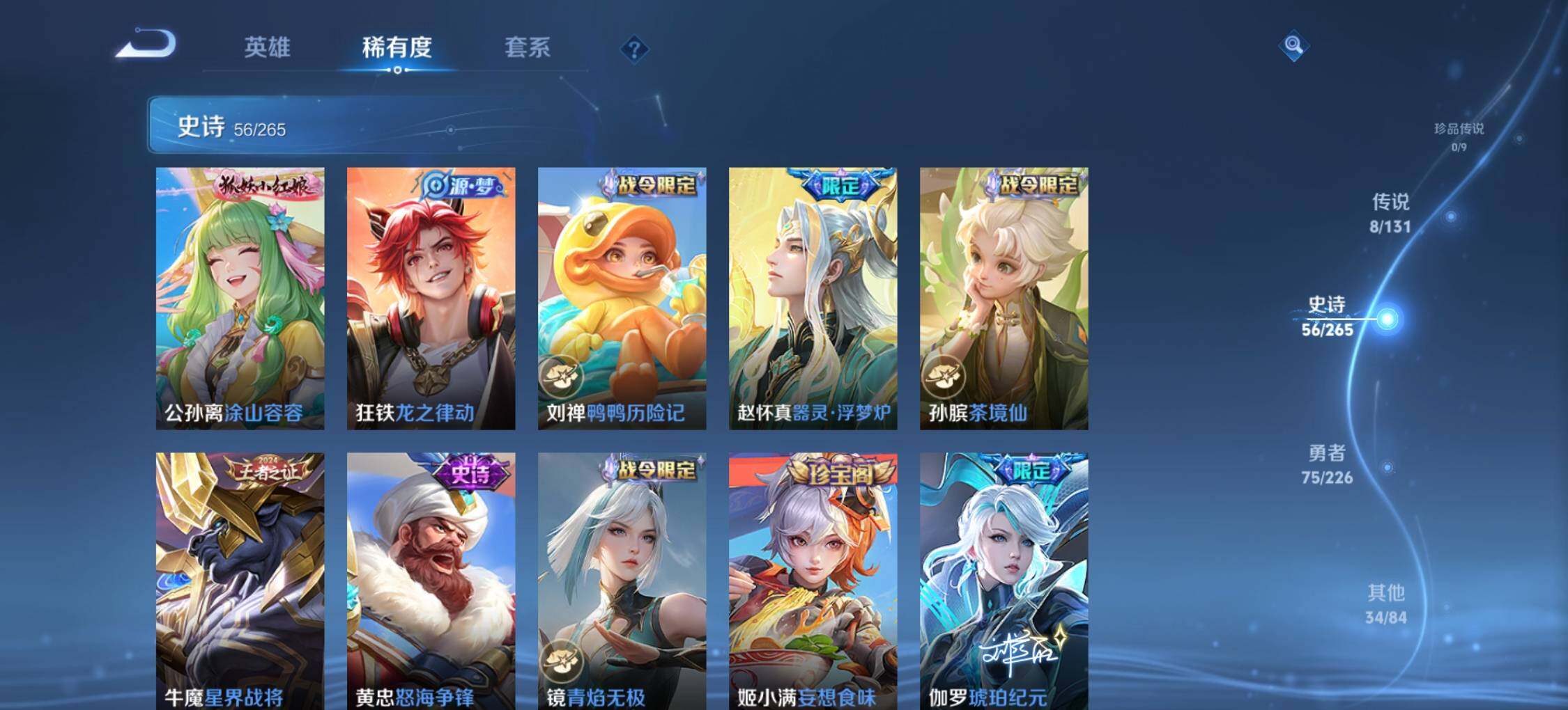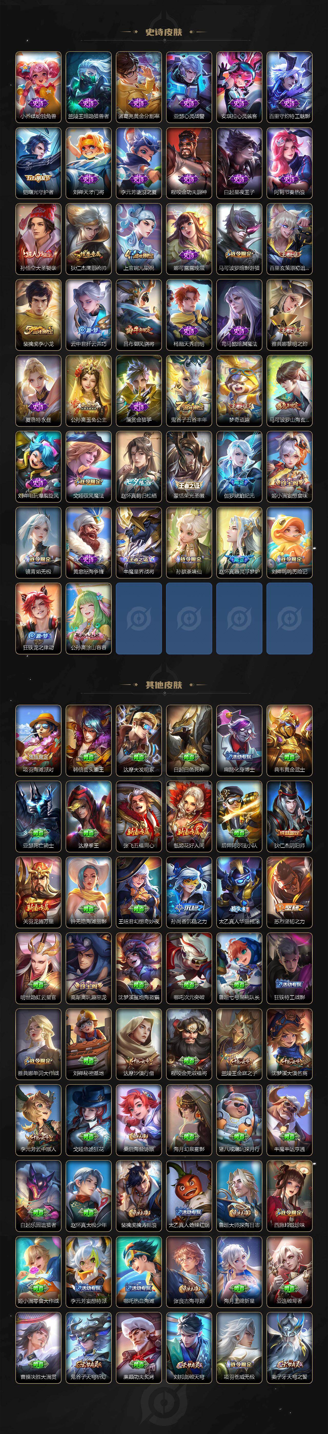【史诗皮肤】:赵云皇家上将,赵云未来纪元,貂蝉圣诞恋歌,王昭君偶像歌手,狄仁杰魔术师,廉颇地狱岩魂,宫本武藏鬼剑武藏,孙尚香水果甜心,妲己魅力维加斯,吕布末日机甲,花木兰水晶猎龙者,刘邦德古拉伯爵,小乔缤纷独角兽,兰陵王暗隐猎兽者,诸葛亮黄金分割率,亚瑟心灵战警,安琪拉心灵骇客,百里守约特工魅影,铠曙光守护者,刘禅天才门将,李元芳逐浪之夏,程咬金功夫厨神,白起星夜王子,阿轲节奏热浪,孙悟空大圣娶亲,狄仁杰鹰眼统帅,上官婉儿梁祝,娜可露露晚萤,马可波罗暗影游猎,百里玄策原初追逐者,裴擒虎李小龙,云中君纤云弄巧,吕布御风骁将,杨戬天秀启明,司马懿暗渊魔法,雅典娜黎明之约,夏洛特永昼,公孙离玉兔公主,澜赏金猎手,鬼谷子五谷丰年,梦奇顽趣,马可