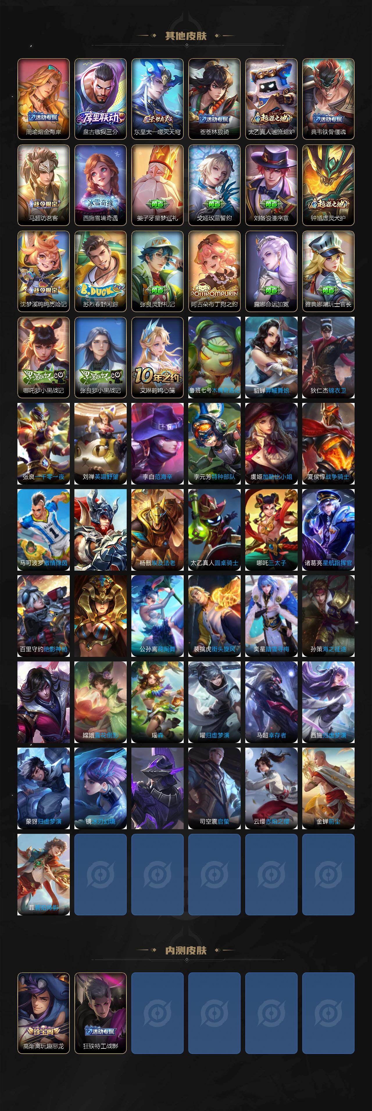 【限定皮肤】:姜子牙天穹之誓,狄仁杰阴阳师,赵云皇家上将,高渐离玩趣恶龙,吕布御风骁将,马可波罗暗影游猎,马可波罗山海玄木吟,狄仁杰魔术师,达摩沙漠行僧,项羽海滩派对,兰陵王金庭之子,孙悟空大圣娶亲,李元芳云中旅人,雅典娜单词大作战,雅典娜黎明之约,太乙真人华丽摇滚,鬼谷子五谷丰年,百里玄策原初追逐者,梦奇顽趣,公孙离玉兔公主,沈梦溪大漠名商,裴擒虎李小龙,裴擒虎擒涛扼浪,云中君纤云弄巧,上官婉儿梁祝,曜山海苍雷引,西施玲珑珍味,鲁班大师探海日志,桑启海盐诗旅,戈娅驭风魔法,赵怀真鹤归松栖,张良古海寻踪,蒙恬荣光圣徽,鬼谷子天穹祈灯,伽罗琥珀纪元,姬小满妄想食味,刘邦剑破天穹,镜青焰无极,项羽苍威无极,周瑜熔金海岸