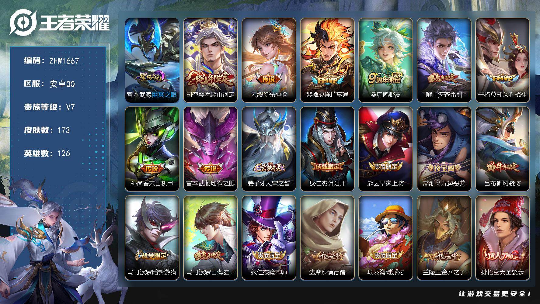 [14231702]可二次【店主推荐捡漏号!可直接换绑】,发育路36段、打野31段,安卓Q-V7-最强王者段位-126英雄-173皮肤-1星传说-8传说-56史诗 【英雄全皮】:赵怀真全皮,戈娅全皮 【传说皮肤】:司空震愿照山河定,云缨幻光神枪,裴擒虎祥瑞亨通,桑启鸣野蒿,曜山海苍雷引,干将莫邪久胜战神,孙尚香末日机甲,宫本武藏地狱之眼 【限定皮肤】:姜子牙天穹之誓,狄仁杰阴阳师,赵云皇家上将,高渐离玩趣恶龙,吕布御风骁将,马可波罗暗影游猎,马可波罗山海玄木吟,狄仁杰魔术师,达摩沙漠行僧,项羽海滩派对,兰陵王金庭之子,孙悟空大圣娶亲,李元芳云中旅人,雅典娜单词大作战,雅典娜黎明之约,太乙真人华丽摇滚,鬼谷子五谷丰年,百里玄策原初追逐者,梦奇顽趣,公孙离玉兔公主,沈梦溪大漠名商,裴擒虎李小龙,裴擒虎擒涛扼浪,云中君纤云弄巧,上官婉儿梁祝,曜山海苍雷引,西施玲珑珍味,鲁班大师探海日志,桑启海盐诗旅,戈娅驭风魔法,赵怀真鹤归松栖,张良古海寻踪,蒙恬荣光圣徽,鬼谷子天穹祈灯,伽罗琥珀纪元,姬小满妄想食味,刘邦剑破天穹,镜青焰无极,项羽苍威无极,周瑜熔金海岸 【年限皮肤】:吕布御风骁将,马可波罗山海玄木吟,曜山海苍雷引 【赛季限定】:达摩沙漠行僧,兰陵王金庭之子,张良古海寻踪,李元芳云中旅人,雅典娜黎明之约,百里玄策原初追逐者,梦奇顽趣,沈梦溪大漠名商,裴擒虎擒涛扼浪,鲁班大师探海日志,桑启海盐诗旅,鬼谷子天穹祈灯,蒙恬荣光圣徽,刘邦剑破天穹,姜子牙天穹之誓 【战令限定】:马可波罗暗影游猎,雅典娜单词大作战,西施玲珑珍味,戈娅驭风魔法,镜青焰无极,项羽苍威无极 【史诗皮肤】:赵云皇家上将,赵云未来纪元,貂蝉圣诞恋歌,王昭君偶像歌手,狄仁杰魔术师,廉颇地狱岩魂,宫本武藏鬼剑武藏,孙尚香水果甜心,妲己魅力维加斯,吕布末日机甲,花木兰水晶猎龙者,刘邦德古拉伯爵,小乔缤纷独角兽,兰陵王暗隐猎兽者,诸葛亮黄金分割率,亚瑟心灵战警,安琪拉心灵骇客,百里守约特工魅影,铠曙光守护者,刘禅天才门将,李元芳逐浪之夏,程咬金功夫厨神,白起星夜王子,阿轲节奏热浪,孙悟空大圣娶亲,狄仁杰鹰眼统帅,上官婉儿梁祝,娜可露露晚萤,马可波罗暗影游猎,百里玄策原初追逐者,裴擒虎李小龙,云中君纤云弄巧,吕布御风骁将,杨戬天秀启明,司马懿暗渊魔法,雅典娜黎明之约,夏洛特永昼,公孙离玉兔公主,澜赏金猎手,鬼谷子五谷丰年,梦奇顽趣,马可