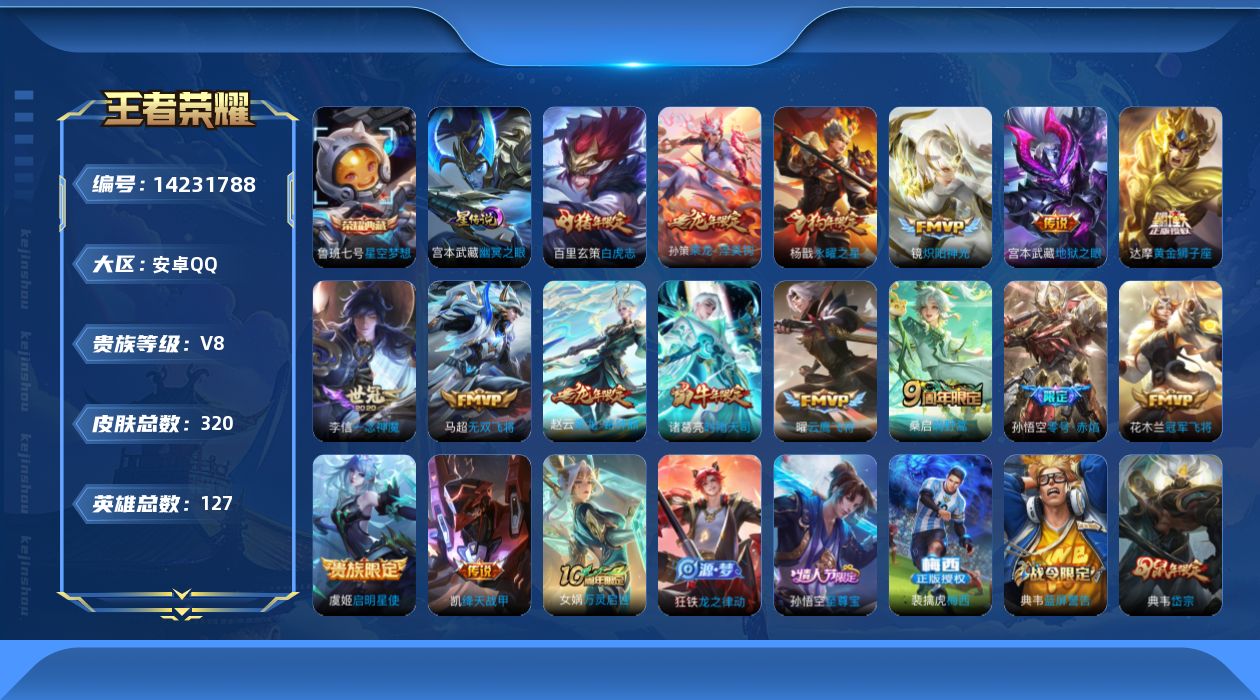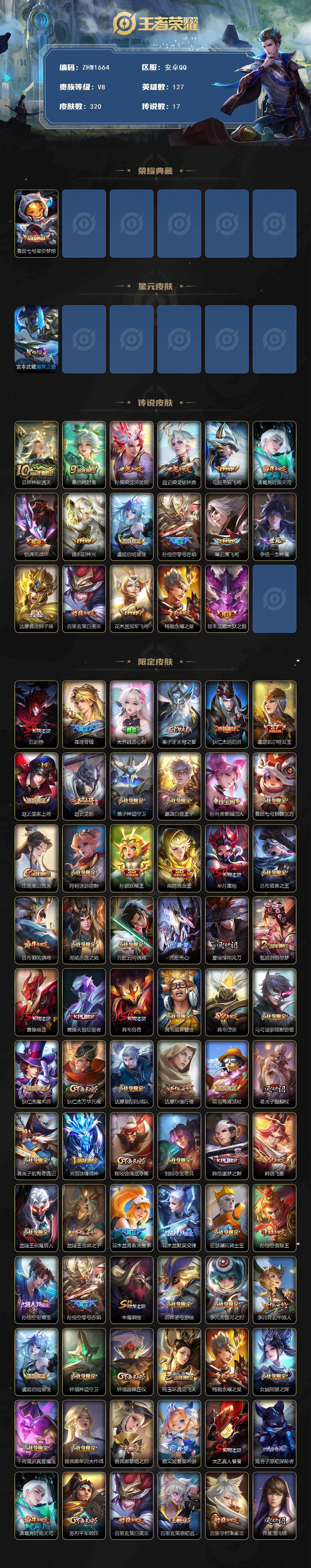 [14231788]【店主推荐捡漏号!可直接换绑】安卓Q-V8-最强王者段位-127英雄-320皮肤-1典藏皮肤-17传说-94史诗 【英雄全皮】:猪八戒全皮,影全皮 【荣耀典藏】:鲁班七号星空梦想 【传说皮肤】:后羿神树通天,桑启鸣野蒿,孙策乘龙淬吴钩,赵云乘龙铭钟鼎,马超无双飞将,诸葛亮时雨天司,铠绛天战甲,镜炽阳神光,虞姬启明星使,孙悟空零号赤焰,曜云鹰飞将,李信一念神魔,达摩黄金狮子座,百里玄策白虎志,花木兰冠军飞将,杨戬永曜之星,宫本武藏地狱之眼 【限定皮肤】:白起狰,暃埋骨钱,大乔绒语心约,姜子牙天穹之誓,狄仁杰阴阳师,虞姬凯尔特女王,赵云皇家上将,赵云龙胆,墨子神迹守卫,嬴政白昼王子,孙尚香蔷薇恋人,鲁班七号狮舞东方,庄周高山流水,阿轲迷踪丽影,孙膑妖精王,扁鹊炼金王,芈月重明,吕布猎兽之王,吕布御风骁将,周瑜赤莲之焰,元歌云间偶戏,元歌无心,夏侯惇朔风刀,甄姬游园惊梦,曹操烛龙,曹操天狼征服者,典韦穷奇,典韦蓝屏警告,典韦岱宗,马可波罗暗影游猎,狄仁杰魔术师,狄仁杰万华元夜,达摩星际陆战队,达摩沙漠行僧,项羽海滩派对,老夫子醍醐杖,老夫子航海奇遇记,关羽冰锋战神,程咬金演武夺筹,刘邦夺宝奇兵,韩信逐梦之影,韩信飞衡,兰陵王驯魔猎人,兰陵王金庭之子,花木兰青春决赛季,花木兰默契交锋,亚瑟潮玩骑士王,孙悟空美猴王,孙悟空至尊宝,孙悟空零号赤焰,牛魔御旌,后羿圣弓游侠,李元芳银河之约,李元芳云中旅人,虞姬启明星使,钟馗神迹守卫,钟馗驱傩正仪,杨玉环遇见飞天,杨戬永曜之星,女娲朔望之晖,干将莫邪真爱魔法,雅典娜单词大作战,雅典娜黎明之约,蔡文姬繁星吟游,太乙真人饕餮,鬼谷子原初探秘者,诸葛亮时雨天司,苏烈千军破阵,百里玄策白虎志,百里玄策原初追逐者,百里守约朱雀志,弈星混沌棋,梦奇顽趣,沈梦溪星空之诺,沈梦溪大漠名商,明世隐疑决卦,裴擒虎天狼狩猎者,裴擒虎李小龙,裴擒虎擒涛扼浪,狂铁御狮,米莱狄御霄,米莱狄胡桃异想国,云中君纤云弄巧,伽罗天狼溯光者,盾山御銮,猪八戒西部大镖客,猪八戒猪悟能,上官婉儿梁祝,上官婉儿天狼绘梦者,蒙犽狂想玩偶喵,鲁班大师探海日志,桑启海盐诗旅,艾琳女武神,阿古朵江河有灵,张良古海寻踪,裴擒虎梅西,蒙恬荣光圣徽,高渐离燃音魔法,妲己灵卜魔法,鬼谷子天穹祈灯,姬小满妄想食味,孙策乘龙淬吴钩,赵云乘龙铭钟鼎,沈梦溪龙舞盛年,周瑜熔金海岸 【年限皮肤】:百