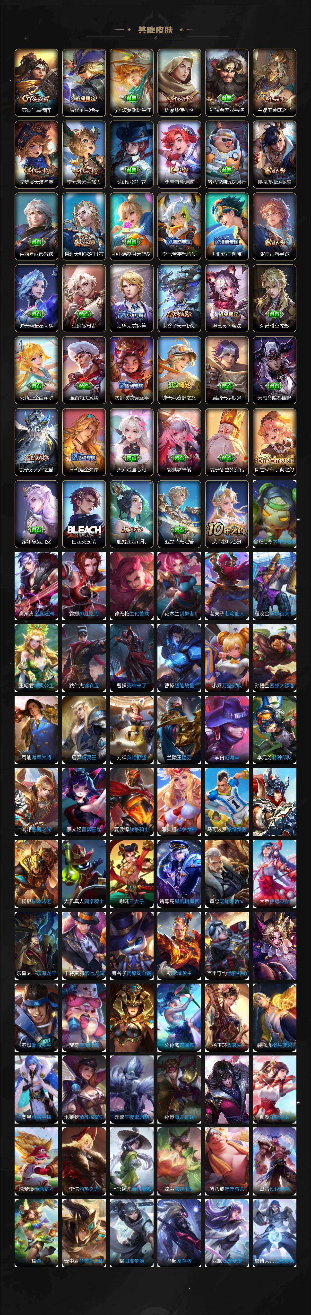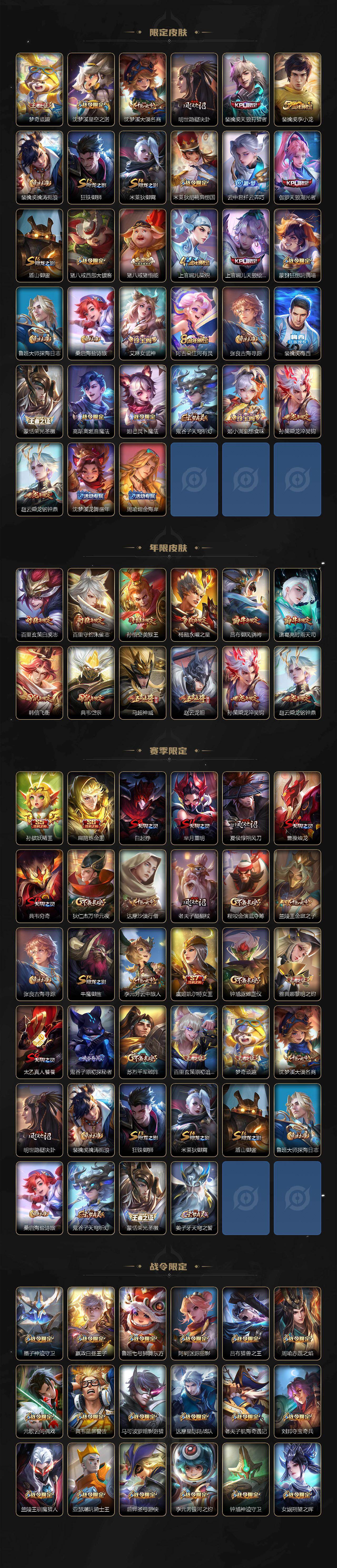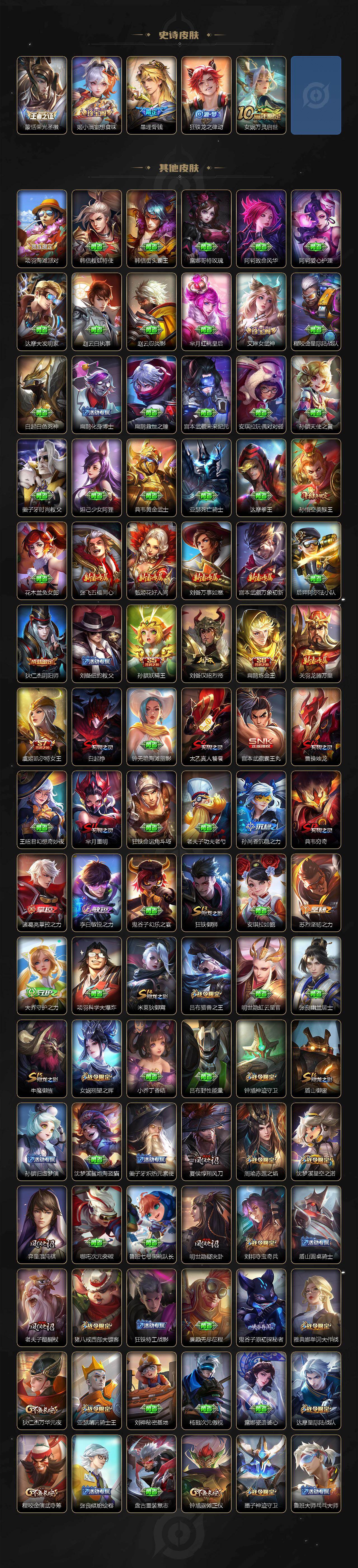 【限定皮肤】:白起狰,暃埋骨钱,大乔绒语心约,姜子牙天穹之誓,狄仁杰阴阳师,虞姬凯尔特女王,赵云皇家上将,赵云龙胆,墨子神迹守卫,嬴政白昼王子,孙尚香蔷薇恋人,鲁班七号狮舞东方,庄周高山流水,阿轲迷踪丽影,孙膑妖精王,扁鹊炼金王,芈月重明,吕布猎兽之王,吕布御风骁将,周瑜赤莲之焰,元歌云间偶戏,元歌无心,夏侯惇朔风刀,甄姬游园惊梦,曹操烛龙,曹操天狼征服者,典韦穷奇,典韦蓝屏警告,典韦岱宗,马可波罗暗影游猎,狄仁杰魔术师,狄仁杰万华元夜,达摩星际陆战队,达摩沙漠行僧,项羽海滩派对,老夫子醍醐杖,老夫子航海奇遇记,关羽冰锋战神,程咬金演武夺筹,刘邦夺宝奇兵,韩信逐梦之影,韩信飞衡,兰陵王驯魔猎人,兰陵王金庭之子,花木兰青春决赛季,花木兰默契交锋,亚瑟潮玩骑士王,孙悟空美猴王,孙悟空至尊宝,孙悟空零号赤焰,牛魔御旌,后羿圣弓游侠,李元芳银河之约,李元芳云中旅人,虞姬启明星使,钟馗神迹守卫,钟馗驱傩正仪,杨玉环遇见飞天,杨戬永曜之星,女娲朔望之晖,干将莫邪真爱魔法,雅典娜单词大作战,雅典娜黎明之约,蔡文姬繁星吟游,太乙真人饕餮,鬼谷子原初探秘者,诸葛亮时雨天司,苏烈千军破阵,百里玄策白虎志,百里玄策原初追逐者,百里守约朱雀志,弈星混沌棋,梦奇顽趣,沈梦溪星空之诺,沈梦溪大漠名商,明世隐疑决卦,裴擒虎天狼狩猎者,裴擒虎李小龙,裴擒虎擒涛扼浪,狂铁御狮,米莱狄御霄,米莱狄胡桃异想国,云中君纤云弄巧,伽罗天狼溯光者,盾山御銮,猪八戒西部大镖客,猪八戒猪悟能,上官婉儿梁祝,上官婉儿天狼绘梦者,蒙犽狂想玩偶喵,鲁班大师探海日志,桑启海盐诗旅,艾琳女武神,阿古朵江河有灵,张良古海寻踪,裴擒虎梅西,蒙恬荣光圣徽,高渐离燃音魔法,妲己灵卜魔法,鬼谷子天穹祈灯,姬小满妄想食味,孙策乘龙淬吴钩,赵云乘龙铭钟鼎,沈梦溪龙舞盛年,周瑜熔金海岸