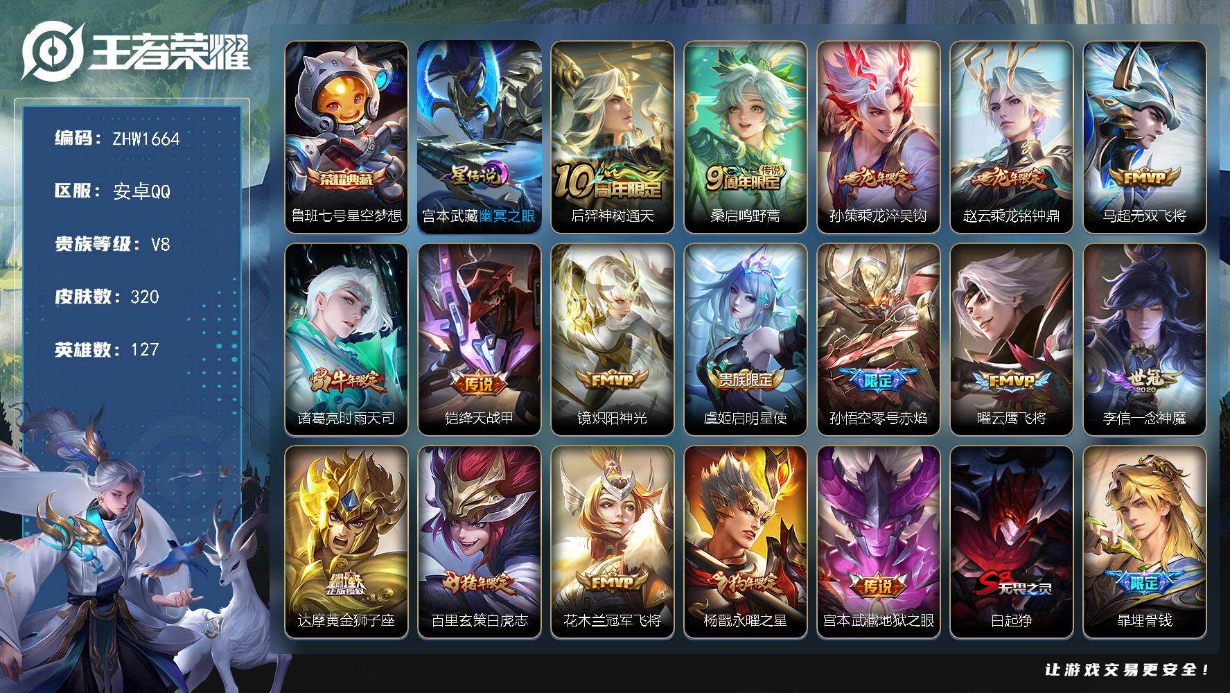 [14231788]【店主推荐捡漏号!可直接换绑】安卓Q-V8-最强王者段位-127英雄-320皮肤-1典藏皮肤-17传说-94史诗