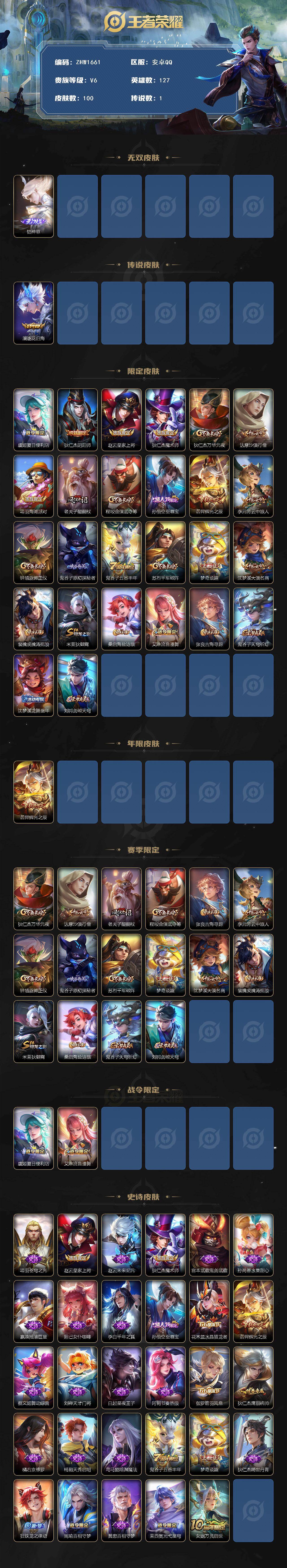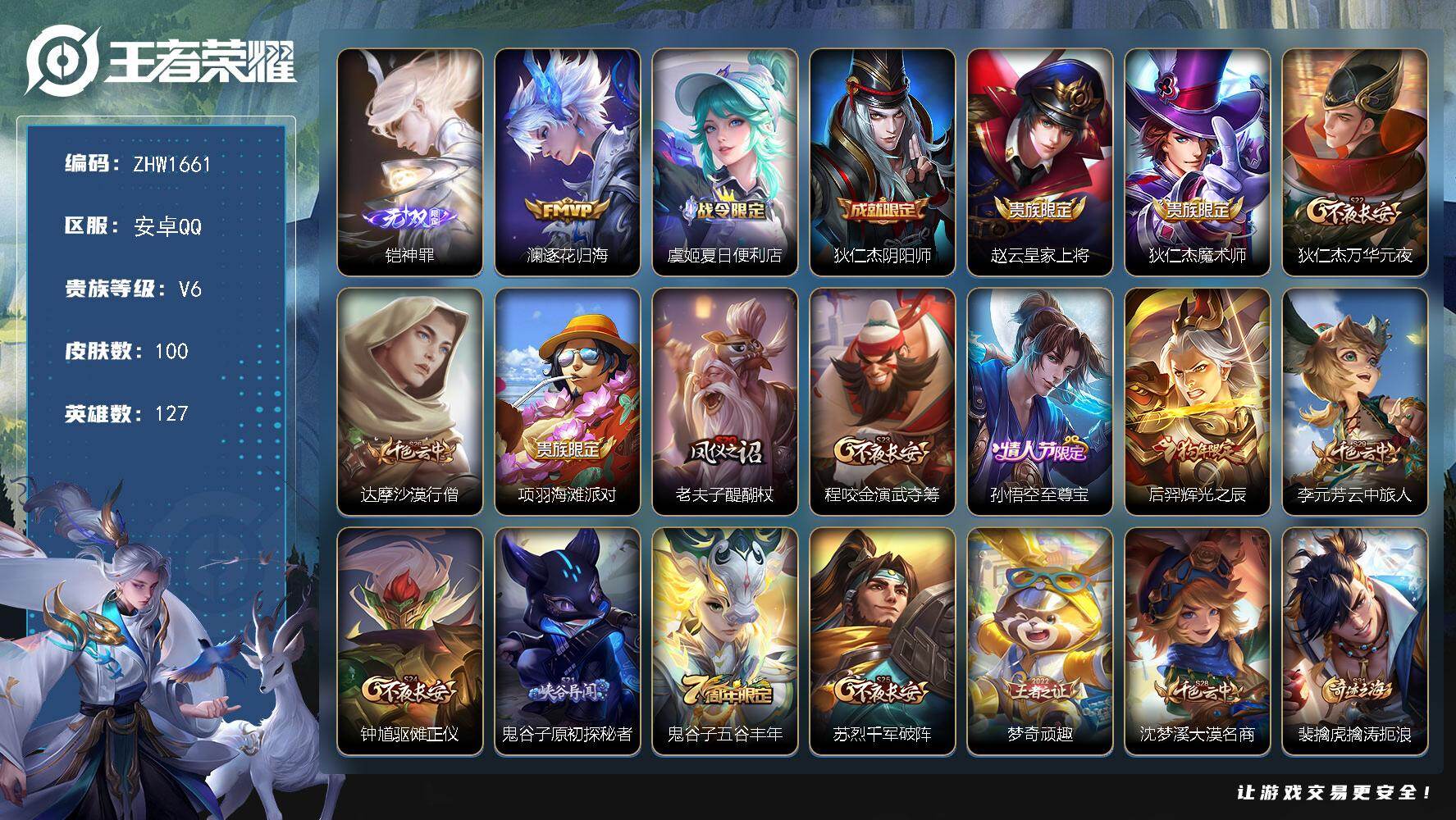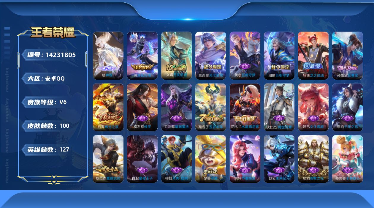 [14231805]有二次【店主推荐捡漏号!可直接换绑】安卓Q-V6-最强王者段位-127英雄-100皮肤-1无双-1传说-29史诗 【无双皮肤】:铠神罪 【传说皮肤】:澜逐花归海 【限定皮肤】:虞姬夏日便利店,狄仁杰阴阳师,赵云皇家上将,狄仁杰魔术师,狄仁杰万华元夜,达摩沙漠行僧,项羽海滩派对,老夫子醍醐杖,程咬金演武夺筹,孙悟空至尊宝,后羿辉光之辰,李元芳云中旅人,钟馗驱傩正仪,鬼谷子原初探秘者,鬼谷子五谷丰年,苏烈千军破阵,梦奇顽趣,沈梦溪大漠名商,裴擒虎擒涛扼浪,米莱狄御霄,桑启海盐诗旅,艾琳流音漫舞,张良古海寻踪,鬼谷子天穹祈灯,沈梦溪龙舞盛年,刘邦剑破天穹 【年限皮肤】:后羿辉光之辰 【赛季限定】:狄仁杰万华元夜,达摩沙漠行僧,老夫子醍醐杖,程咬金演武夺筹,张良古海寻踪,李元芳云中旅人,钟馗驱傩正仪,鬼谷子原初探秘者,苏烈千军破阵,梦奇顽趣,沈梦溪大漠名商,裴擒虎擒涛扼浪,米莱狄御霄,桑启海盐诗旅,鬼谷子天穹祈灯,刘邦剑破天穹 【战令限定】:虞姬夏日便利店,艾琳流音漫舞 【史诗皮肤】:项羽苍穹之光,赵云皇家上将,赵云未来纪元,狄仁杰魔术师,宫本武藏鬼剑武藏,孙尚香水果甜心,嬴政摇滚巨星,妲己女仆咖啡,李白千年之狐,孙悟空至尊宝,花木兰水晶猎龙者,后羿辉光之辰,蔡文姬舞动绿茵,刘禅天才门将,白起星夜王子,阿轲节奏热浪,伽罗箭羽风息,狄仁杰鹰眼统帅,橘右京修罗,杨戬天秀启明,司马懿暗渊魔法,鬼谷子五谷丰年,梦奇顽趣,狄仁杰绮世丹青,狂铁龙之律动,周瑜百相守梦,黄忠百相守梦,莱西奥光弋星穹,女娲万灵启世 【其他皮肤】:项羽海滩派对,韩信教廷特使,韩信街头霸王,孙膑天使之翼,亚瑟死亡骑士,花木兰兔女郎,甄姬花好人间,后羿阿尔法小队,狄仁杰阴阳师,刘备汉昭烈帝,王昭君幻想奇妙夜,米莱狄御霄,小乔丁香结,老夫子醍醐杖,鬼谷子原初探秘者,狄仁杰万华元夜,程咬金演武夺筹,盘古重装意志,钟馗驱傩正仪,苏烈千军破阵,达摩沙漠行僧,沈梦溪大漠名商,李元芳云中旅人,戈娅危途狂花,桑启海盐诗旅,裴擒虎擒涛扼浪,艾琳流音漫舞,张良古海寻踪,鬼谷子天穹祈灯,朵莉亚金色潮汐,廉颇功夫炙烤,沈梦溪龙舞盛年,刘邦剑破天穹,虞姬夏日便利店,白起死霸装,甄姬逆浪荇歌,云中君云械蓝图,孙策百相守梦,莱西奥踏浪烽翎,鬼谷子克喵,哪吒罗小黑战记,亚瑟荣光之誓,明世隐往忆晖光,张良罗小黑战记,艾琳鹤鸣心笺,曹操逐霄之志