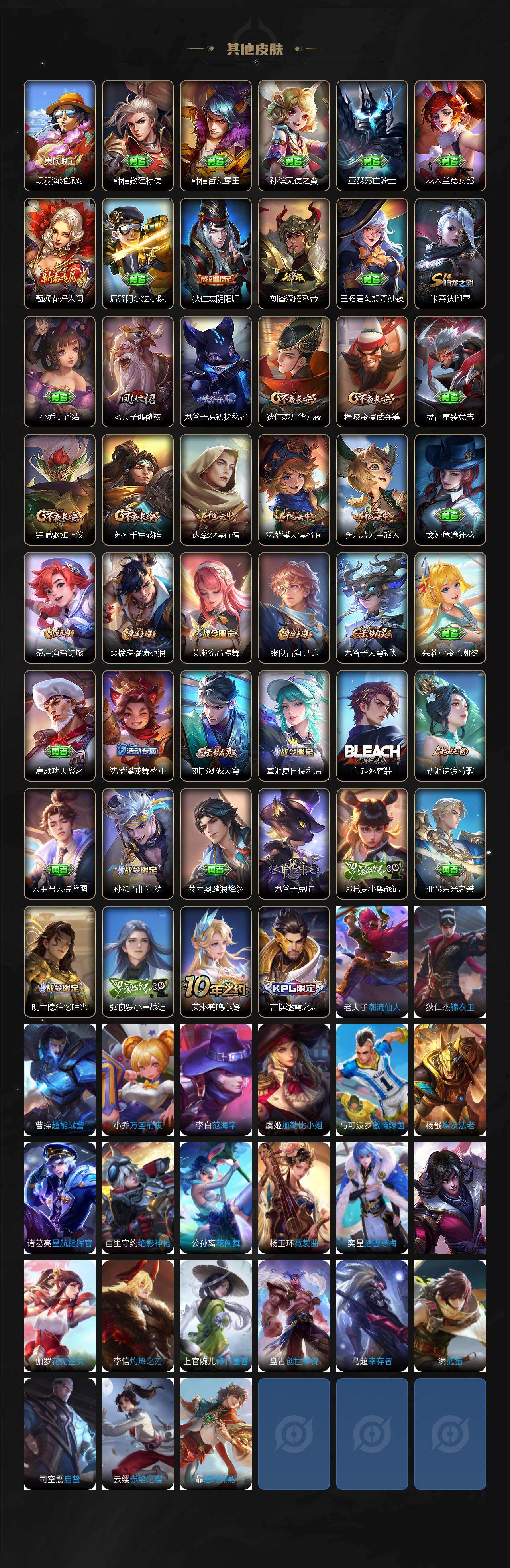 【其他皮肤】:项羽海滩派对,韩信教廷特使,韩信街头霸王,孙膑天使之翼,亚瑟死亡骑士,花木兰兔女郎,甄姬花好人间,后羿阿尔法小队,狄仁杰阴阳师,刘备汉昭烈帝,王昭君幻想奇妙夜,米莱狄御霄,小乔丁香结,老夫子醍醐杖,鬼谷子原初探秘者,狄仁杰万华元夜,程咬金演武夺筹,盘古重装意志,钟馗驱傩正仪,苏烈千军破阵,达摩沙漠行僧,沈梦溪大漠名商,李元芳云中旅人,戈娅危途狂花,桑启海盐诗旅,裴擒虎擒涛扼浪,艾琳流音漫舞,张良古海寻踪,鬼谷子天穹祈灯,朵莉亚金色潮汐,廉颇功夫炙烤,沈梦溪龙舞盛年,刘邦剑破天穹,虞姬夏日便利店,白起死霸装,甄姬逆浪荇歌,云中君云械蓝图,孙策百相守梦,莱西奥踏浪烽翎,鬼谷子克喵,哪吒罗小黑战记,亚瑟荣光之誓,明世隐往忆晖光,张良罗小黑战记,艾琳鹤鸣心笺,曹操逐霄之志