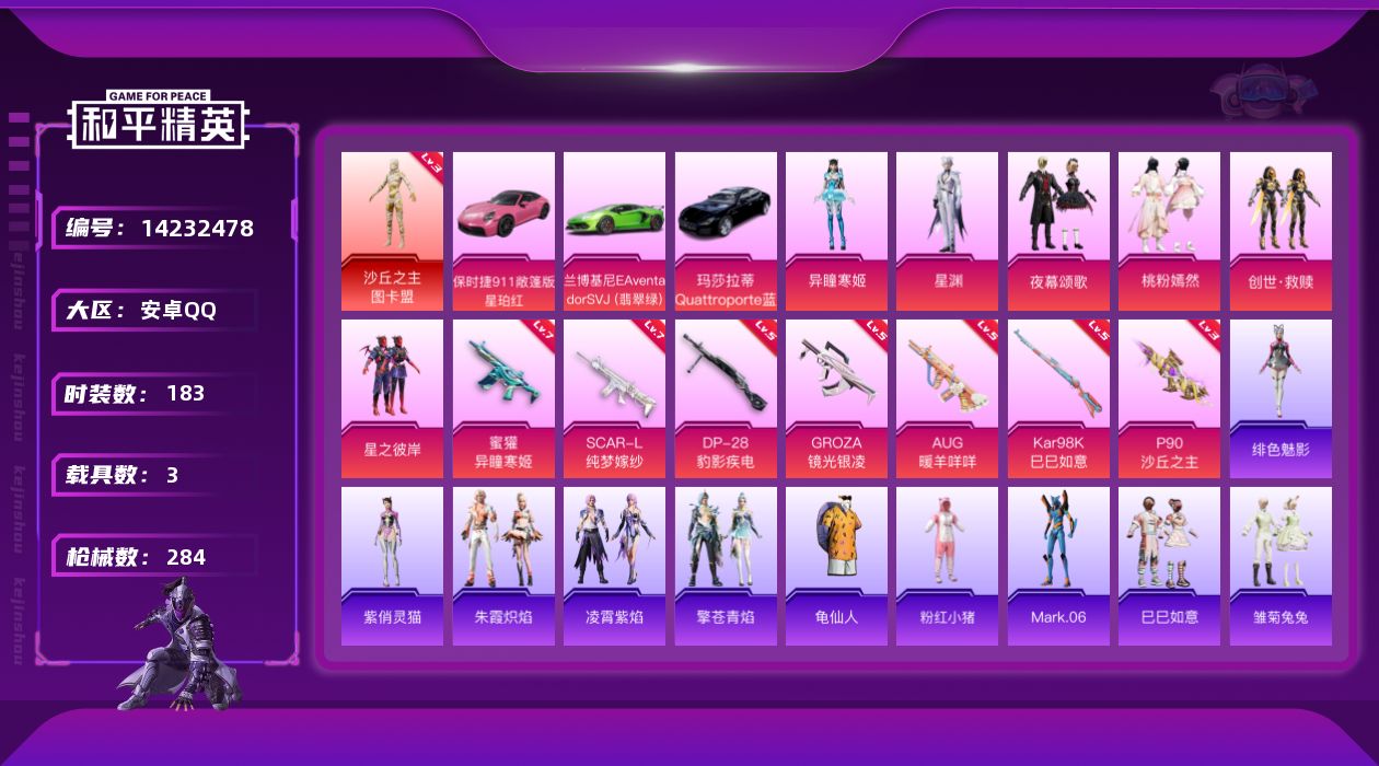 [14232478]【店主推荐捡漏号!可直接换绑】/素材身法号/地铁满天赋 安卓 手Q-1神装-6粉装-7特效枪-3载具-8粉色飞行器-9.4w热力值-14王牌印记-183套装-284枪皮【红色神装等级】:沙丘之主-图卡盟(三级)【热门品类】:套装-都市猎人,套装-奇异狩猎者,套装-龟仙人,套装-粉红小猪,角色-Mark.06【粉色载具】:兰博基尼Aventador SVJ(翡翠绿),玛莎拉蒂Quattroporte(夜幕蓝),保时捷911 敞篷版(星珀红)【粉色套装】:粉装-星之彼岸,粉装-夜幕颂歌,套装-创世·救赎,粉装-桃粉嫣然,角色-星渊,角色-异瞳寒姬【粉色枪皮等级】:SCAR-L-纯梦嫁纱(七级),GROZA-镜光银凌(五级),AUG-暖羊咩咩(五级),蜜獾-异瞳寒姬(七级),P90-沙丘之主(三级),Kar98K-巳巳如意(五级),DP-28-豹影疾电(五级)【粉色飞行器】:酣梦熊熊飞行器,闪光银龙飞行器,沙丘之主天马,幽焰列车飞行器,凤舞九天飞行器,万象金身飞行器,灵猫魔法师飞行器