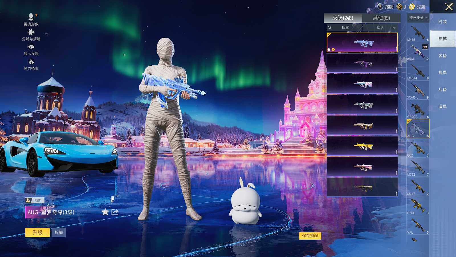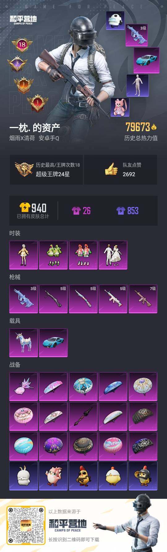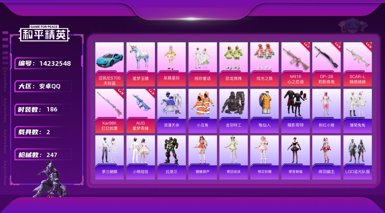 - PX_2064030- 安卓手Q-3王牌印记-5粉装-6特效枪-3载具-47327热力值-105套装-163枪皮-0卓越印记-0传奇印记 【5粉装】,梦幻火箭,桃粉嫣然,傲傲奶龙,俏皮狐尾,烟云彩露 【6特效枪】SCAR-L-锦绣绵绵-5级 M416-电玩时刻-5级 M762-青锋波束-5级 Kar98K-巳巳如意-5级 Kar98K-未来歌姬-4级 MG-36-幻彩电音-6级 【4稀有紫装】,