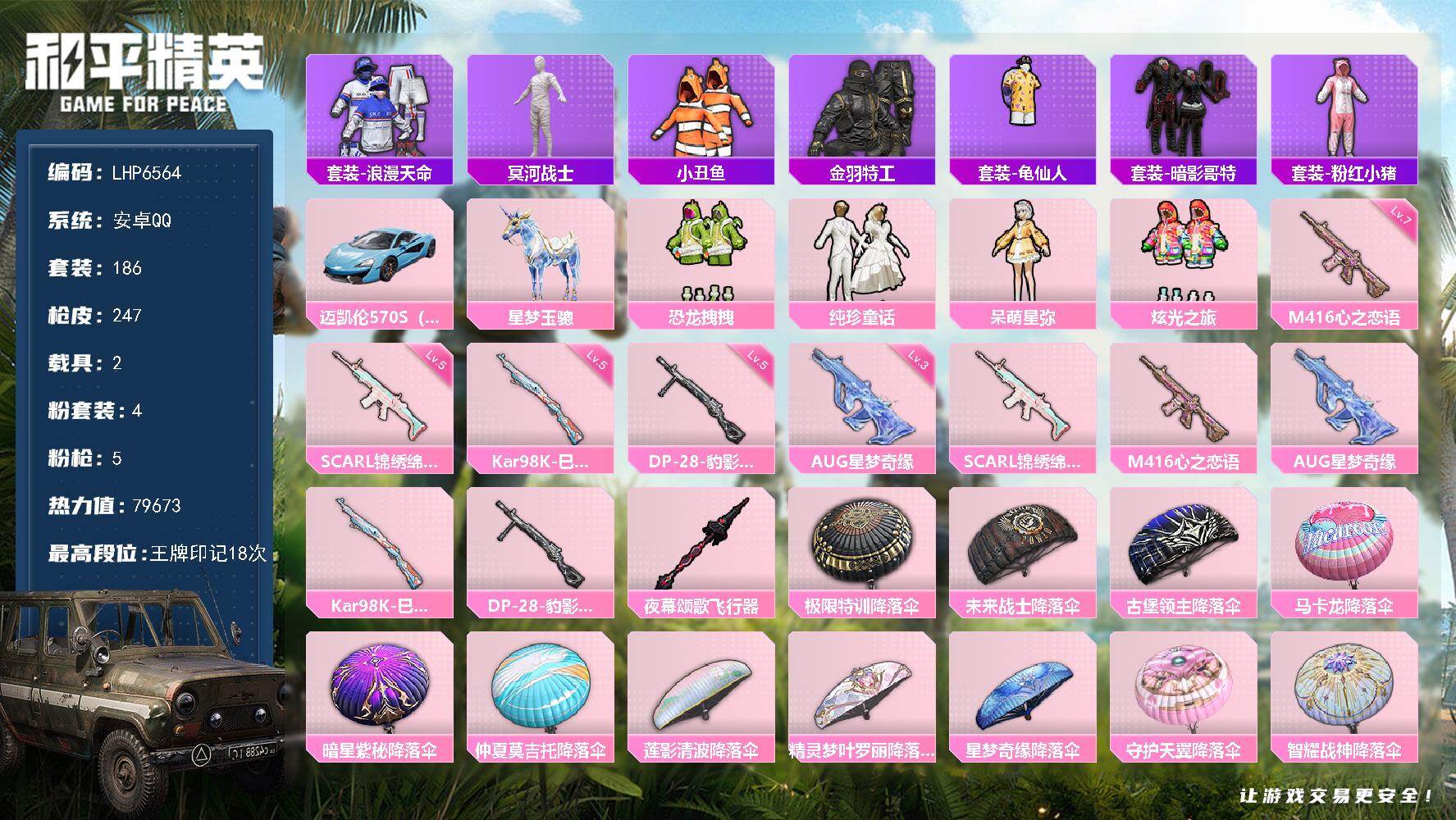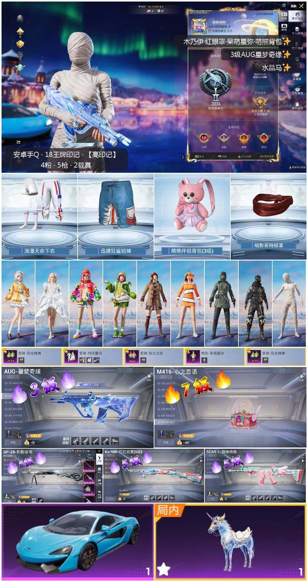 [14232548]【店主推荐捡漏号!可直接换绑】/素材身法号/绝世印记1/老木乃伊/地铁满天赋 安卓 手Q-4粉装-5特效枪-2载具-2粉色飞行器-7.9w热力值-18王牌印记-186套装-247枪皮【热门品类】:套装-浪漫天命,套装-冥河战士,套装-小丑鱼,套装-金羽特工,套装-龟仙人,套装-暗影哥特,套装-粉红小猪【粉色载具】:迈凯伦570S(天际蓝),星梦玉骢【粉色套装】:粉装-恐龙拽拽,粉装-纯珍童话,角色-呆萌星弥,粉装-炫光之旅【粉色枪皮等级】:SCAR-L-锦绣绵绵(五级),M416-心之恋语(七级),AUG-星梦奇缘(三级),Kar98K-巳巳如意(五级),DP-28-豹影疾电(五级)【粉色飞行器】:夜幕颂歌飞行器