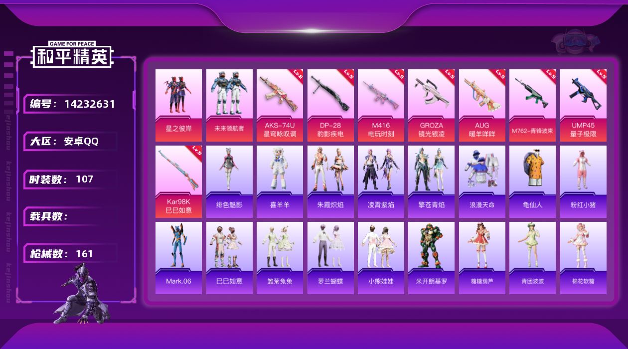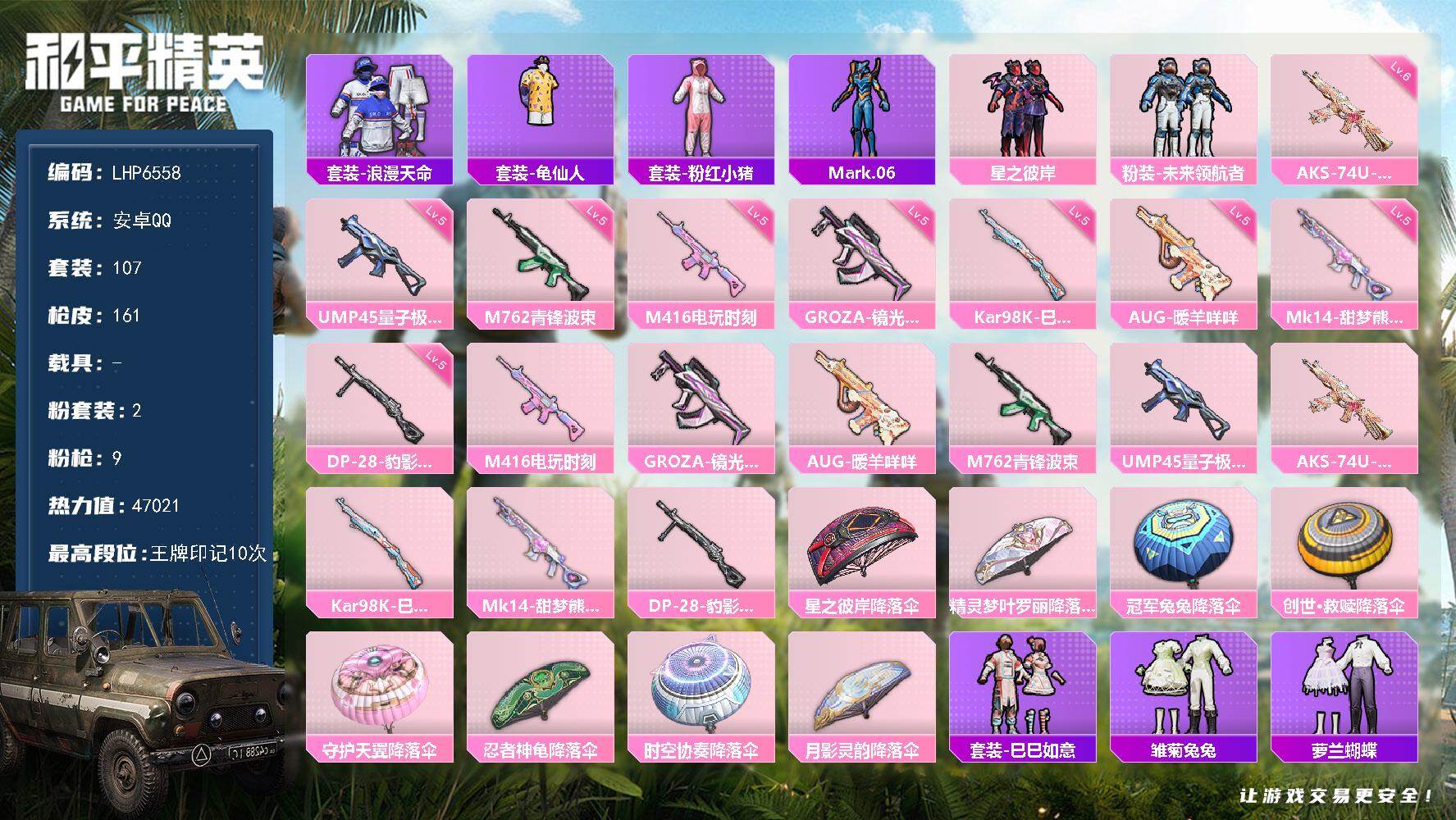 [14232631]可二次【店主推荐捡漏号!可直接换绑】/扭蛋碎片822 安卓 手Q-2粉装-9特效枪-4.7w热力值-10王牌印记-107套装-161枪皮【热门品类】:套装-浪漫天命,套装-龟仙人,套装-粉红小猪,角色-Mark.06【粉色套装】:粉装-星之彼岸,粉装-未来领航者【粉色枪皮等级】:M416-电玩时刻(五级),GROZA-镜光银凌(五级),AUG-暖羊咩咩(五级),M762-青锋波束(五级),UMP45-量子极限(五级),AKS-74U-星穹咏叹调(六级),Kar98K-巳巳如意(五级),Mk14-甜梦熊击(五级),DP-28-豹影疾电(五级)