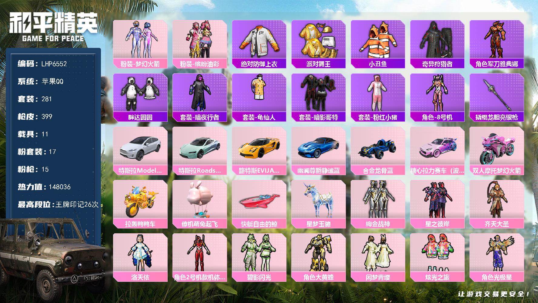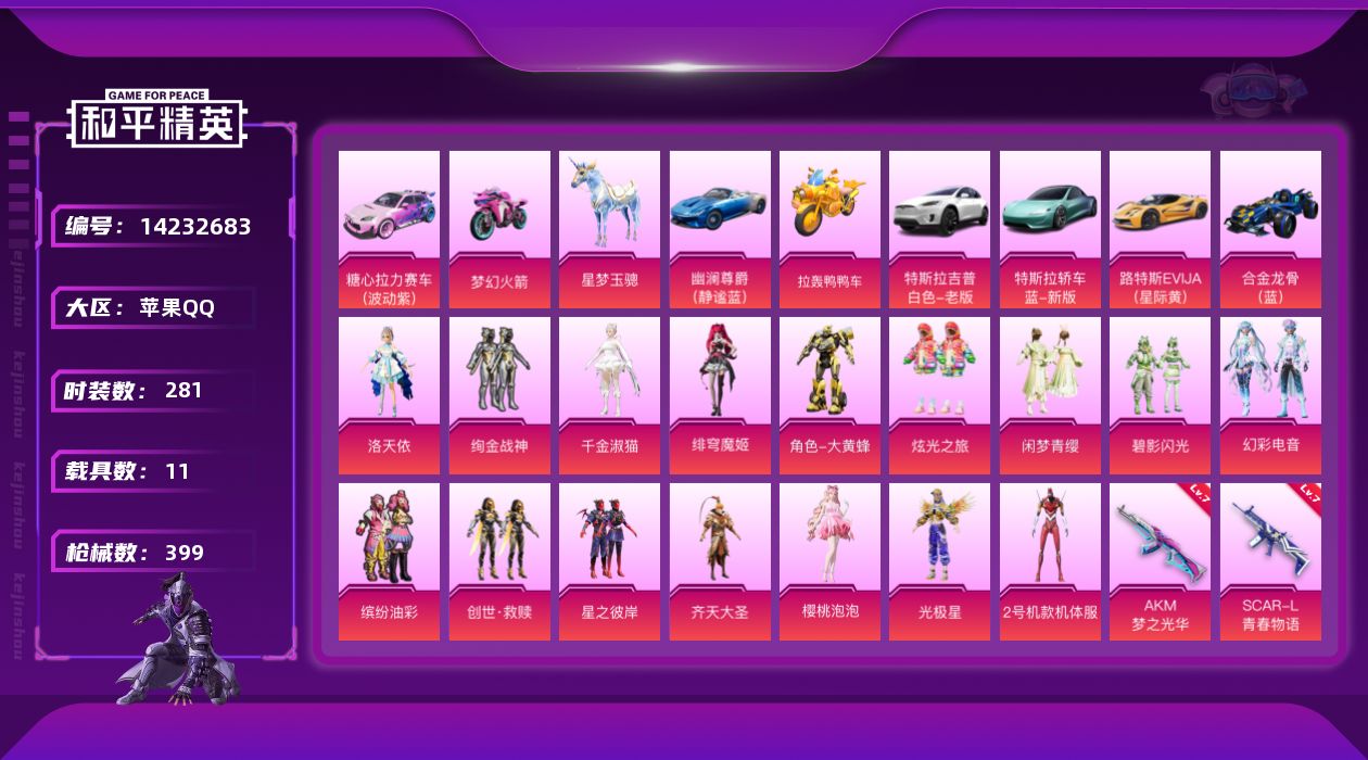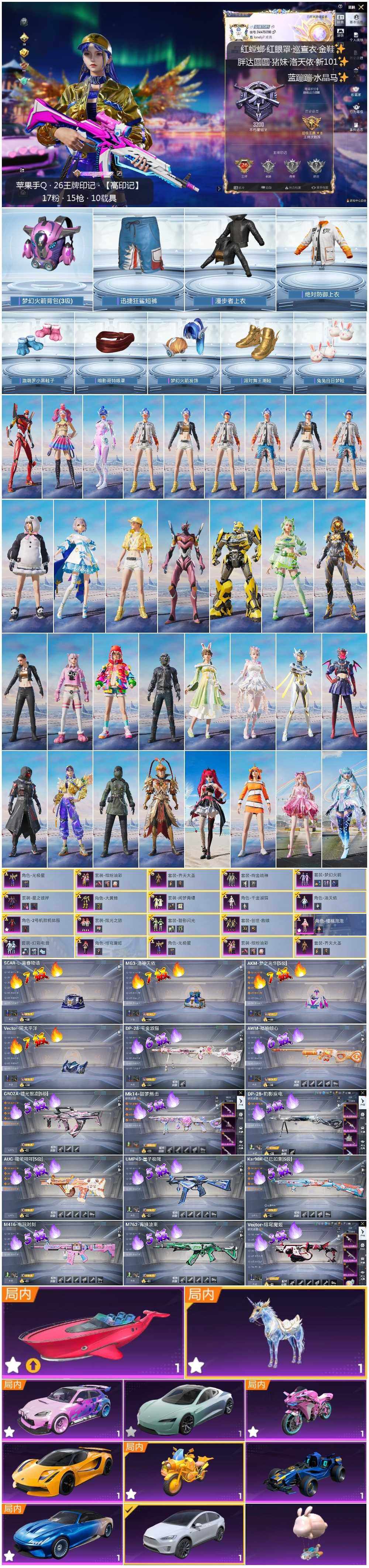[14232683]可二次【店主推荐捡漏号!可直接换绑】/素材身法号/地铁满天赋 苹果 手Q-17粉装-15特效枪-11载具-8粉色飞行器-14.8w热力值-26王牌印记-281套装-399枪皮【热门品类】:粉装-梦幻火箭,粉装-缤纷油彩,绝对防御上衣,套装-派对舞王,套装-小丑鱼,套装-奇异狩猎者,角色-军刀雅典娜,套装-胖达圆圆,套装-暗夜行者,套装-龟仙人,套装-暗影哥特,套装-粉红小猪,角色-8号机,撬棍-龙胆亮银枪【粉色载具】:特斯拉Model X(珍珠白),特斯拉Roadster(水滴蓝),路特斯EVIJA(星际黄),幽澜尊爵(静谧蓝),合金龙骨(蓝),糖心拉力赛车(波动紫),双人摩托-梦幻火箭,拉轰鸭鸭车,僚机-萌兔起飞,快艇-自由的鲸,星梦玉骢【粉色套装】:粉装-梦幻火箭,粉装-缤纷油彩,粉装-绚金战神,粉装-星之彼岸,粉装-齐天大圣,角色-洛天依,角色-2号机款机体服,粉装-碧影闪光,角色-大黄蜂,粉装-闲梦青缨,粉装-炫光之旅,角色-光极星,套装-创世·救赎,角色-千金淑猫,角色-樱桃泡泡,粉装-幻彩电音,角色-绯穹魔姬【粉色枪皮等级】:AKM-梦之光华(七级),SCAR-L-青春物语(七级),M416-电玩时刻(五级),GROZA-镜光银凌(五级),AUG-暖羊咩咩(五级),M762-青锋波束(五级),UMP45-量子极限(五级),Vector-环太平洋(七级),Vector-绯穹魔姬(三级),Kar98K-巳巳如意(五级),AWM-橘柚倾心(六级),Mk14-甜梦熊击(五级),DP-28-千金淑猫(六级),DP-28-豹影疾电(五级),MG3-洛神天依(七级)【粉色飞行器】:梦幻火箭飞行器,潮汐统领飞行器,齐天大圣飞行器,星夜魔法师飞行翼,镜域双华-灵镜之阶,龙翔九天飞行器