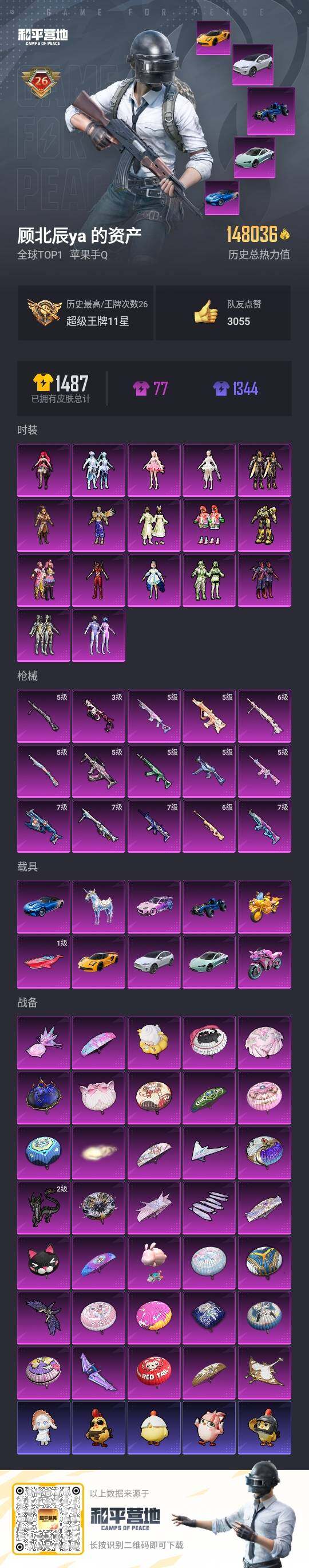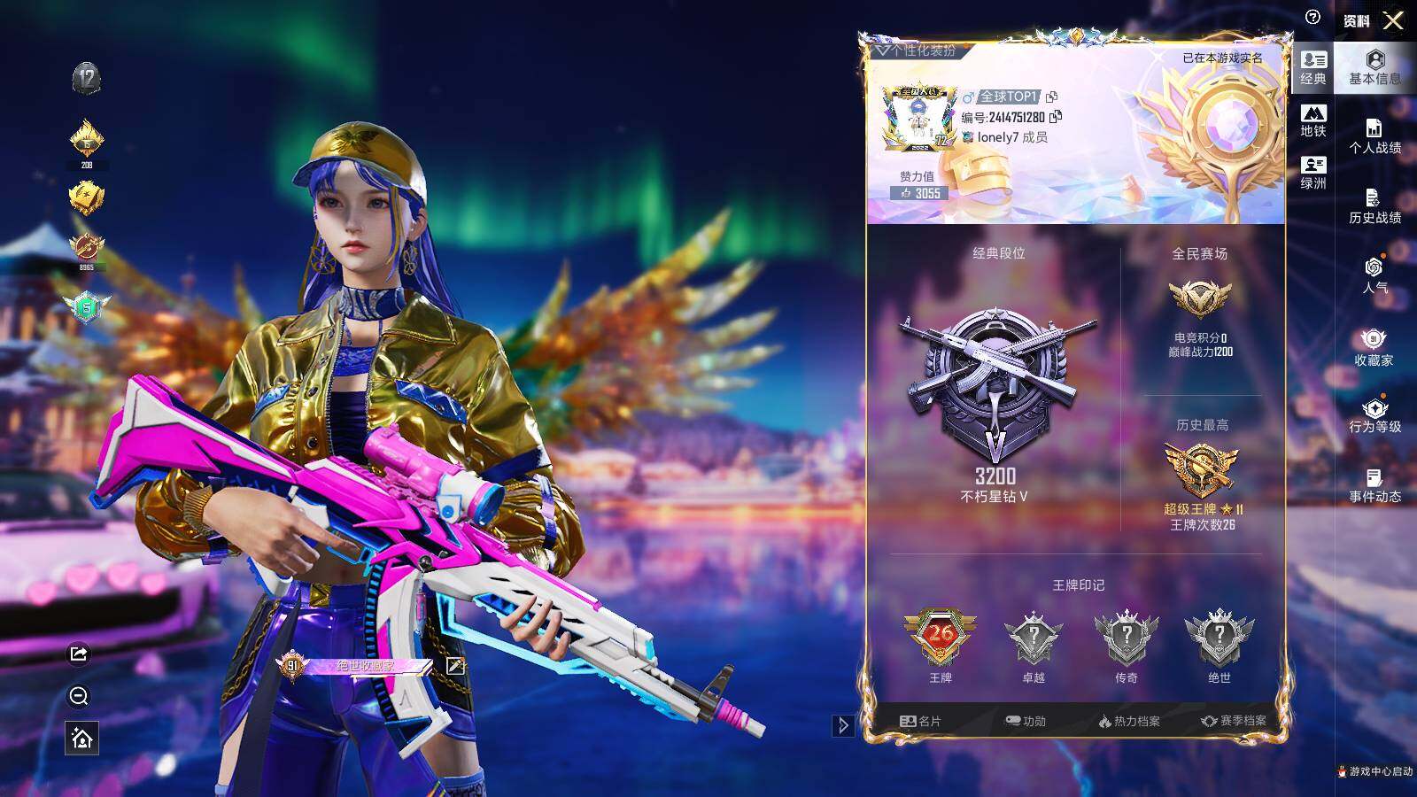 - [10716922]实名: 可修改 时装数: 784 载具数: 1 枪械数: 241 战备数: 168 热门装扮: 梦幻火箭(新101),浪漫波比,梦魇先生,锦绣火鲤,星之彼岸,蓝莓炮弹,太空嘟嘟,动感兔斯基,暗夜鎏金,莲影清波 载具: 兰博基尼URUS(明艳黄) 稀有枪皮: 黄金龙骨SCAR-L,MK14闲梦青缨,Kar98K-巳巳如意,DP-28-豹影疾电
