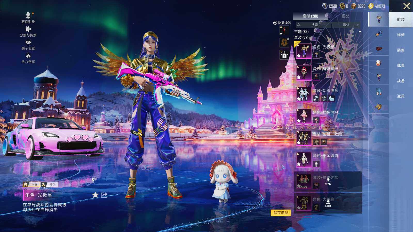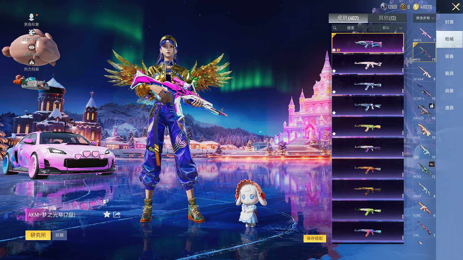 AKM-梦之光华,SCAR-L-青春物语,M416-电玩时刻,GROZA-镜光银凌,AUG-暖羊咩咩,M762-青锋波束,UMP45-量子极限,Vector-环太平洋,Kar98K-巳巳如意,AWM-橘柚倾心,DP-28-千金淑猫,MG3-洛神天依