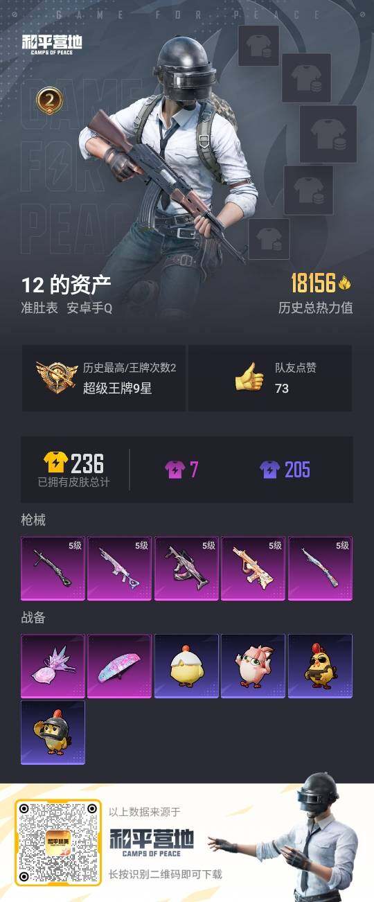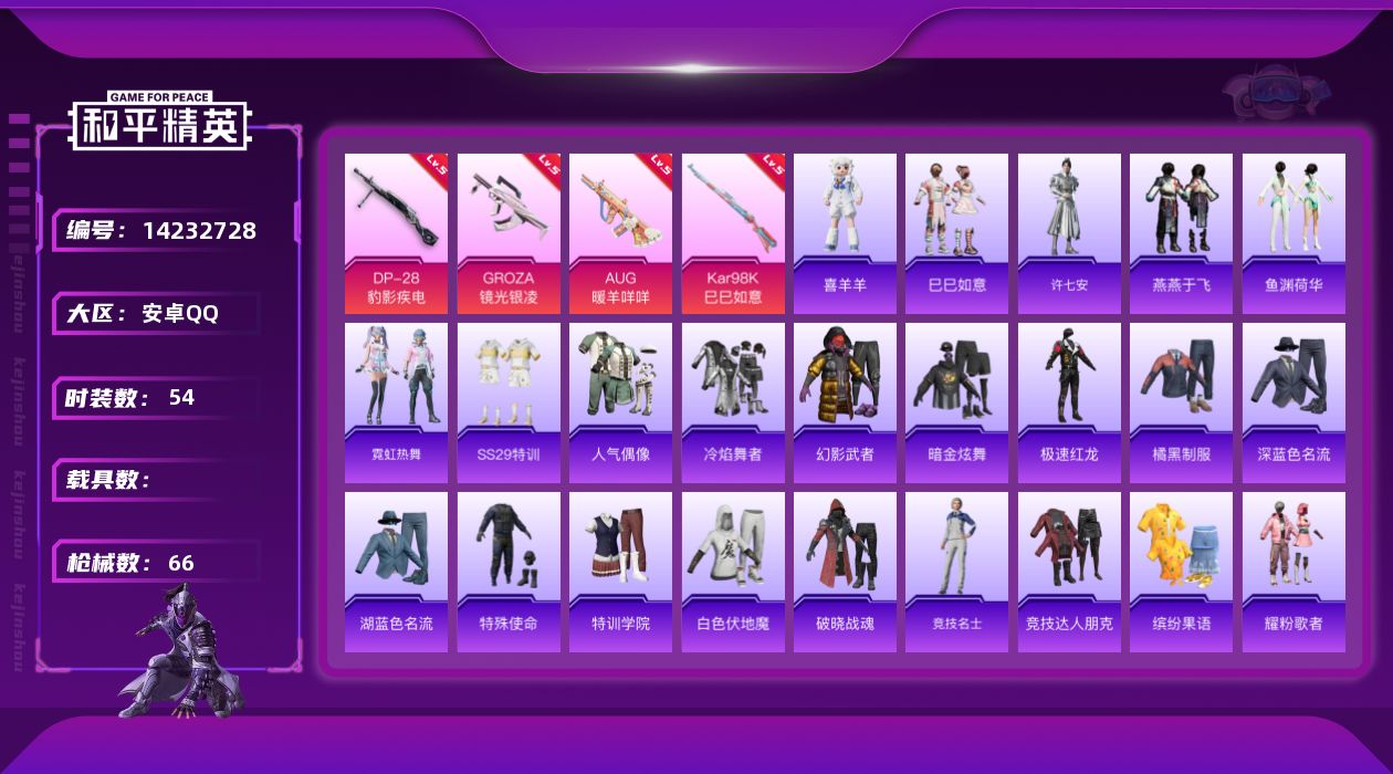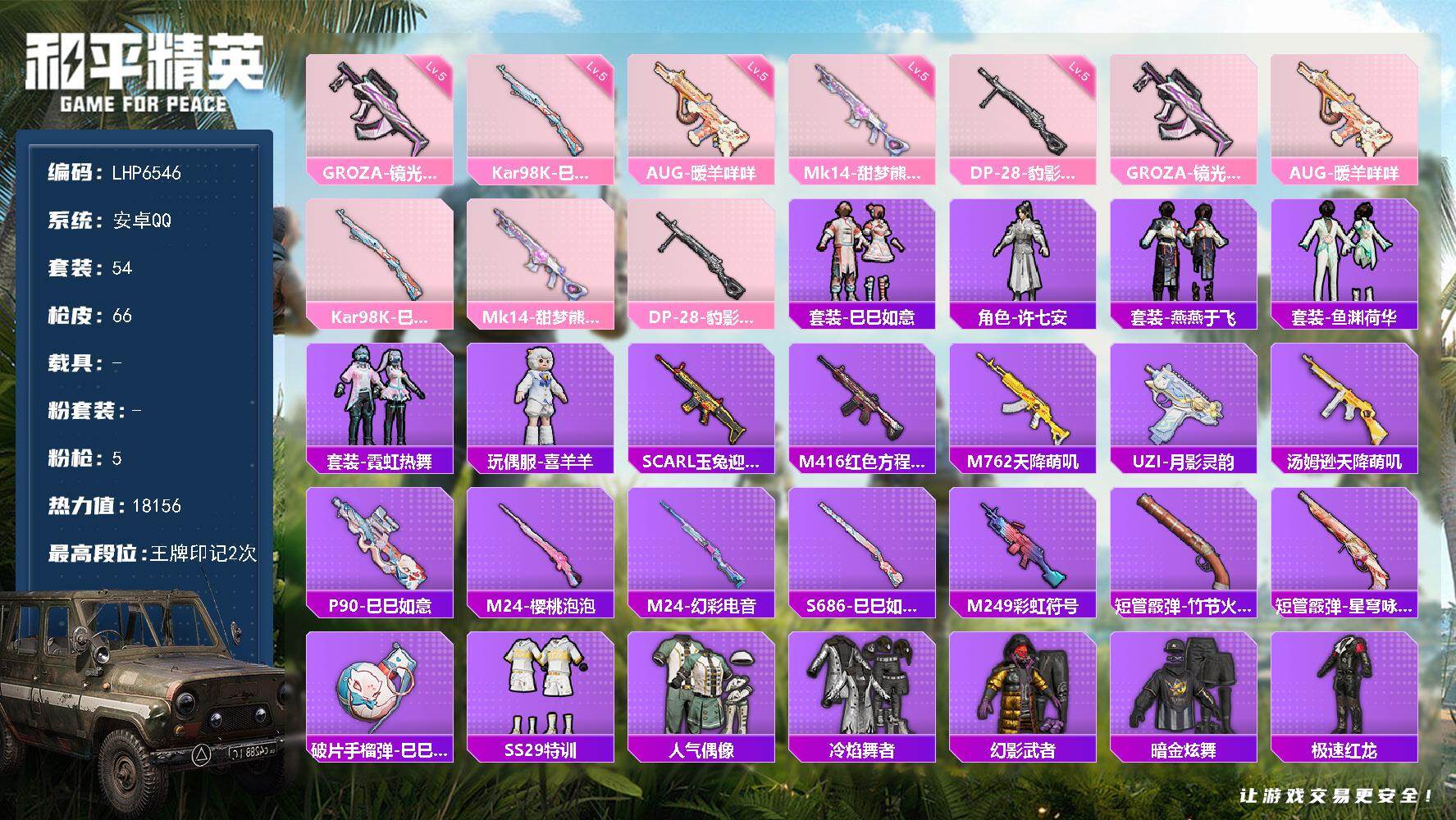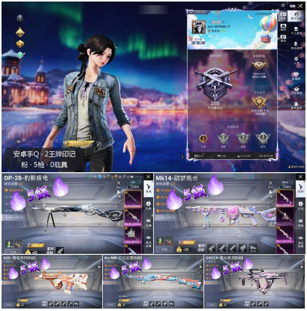 [14232728]【店主推荐捡漏号!可直接换绑】/地铁满天赋 安卓 手Q-5特效枪-1粉色飞行器-1.8w热力值-2王牌印记-54套装-66枪皮【粉色枪皮等级】:GROZA-镜光银凌(五级),AUG-暖羊咩咩(五级),Kar98K-巳巳如意(五级),Mk14-甜梦熊击(五级),DP-28-豹影疾电(五级)