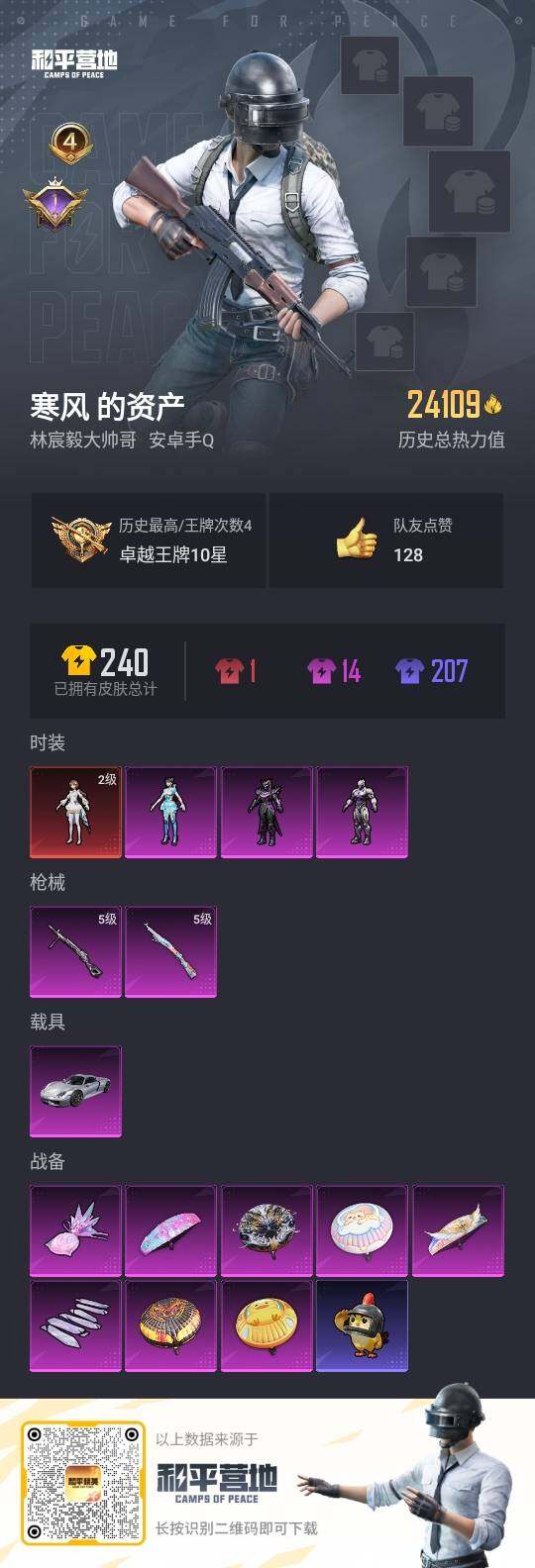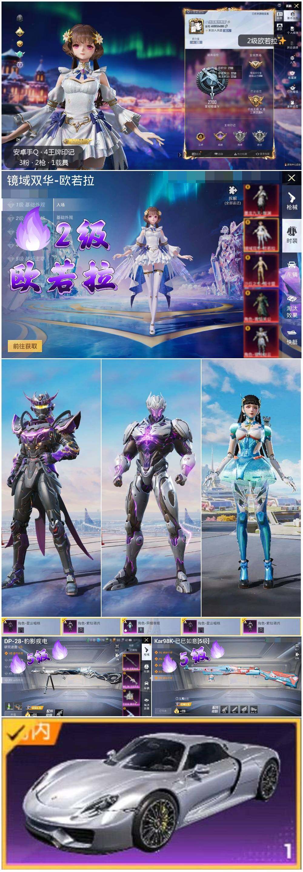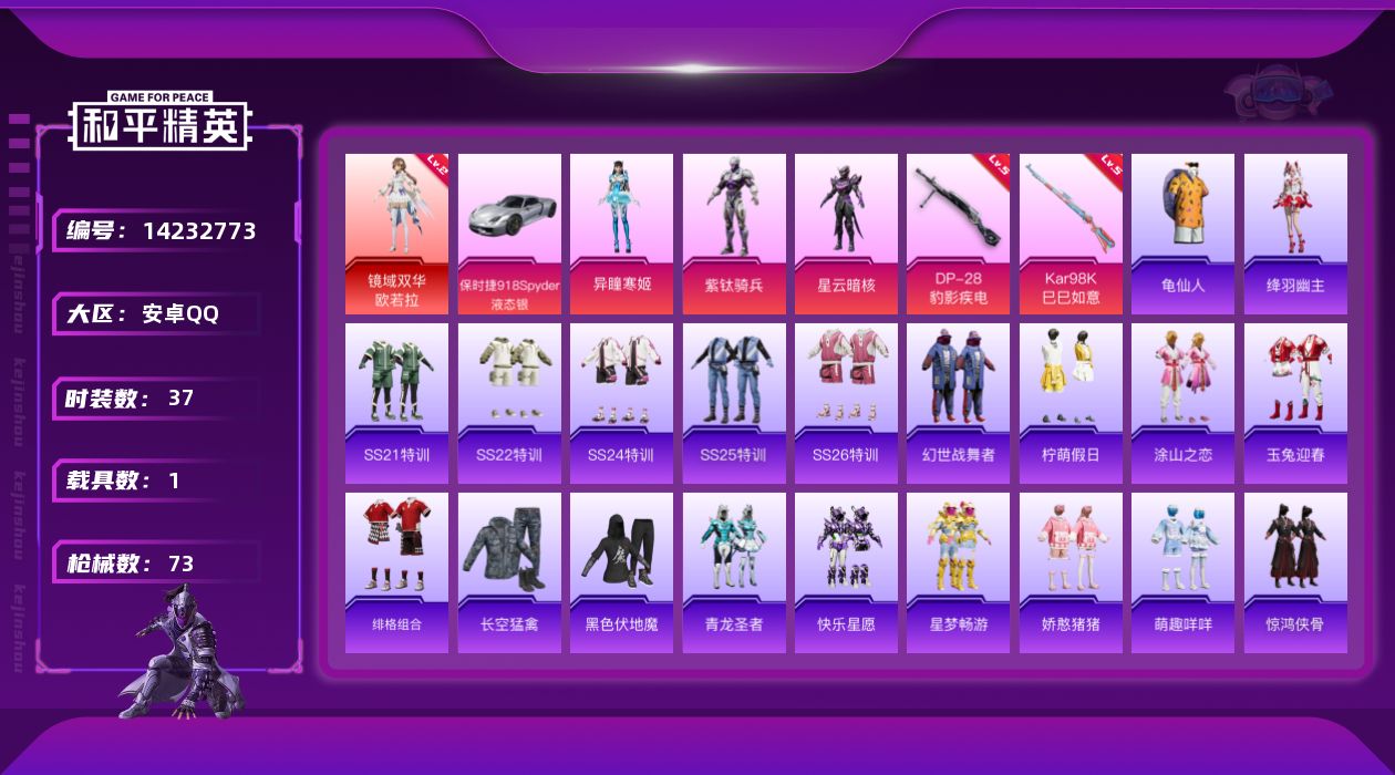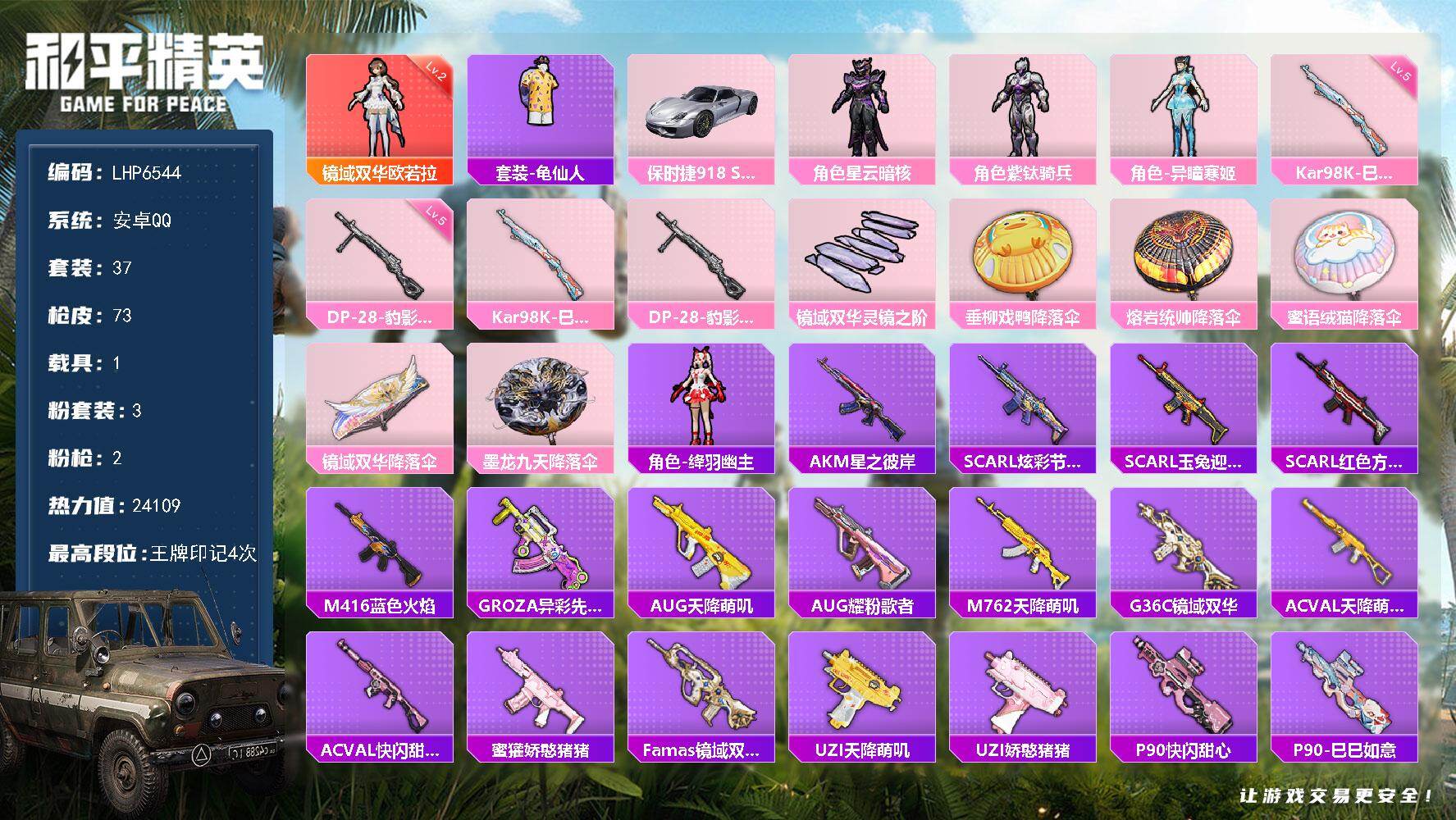 [14232773]可二次【店主推荐捡漏号!可直接换绑】/素材身法号 安卓 手Q-1神装-3粉装-2特效枪-1载具-2粉色飞行器-2.4w热力值-4王牌印记-37套装-73枪皮【红色神装等级】:镜域双华-欧若拉(二级)【热门品类】:套装-龟仙人【粉色载具】:保时捷918 Spyder(液态银)【粉色套装】:角色-星云暗核,角色-紫钛骑兵,角色-异瞳寒姬【粉色枪皮等级】:Kar98K-巳巳如意(五级),DP-28-豹影疾电(五级)【粉色飞行器】:镜域双华-灵镜之阶