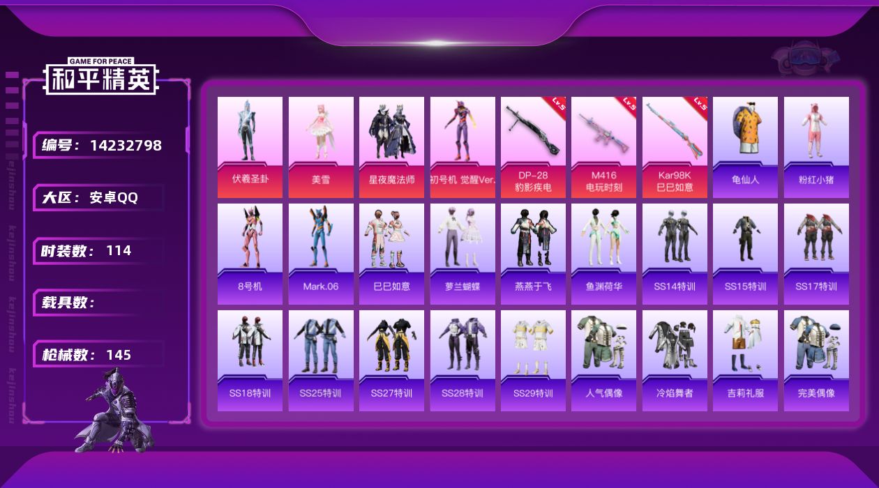[14232798]【店主推荐捡漏号!可直接换绑】 安卓 手Q-4粉装-3特效枪-1粉色飞行器-3.9w热力值-6王牌印记-114套装-145枪皮【热门品类】:套装-龟仙人,套装-粉红小猪,角色-8号机,角色-Mark.06【粉色套装】:粉装-星夜魔法师,角色-美雪,角色-初号机 觉醒Ver.,角色-伏羲圣卦【粉色枪皮等级】:M416-电玩时刻(五级),Kar98K-巳巳如意(五级),DP-28-豹影疾电(五级)【粉色飞行器】:深渊漩涡飞行器