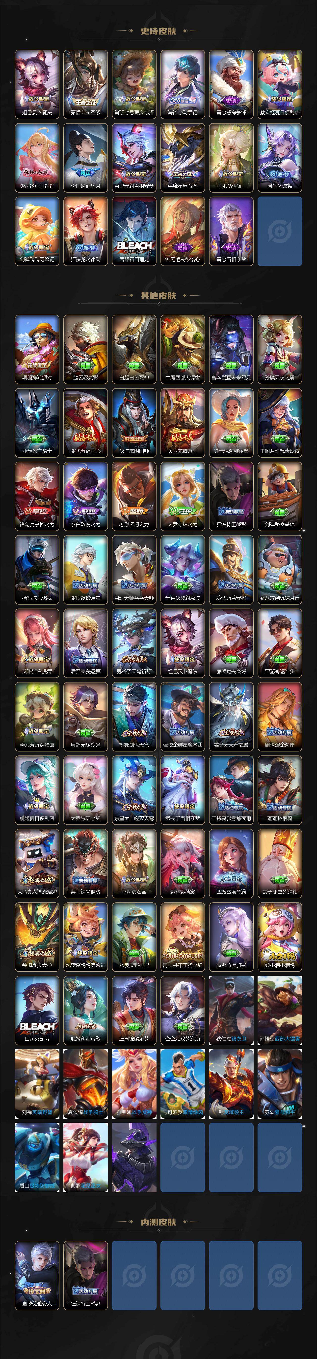 【史诗皮肤】:赵云皇家上将,狄仁杰魔术师,廉颇地狱岩魂,宫本武藏鬼剑武藏,孙尚香水果甜心,嬴政优雅恋人,嬴政暗夜贵公子,嬴政摇滚巨星,妲己魅力维加斯,妲己女仆咖啡,墨子金属风暴,曹操幽灵船长,李白千年之狐,吕布末日机甲,刘邦德古拉伯爵,亚瑟心灵战警,百里守约特工魅影,刘禅天才门将,白起星夜王子,狄仁杰鹰眼统帅,娜可露露晚萤,蒙犽狂想玩偶喵,西施诗语江南,杨戬天秀启明,妲己灵卜魔法,蒙恬荣光圣徽,鲁班七号蔬乡物语,海诺心动手记,黄忠怒海争锋,蔡文姬夏日便利店,少司缘涂山红红,李白谪仙醉月,百里守约百相守梦,牛魔星界战将,孙膑茶境仙,阿轲化蝶舞,刘禅鸭鸭历险记,狂铁龙之律动,后羿石田雨龙,钟无艳戍鼓铭心,黄忠百相守梦