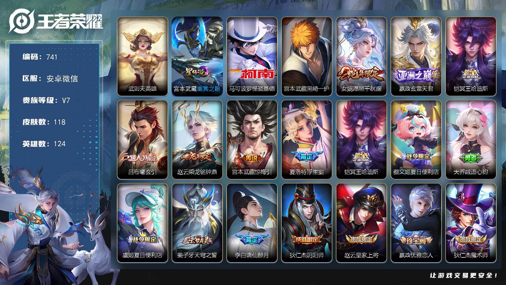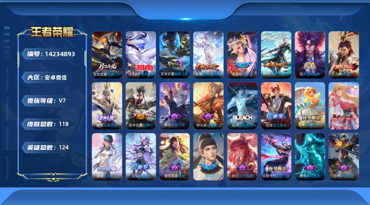 [14234893]安卓WX-124英雄-118皮肤-1典藏英雄-2珍品传说-7传说-40史诗