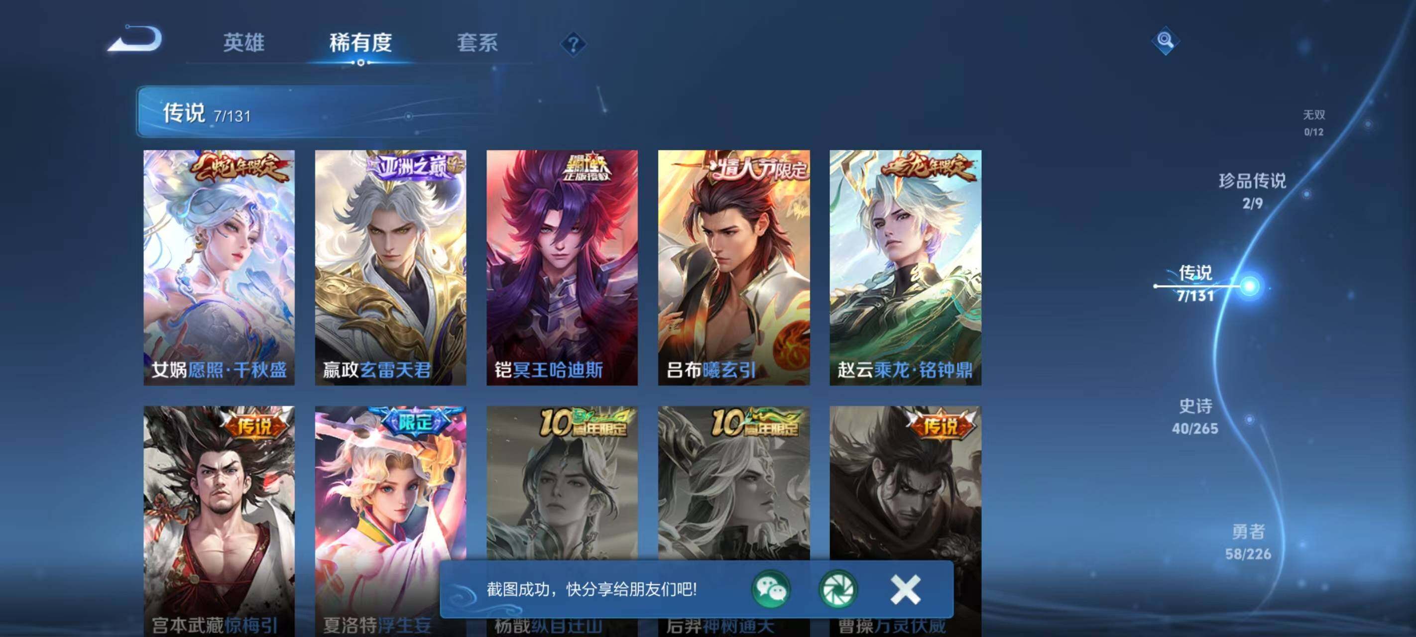 【传说皮肤】:女娲愿照千秋盛,嬴政玄雷天君,铠冥王哈迪斯,吕布曦玄引,赵云乘龙铭钟鼎,宫本武藏惊梅引,夏洛特浮生妄