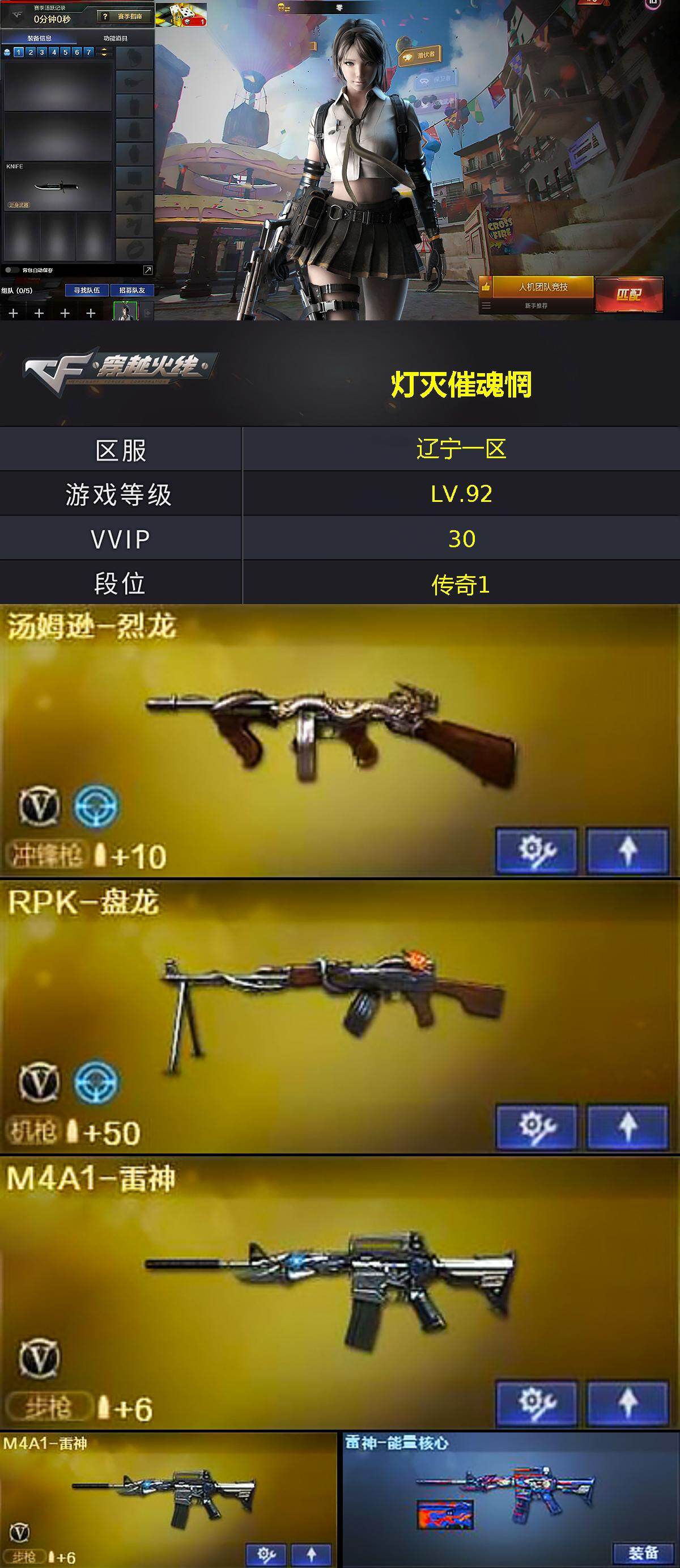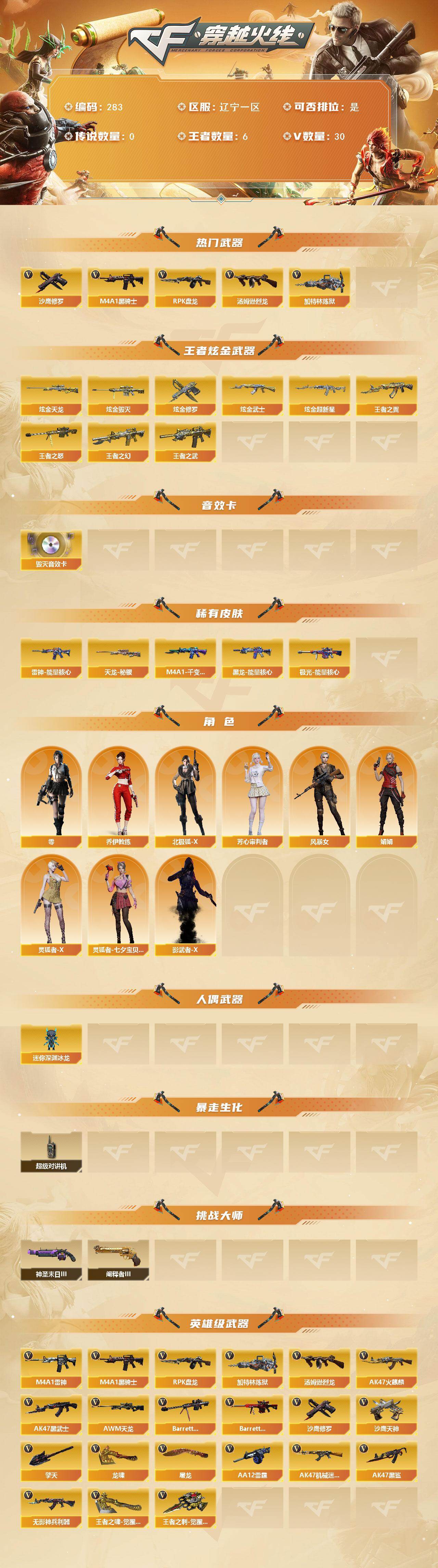 [14244218]辽宁一区-30V-6王者-6炫金 【热门武器】:M4A1-黑骑士*2,汤姆逊-烈龙,RPK-盘龙,加特林-炼狱*2,沙鹰-修罗 【王者炫金武器】:王者之幻,王者之翼,王者之武,王者之怒,炫金武士*2,炫金超新星,炫金毁灭,炫金天龙,炫金修罗 【音效卡】:Barrett-毁灭音效卡 【皮肤】:雷神-能量核心,M4A1-千变-孔明皮肤,黑龙-能量核心,天龙-秘银,极光-能量核心 【角色】:零,乔伊教练,北极狐-X,芳心审判者,风暴女*2,娟娟,灵狐者-X,灵狐者-七夕宝贝,影武者-X 【人偶武器】:迷你深渊冰龙 【暴走生化】:超级对讲机 【挑战大师】:神圣爆裂者-末日III,阐释者III 【英雄级武器】:AK47-火麒麟,M4A1-雷神*2,M4A1-黑骑士*2,AK47-黑武士,AK47-机械迷城*2,AK47-黑鲨,无影-神兵利器,AWM-天龙,Barrett-毁灭*2,Barrett-极光,RPK-盘龙,加特林-炼狱*2,汤姆逊-烈龙,AA-12-雷霆,沙鹰-修罗,沙鹰-天神,屠龙*2,龙啸*2,擎天,王者之啸-觉醒版,王者之刺-觉醒版 【道具】:云山科技背包,女皇终结者-魔龙之吻,救世主-黑桃战神,绿色巨人,灵魂忍者,迷雾幽灵,夺命之镰,防化服*3,金色流光-枪王排位,动感闪耀表情,C4-沙漠,防弹头盔*4,防弹衣*4,C4工具钳*4,手雷包*4 【特殊枪械】:2黑骑士,1烈龙,1盘龙,2炼狱
